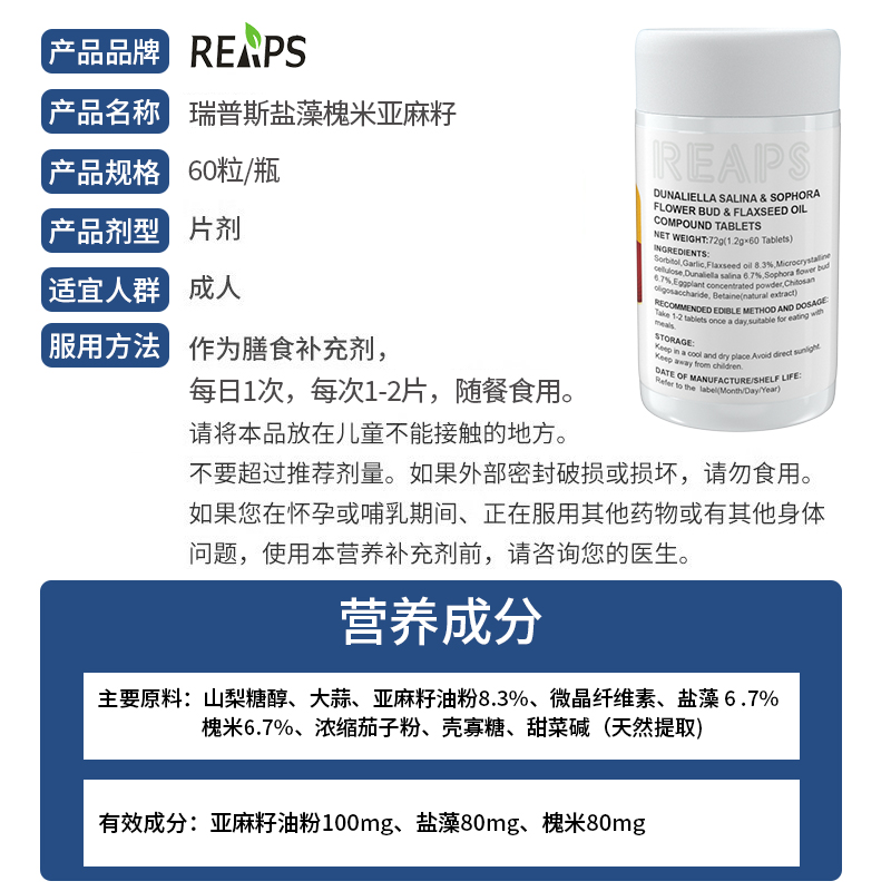Reaps 瑞普斯 盐藻槐米亚麻籽复合片 60片/瓶