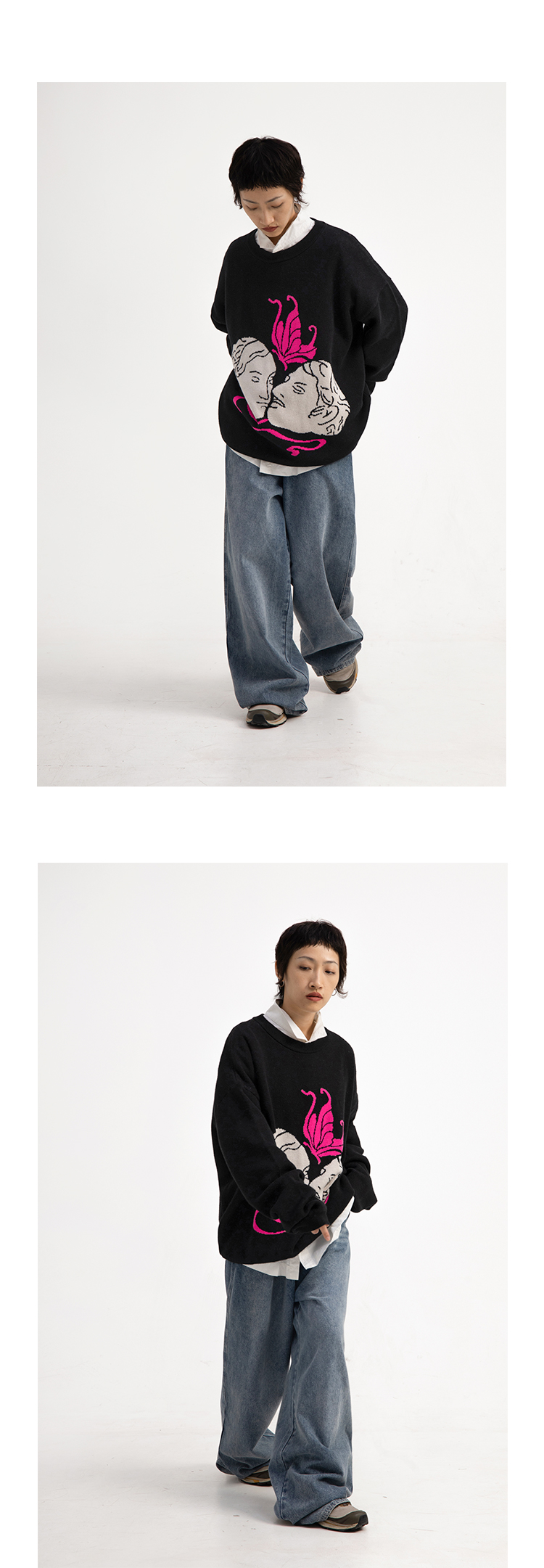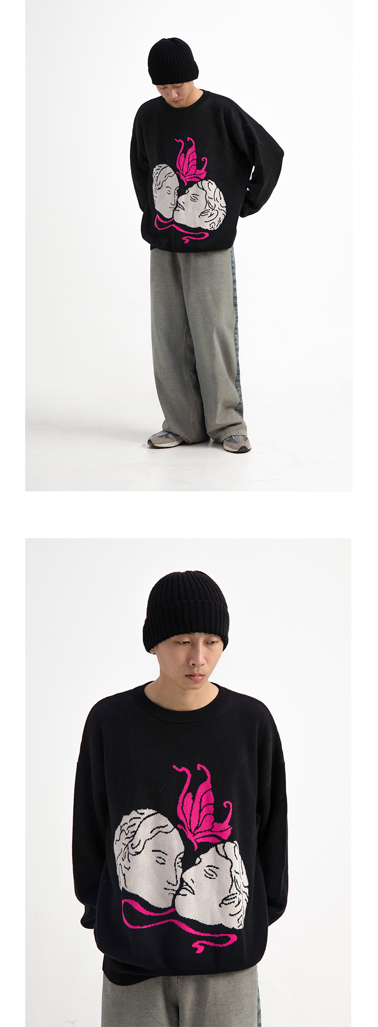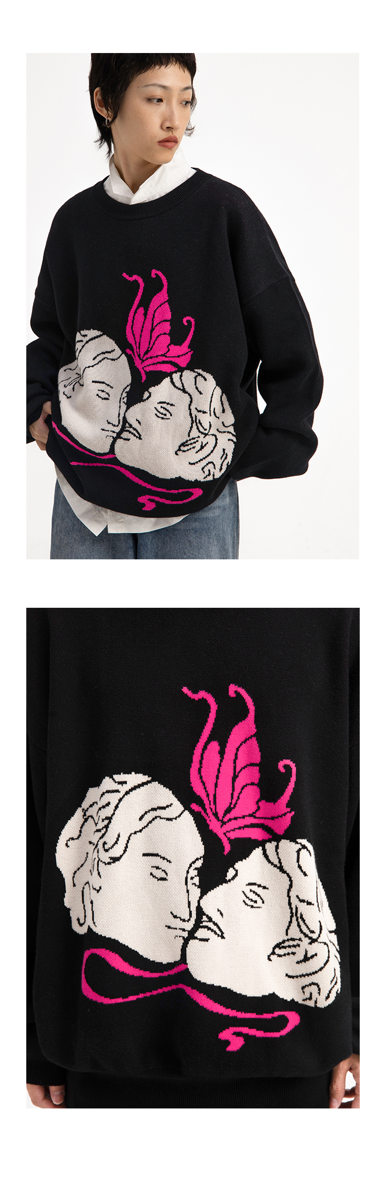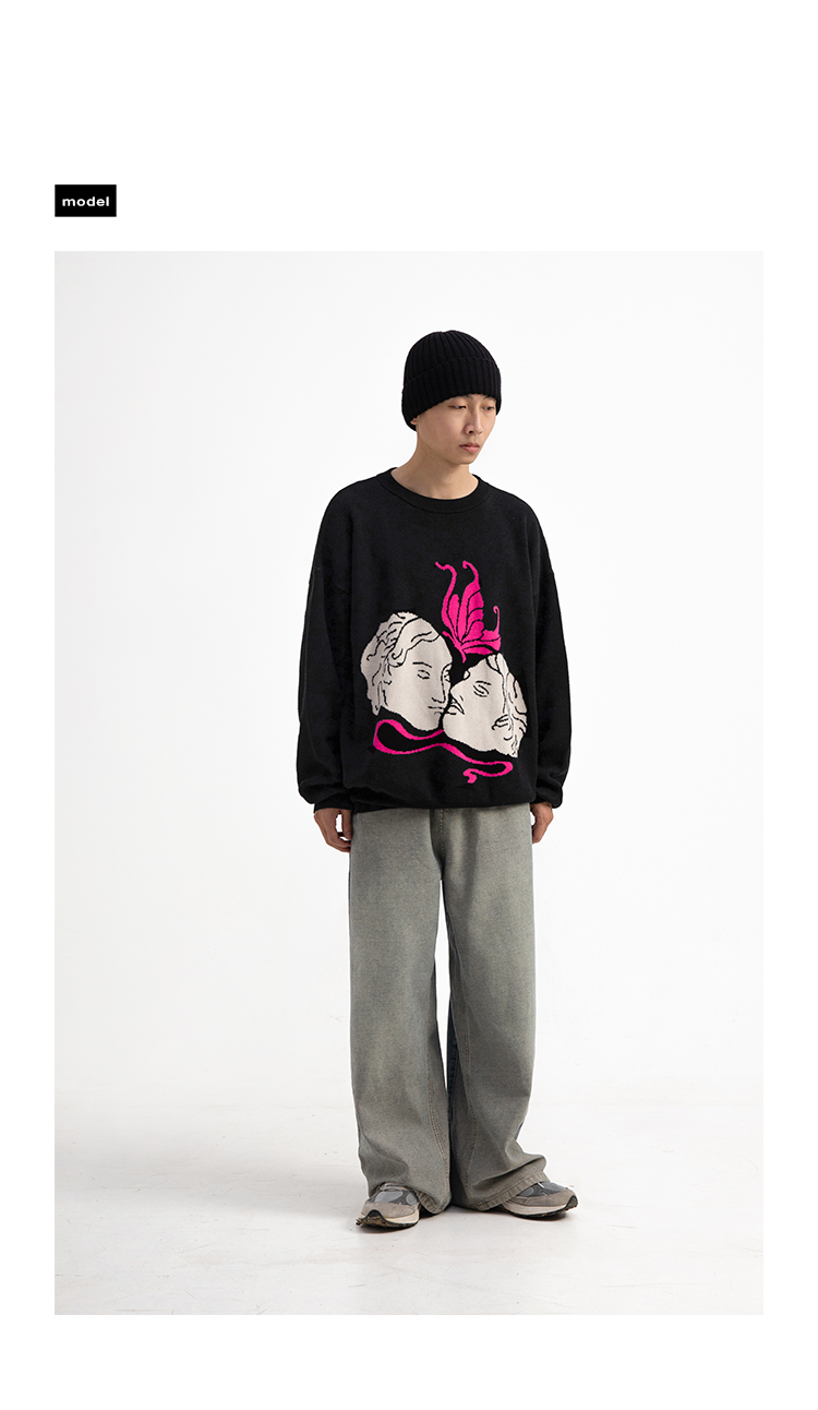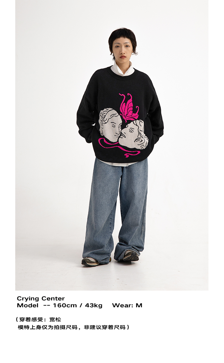 CryingCenter 恋人间的粉色蝴蝶 好穿粉白色印花黑毛衣 哭喊中心
