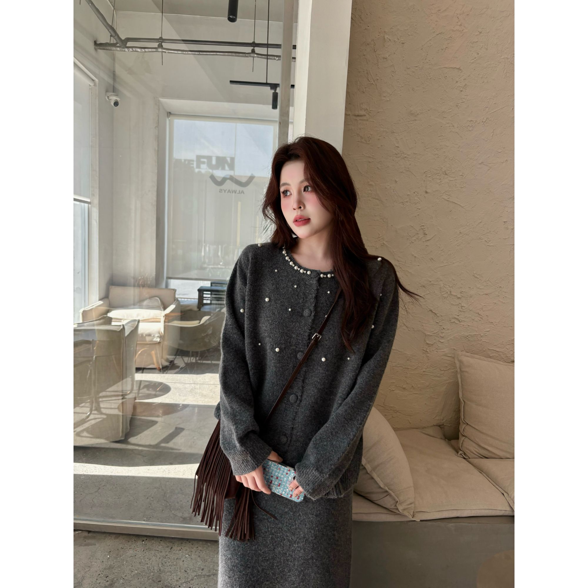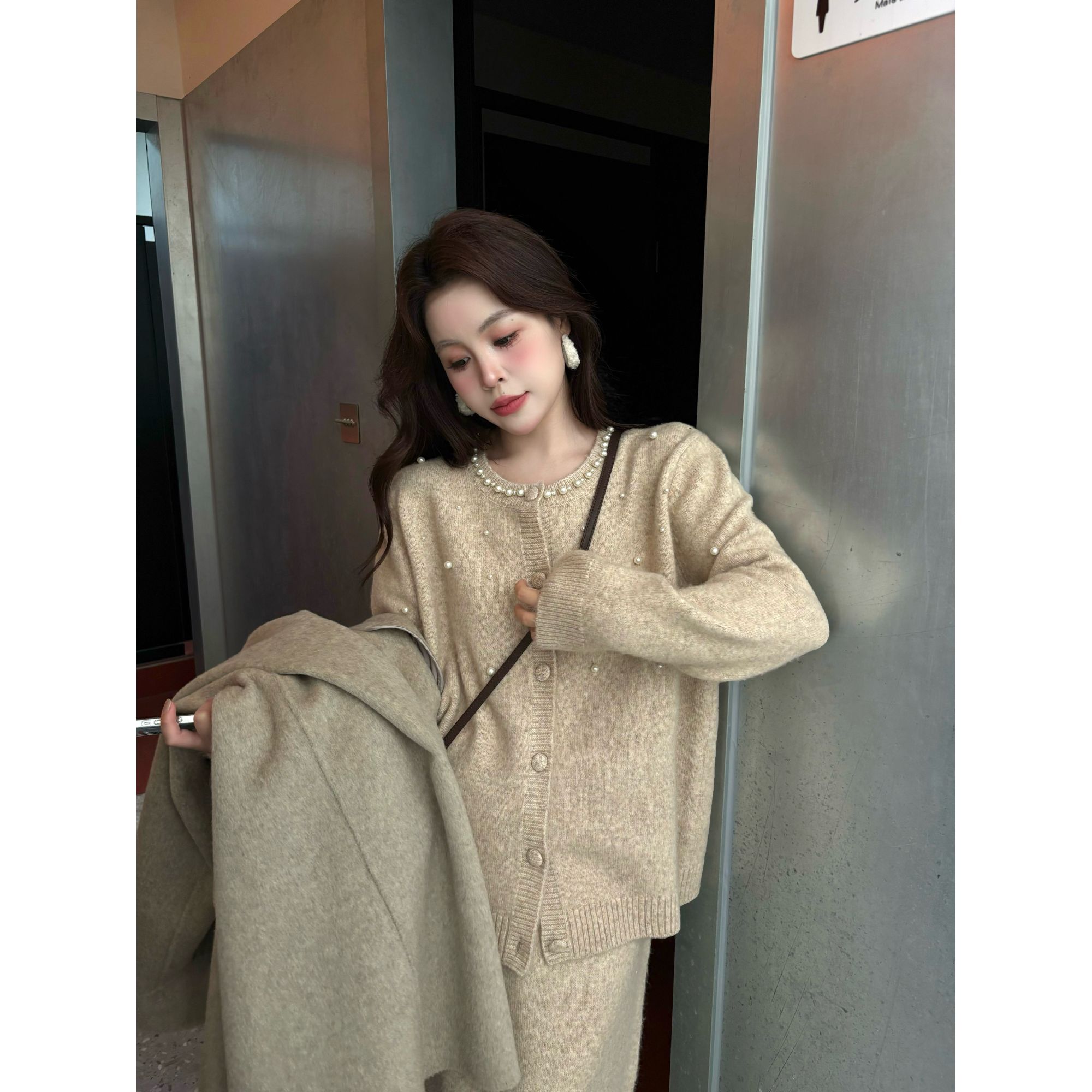 25AW上新 甜甜同款【奶霜珍珠】小香风钉珠针织毛衣开衫+垂感直筒半身裙