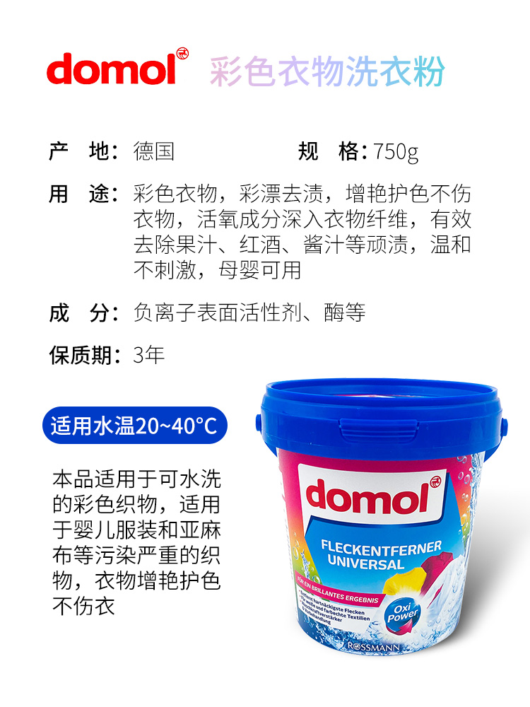 德国进口Domol彩色衣物去污亮白粉彩漂洗衣粉750g/桶