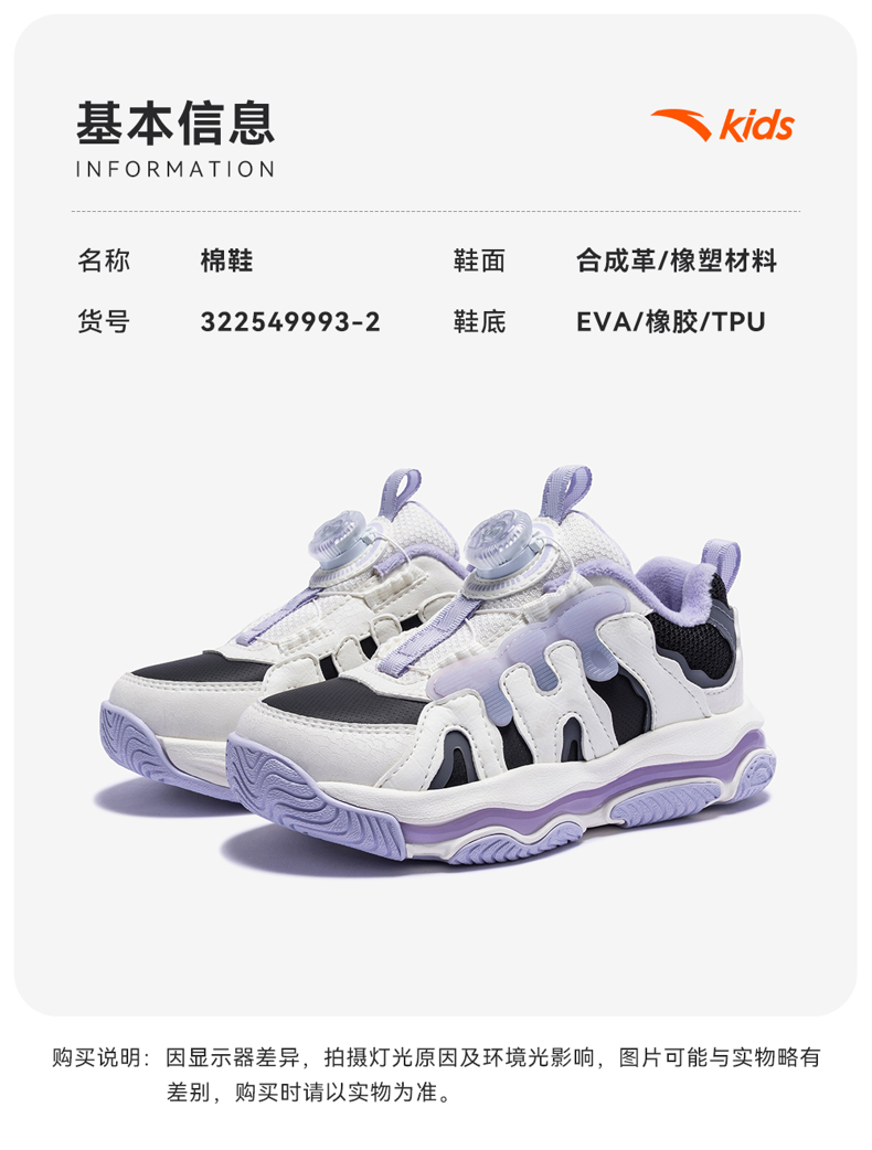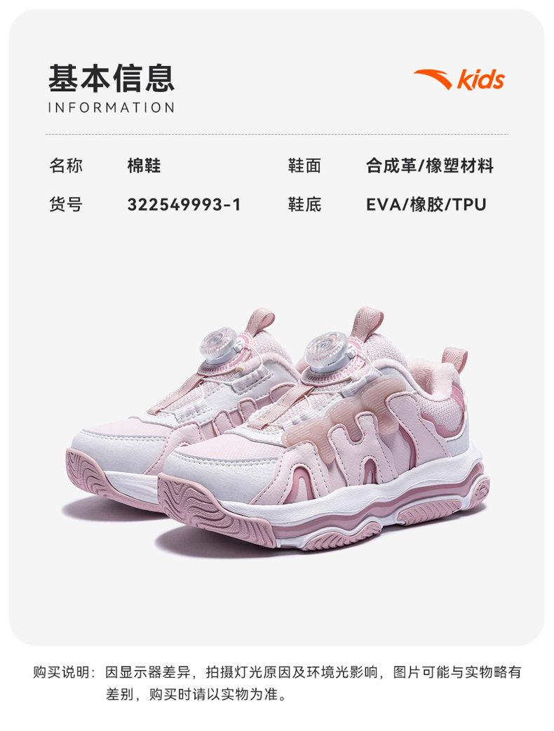 布朗尼加绒安踏儿童女小童棉鞋2025冬款上新舒适保暖儿童旋钮童鞋322549993