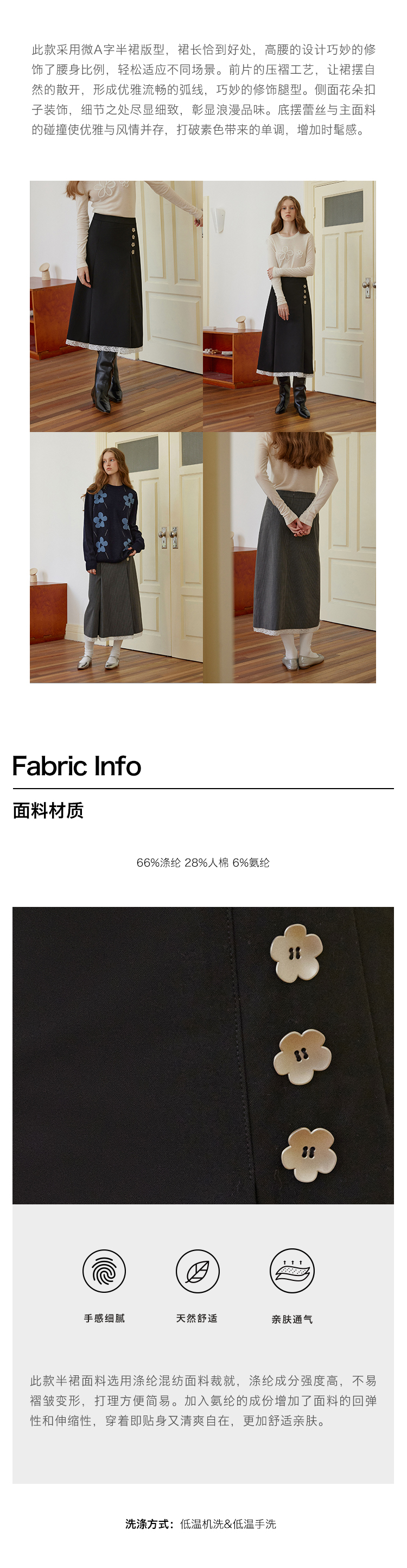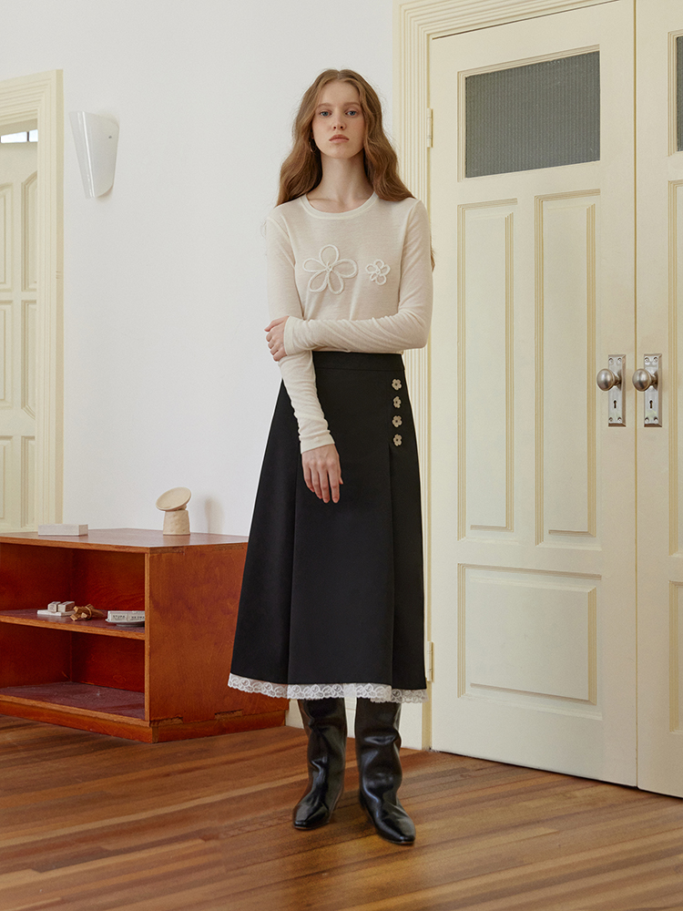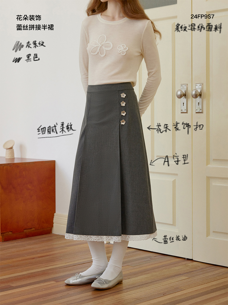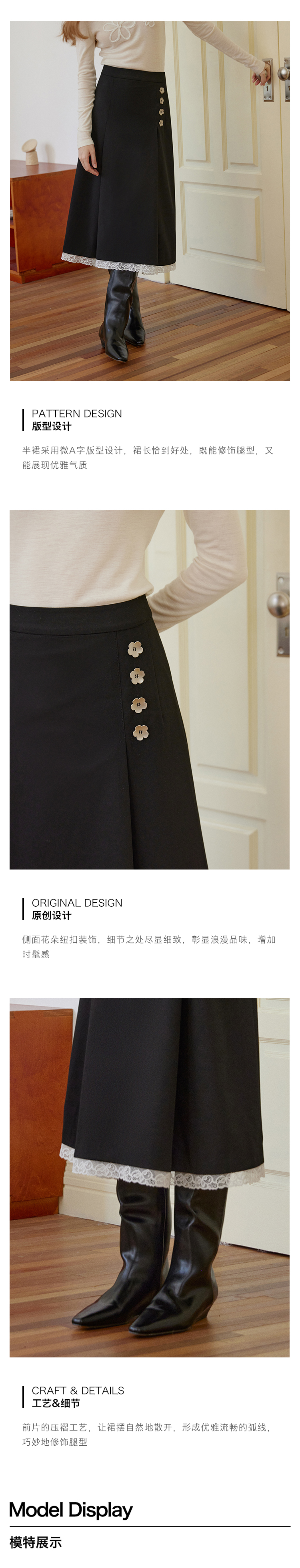 ForPoem 现货 24/FW原创设计花朵装饰直筒蕾丝拼接半身裙