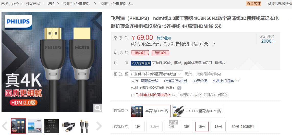 PHILIPS/飞利浦SWL6116/93 HDMI高清线2.0版 工程级4K/8K60HZ数字高清线