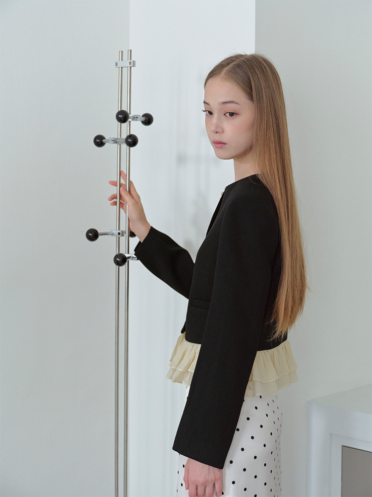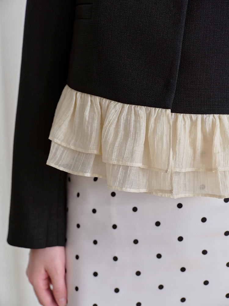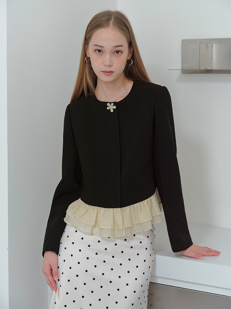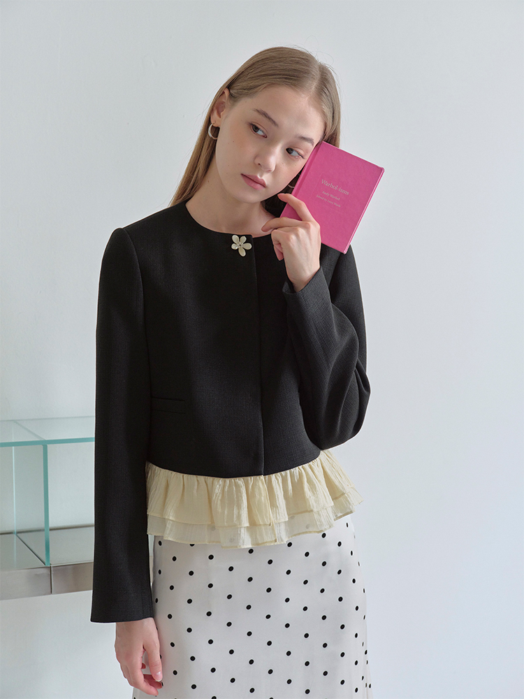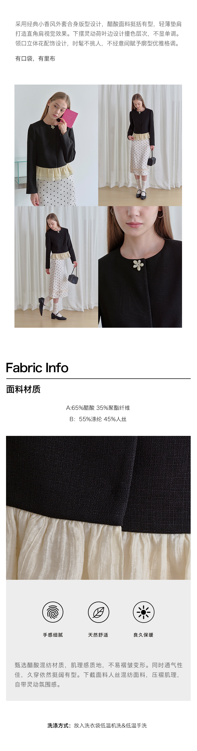 ForPoem 现货 25/FW原创设计花朵装饰荷叶边拼色醋酸短款小香风外套