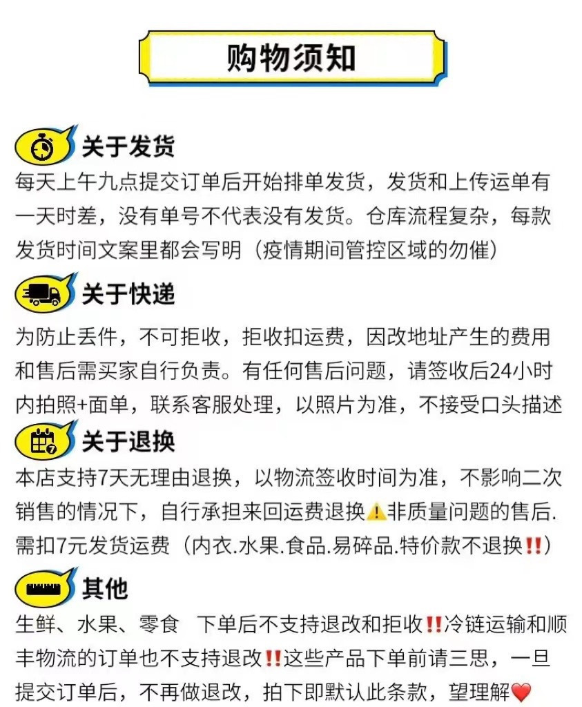 【售后政策】及时验货哦。我家不影响二次销售,都支持7天无理由哦,退货运费可以找我报销哈!