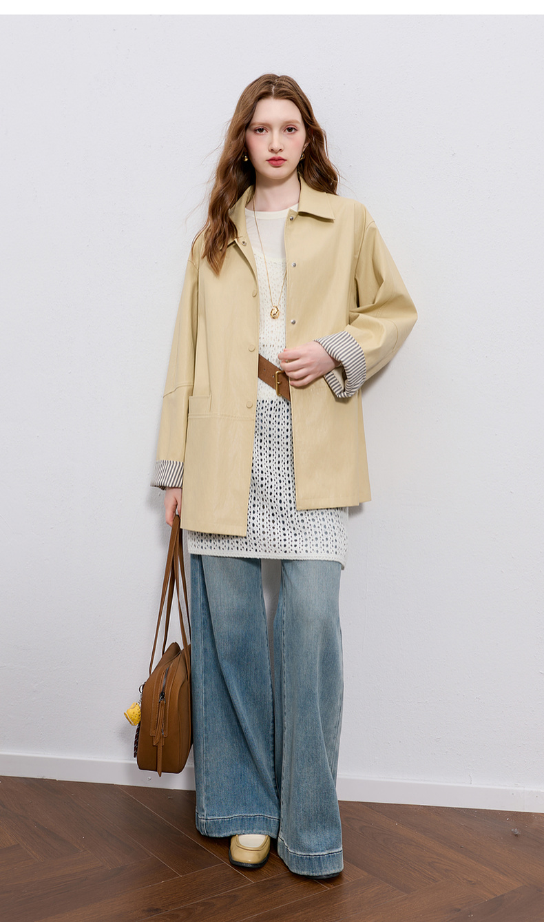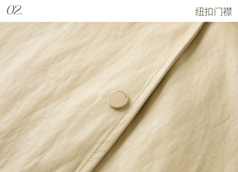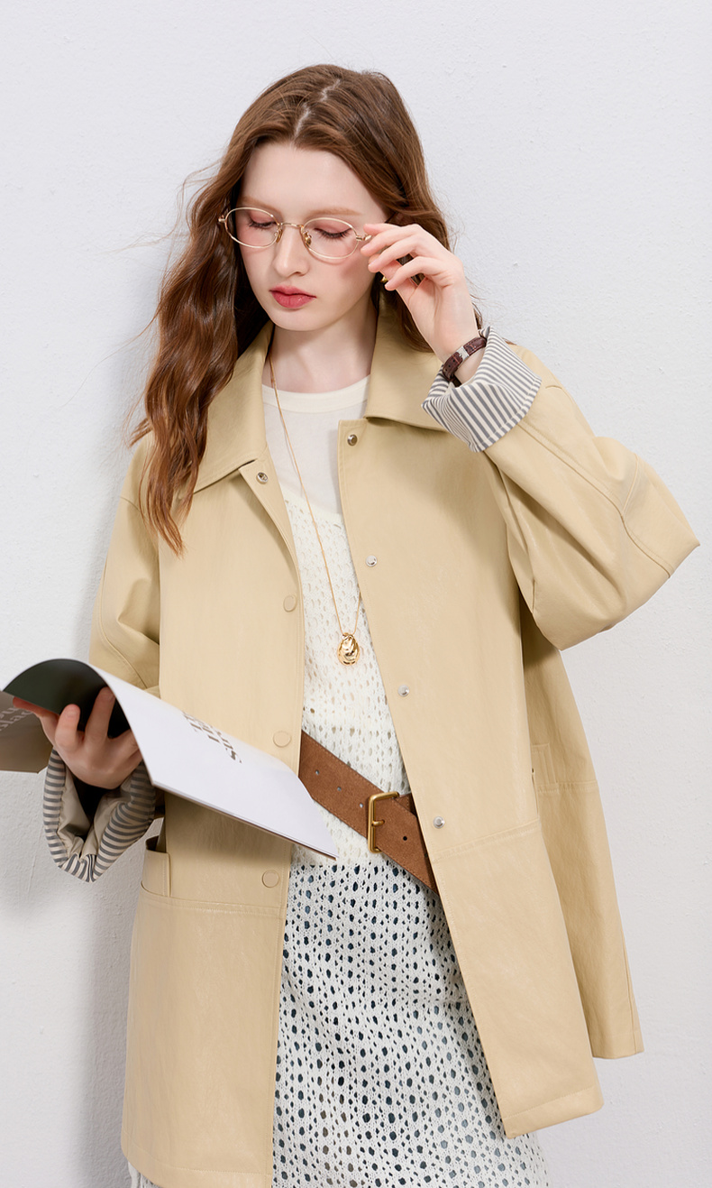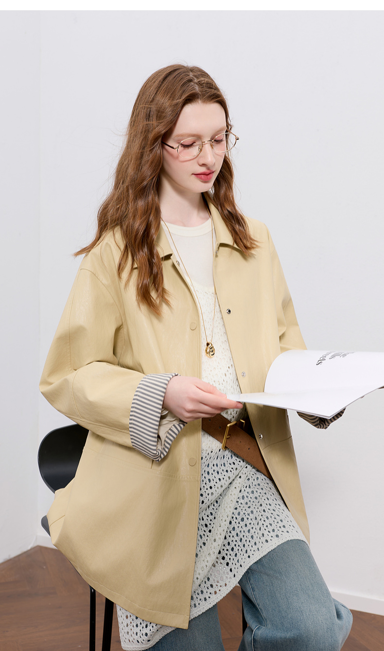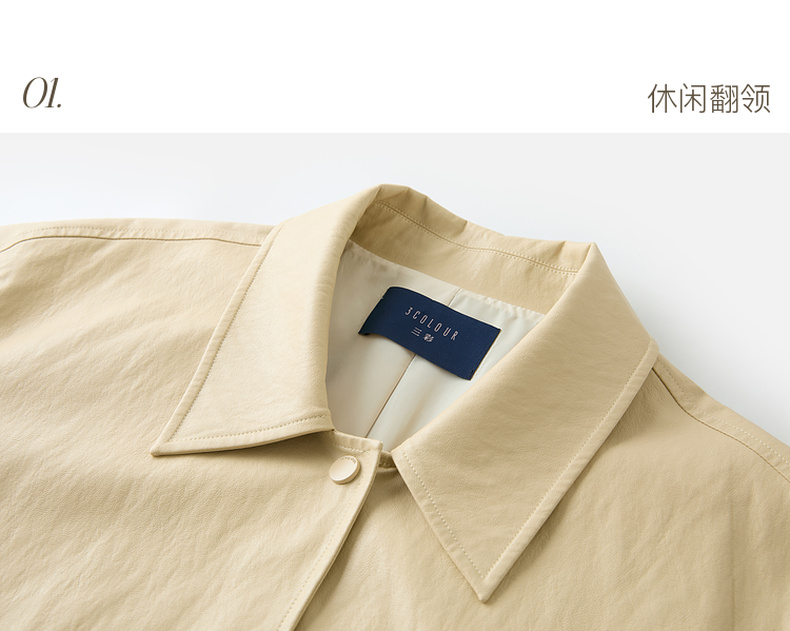 三彩2025秋季新款皮衣PU皮外套休闲翻领落肩袖宽松中长开衫M