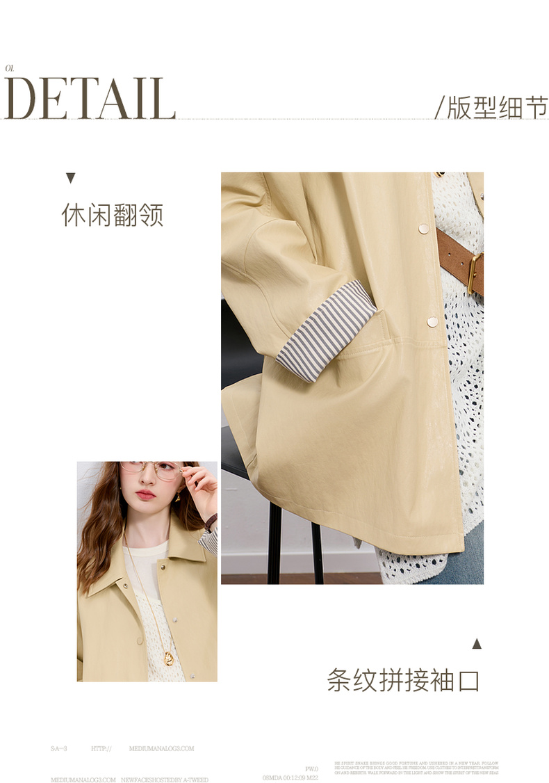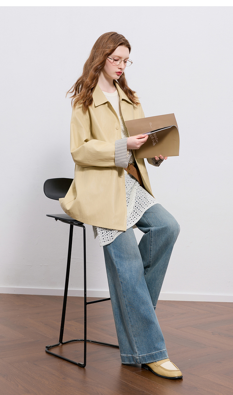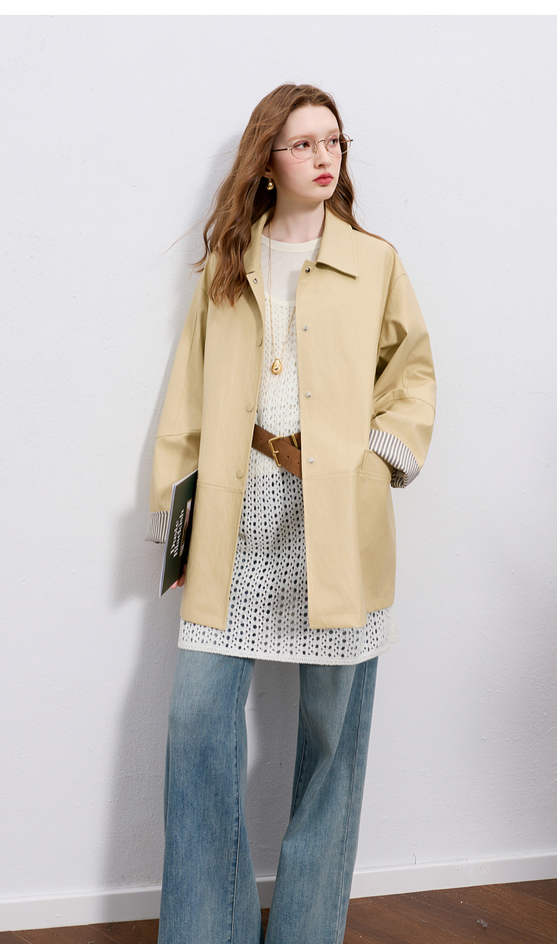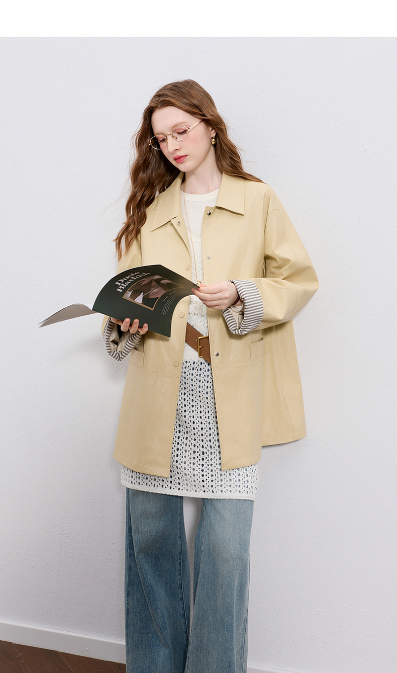 三彩2025秋季新款皮衣PU皮外套休闲翻领落肩袖宽松中长开衫M