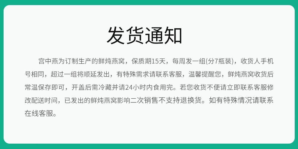 由于鲜炖燕窝是按需预订所以非质量原因不接受退换。其他产品在不影响二次销售的情况下可以7天无理由退换货。