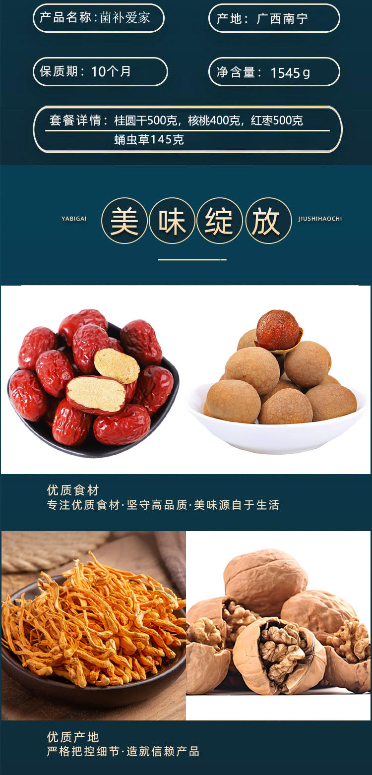 【阿比该】菌补爱家组合1545款(桂圆干500g*1,核桃400g*1,红枣500g*1,蛹虫草145g*1)