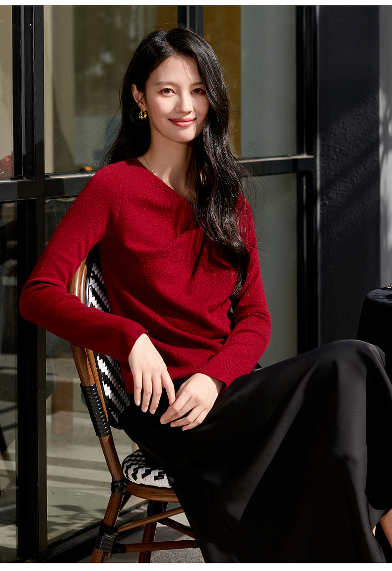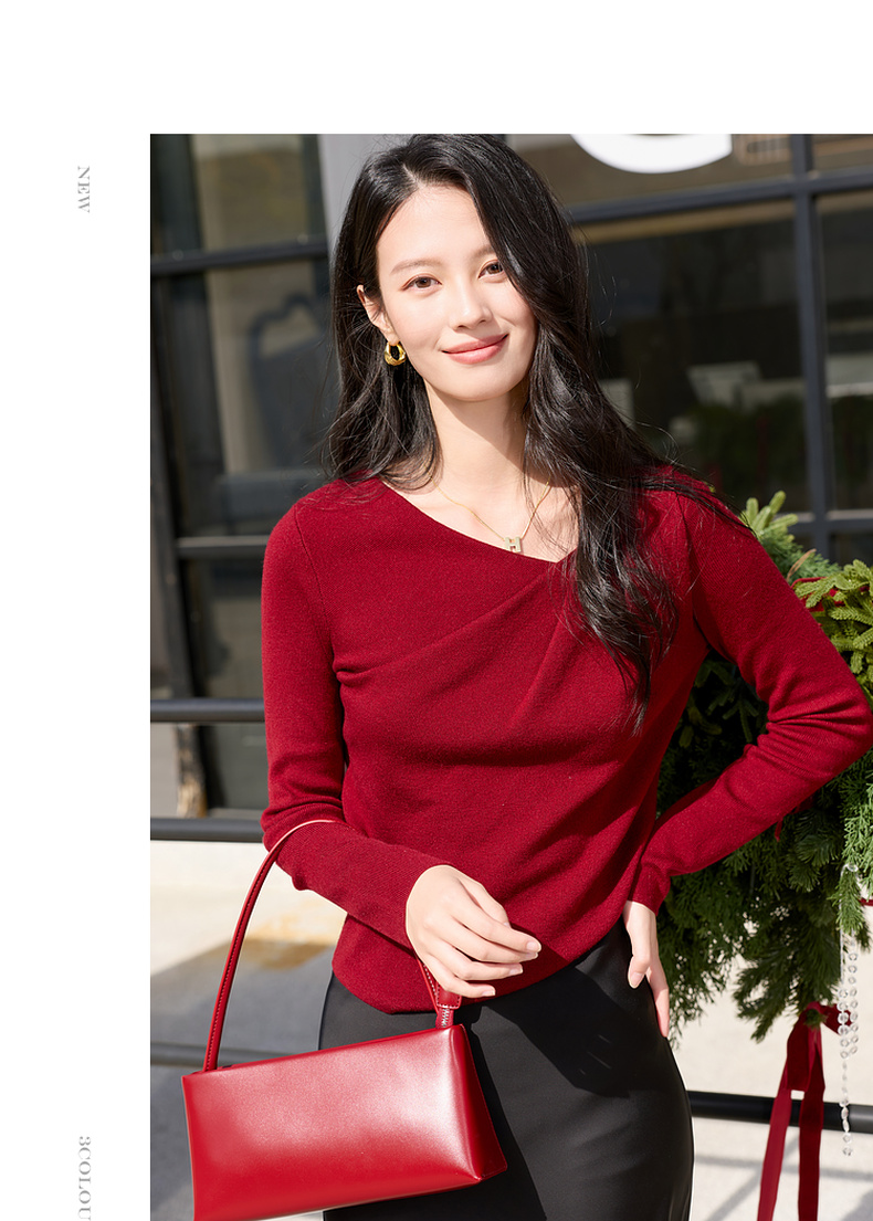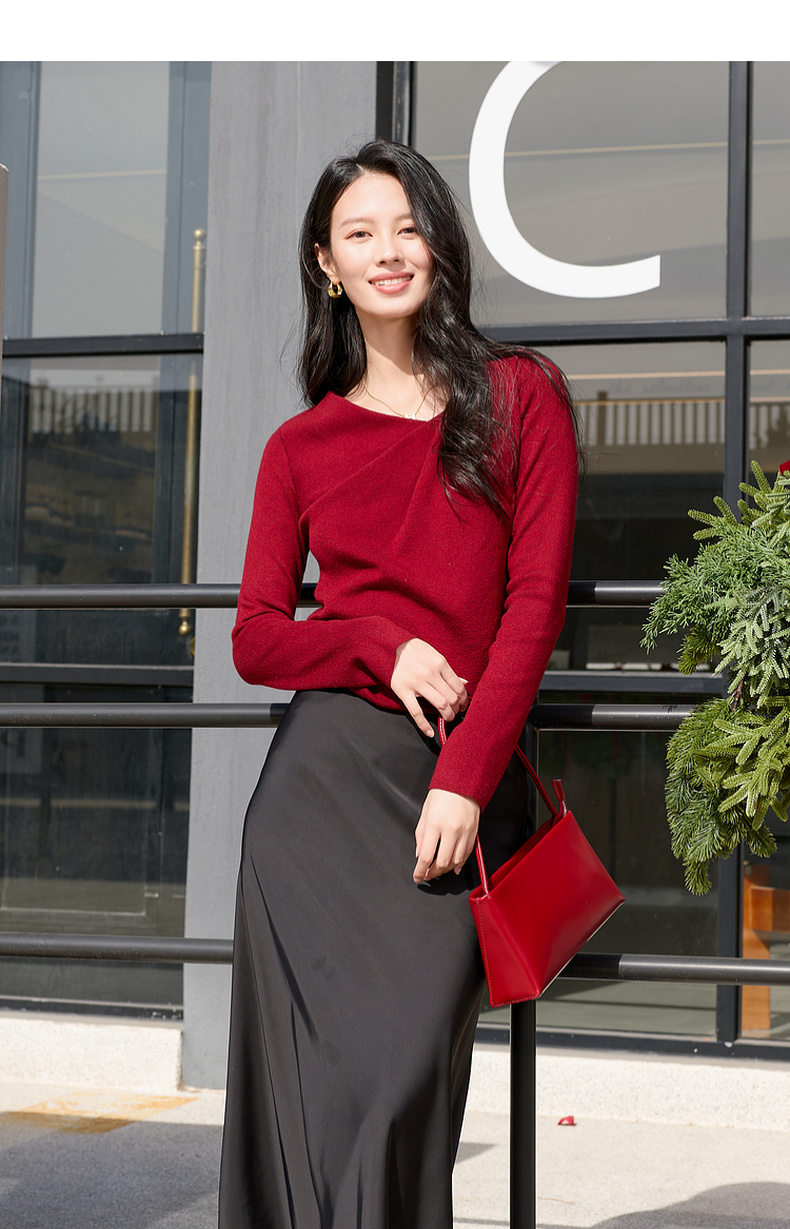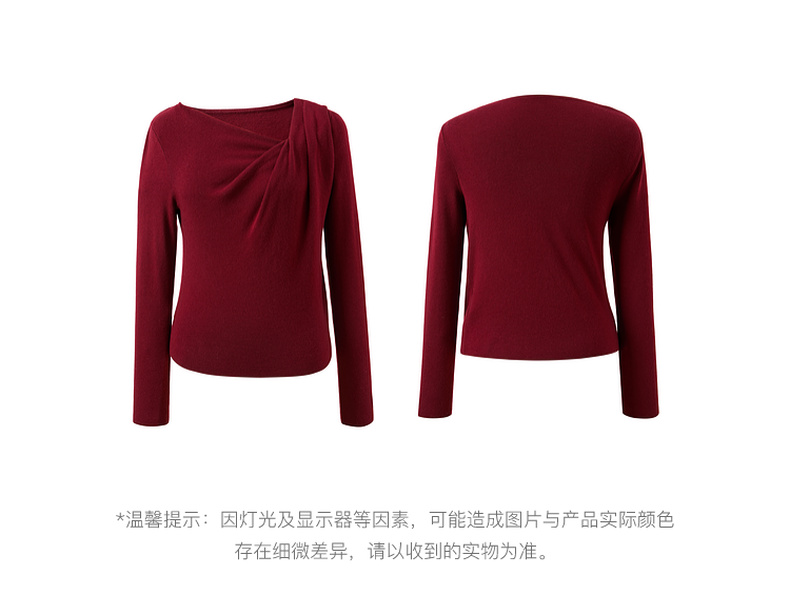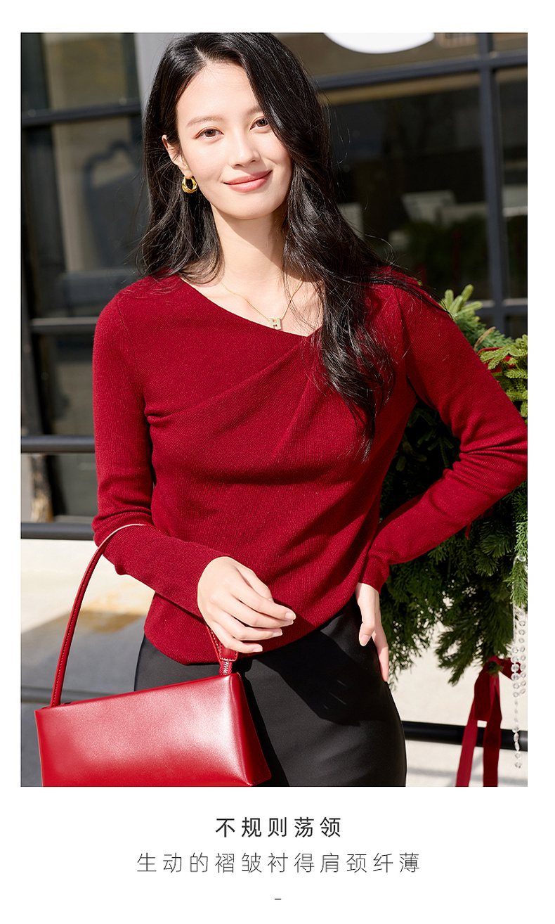 三彩2026春季新款设计感不规则荡领针织衫新年毛衫套头修身长袖S