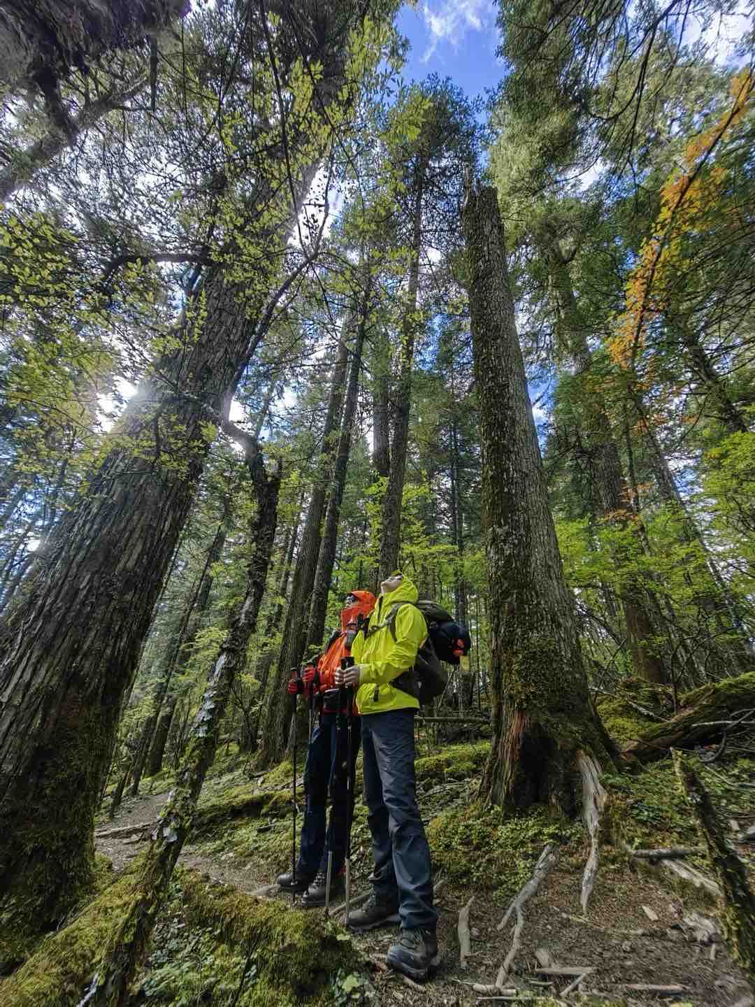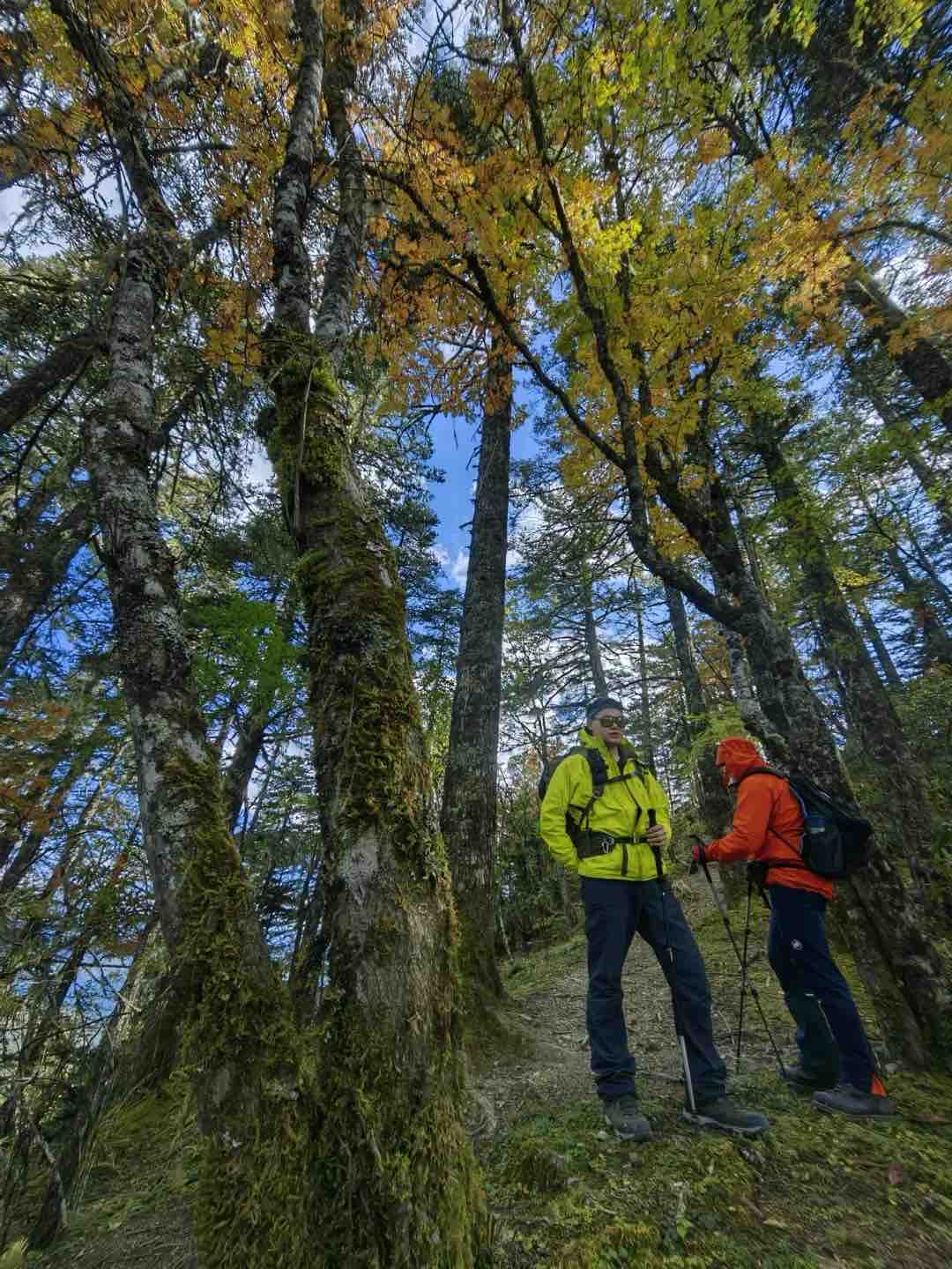 八点左右早餐后,沿密林小道一直下山,途中穿越云杉林、栎树林、云南松林最终到达河边露营点。整个徒步过程下坡掌握好节奏,容易关节疼痛。需带护膝,减轻对漆关节的冲击。
