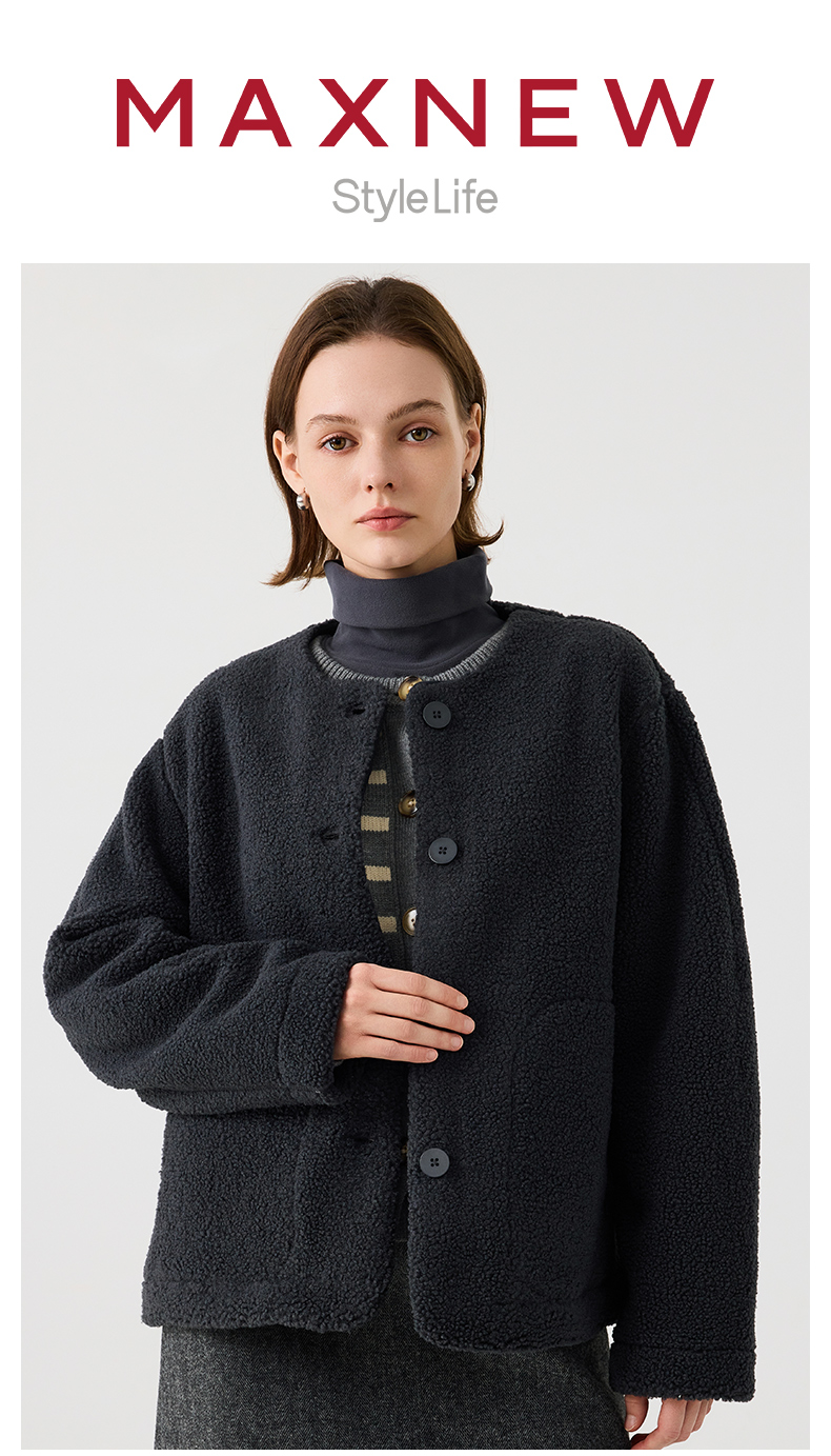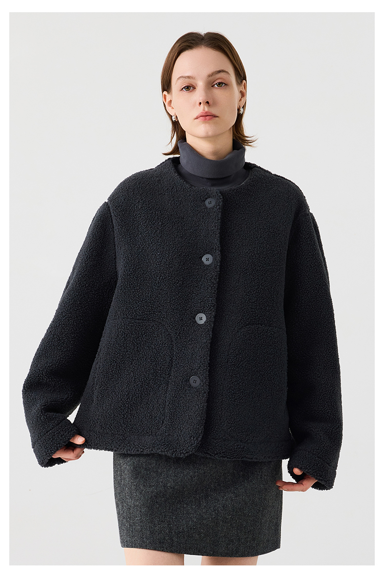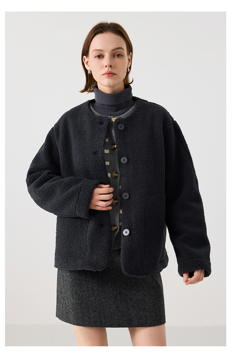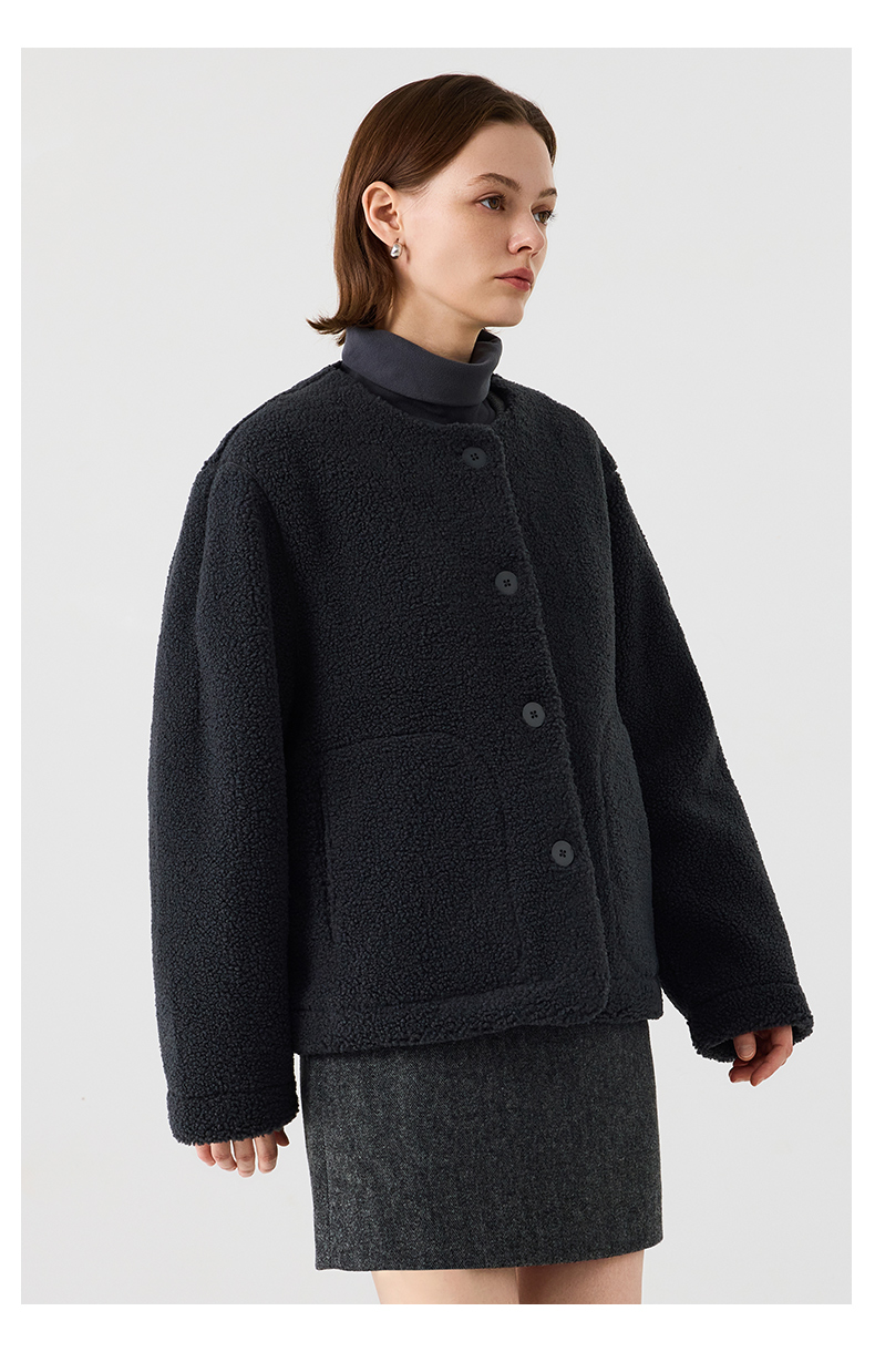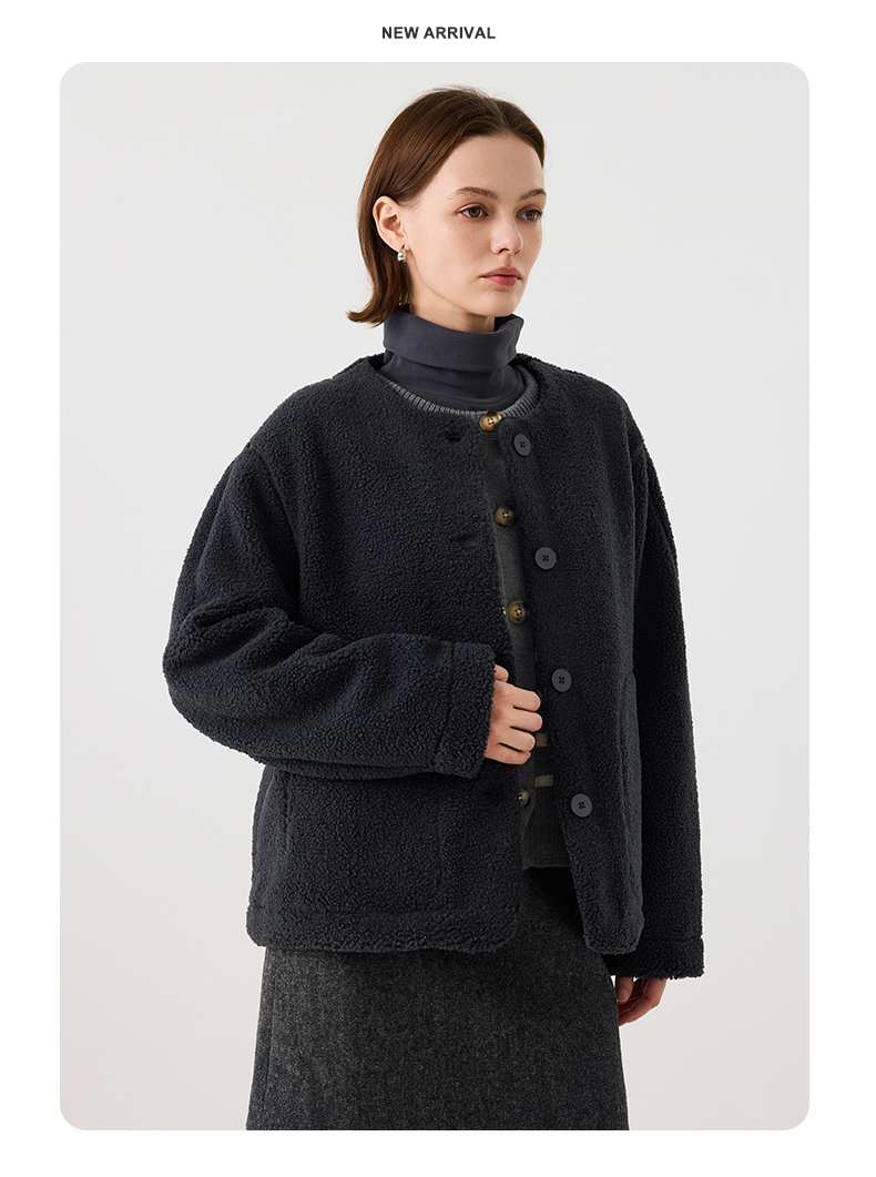 【茄克】仿羊羔绒廓形无领外套1N4223107