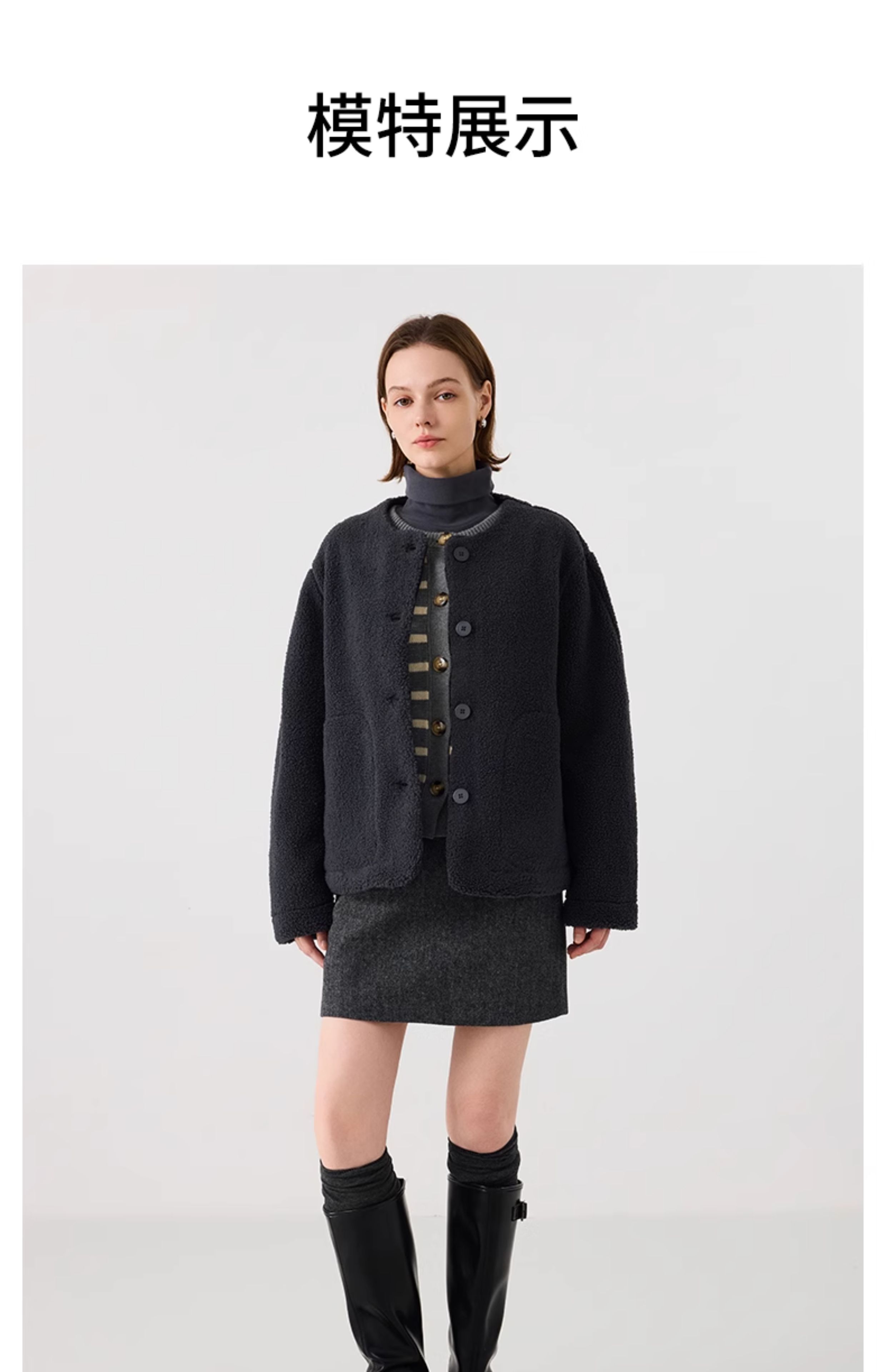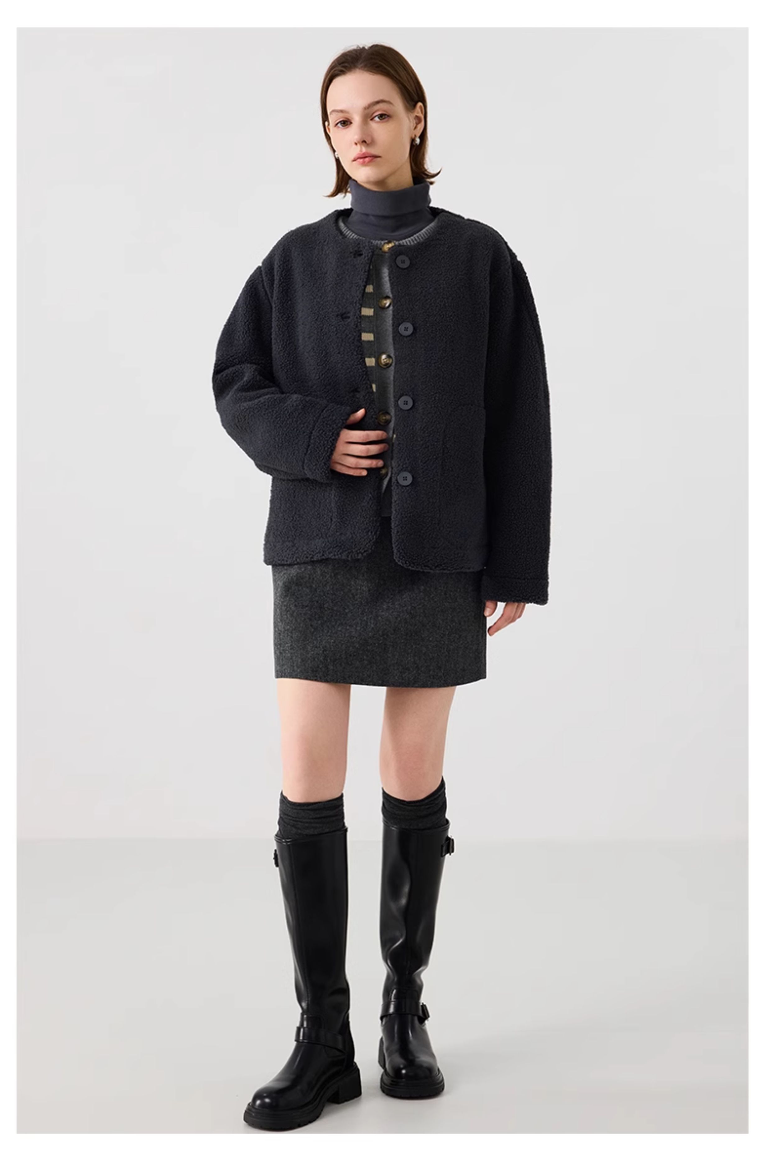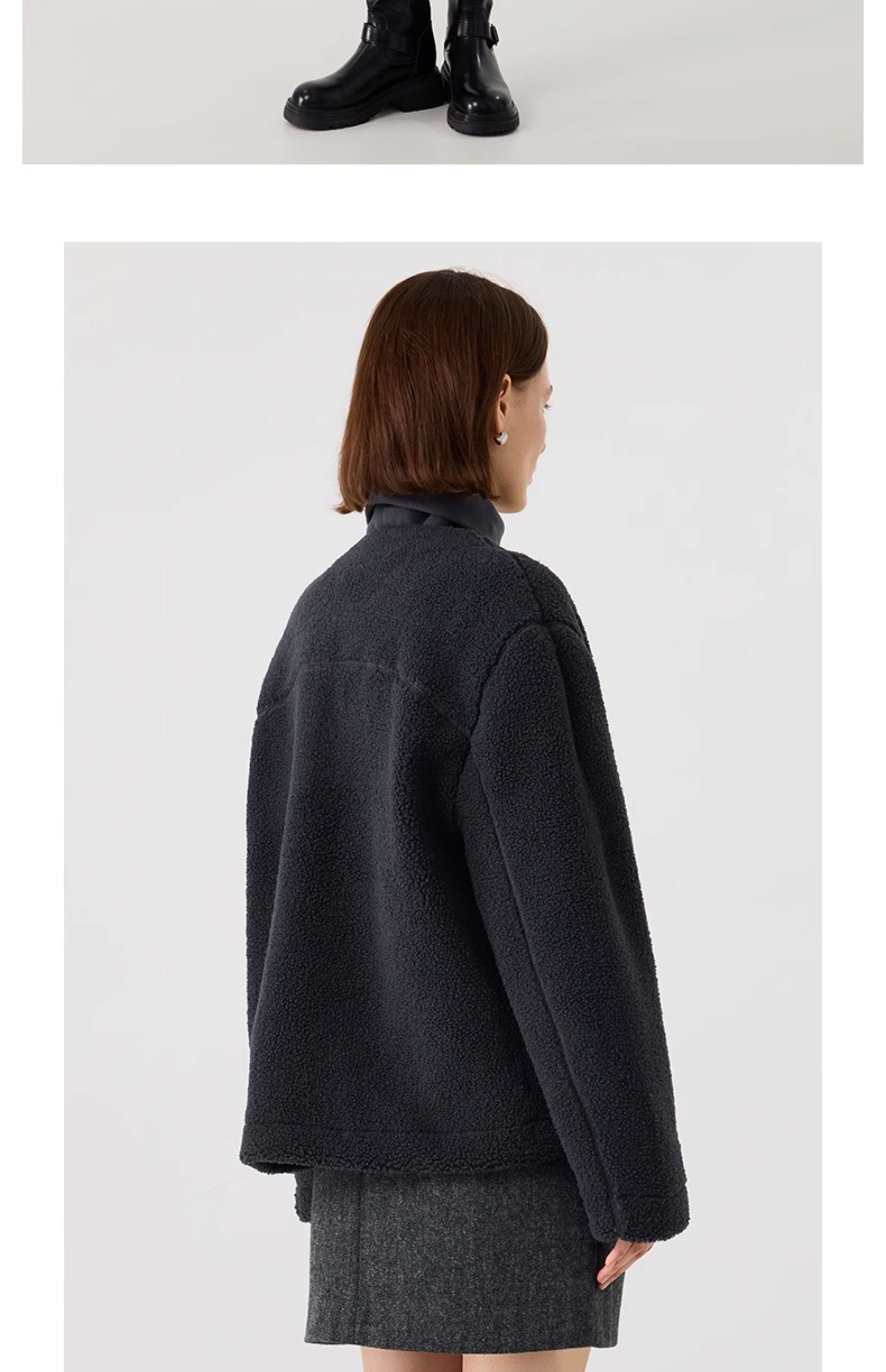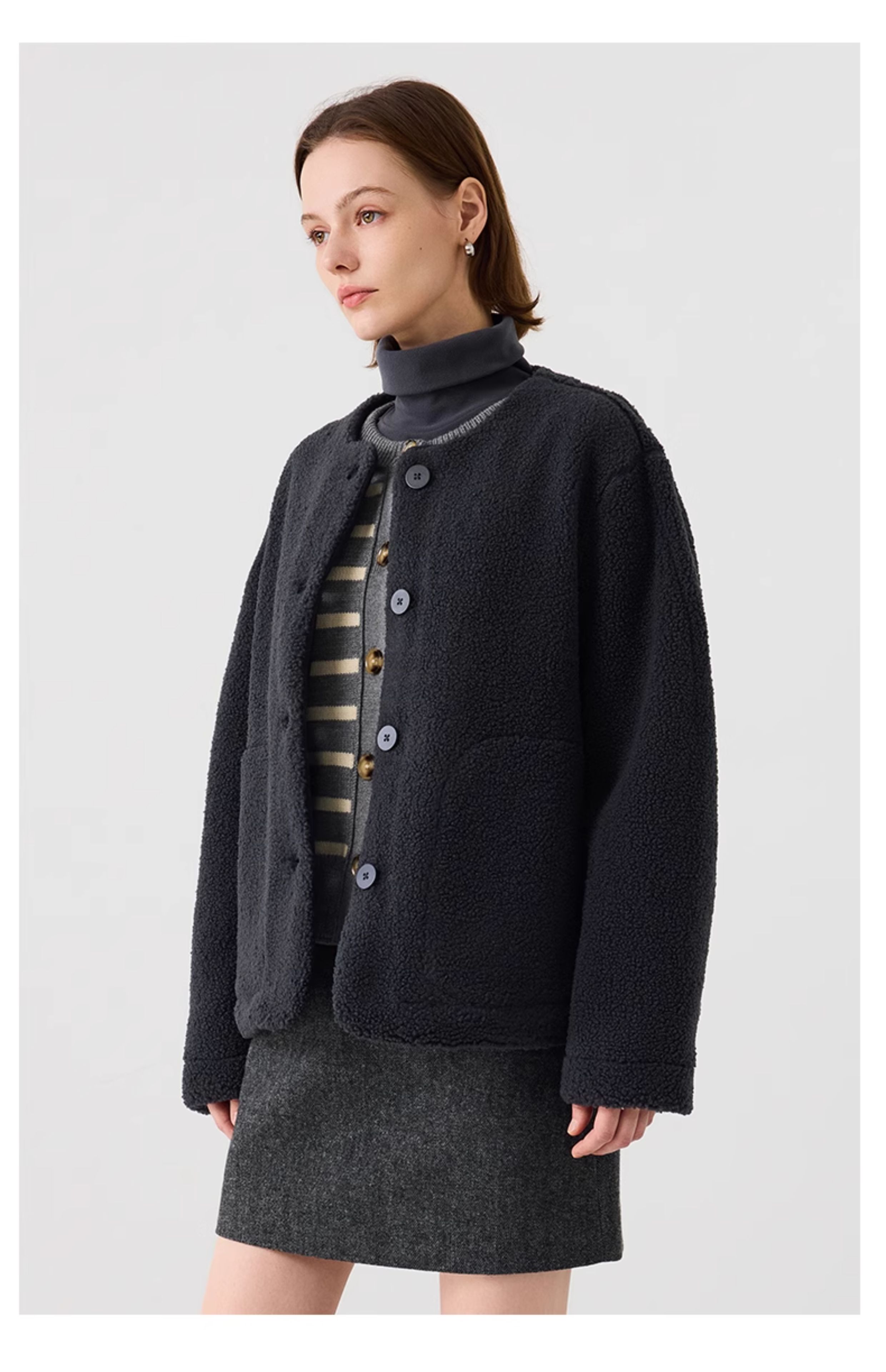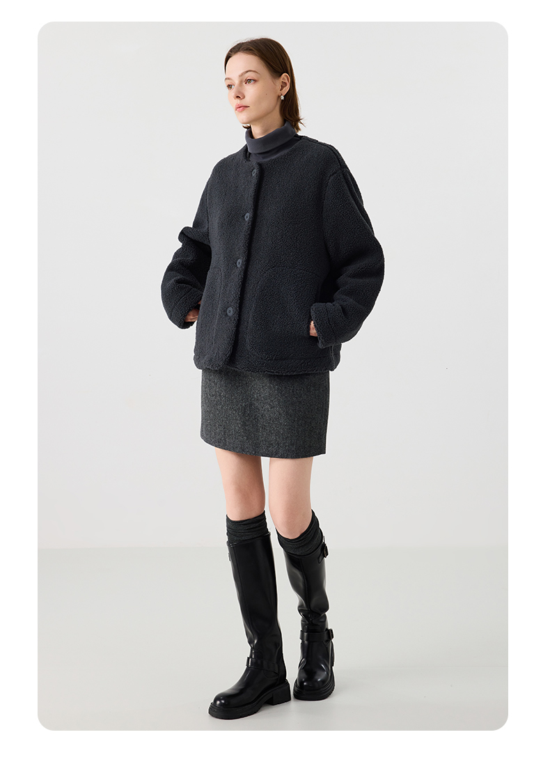 【茄克】仿羊羔绒廓形无领外套1N4223107