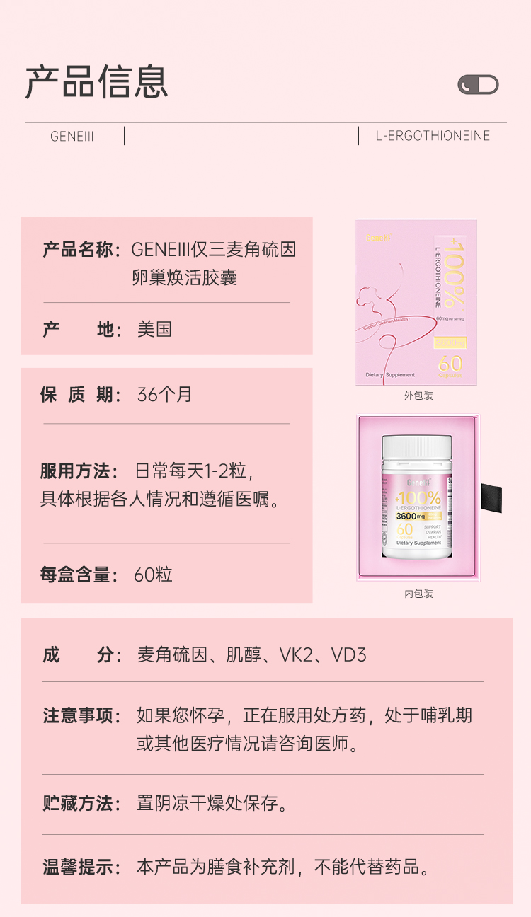 【仅三生物】GeneIII仅三麦角硫因卵巢焕活胶囊99.99%高纯度60mg/粒 60粒/桶
