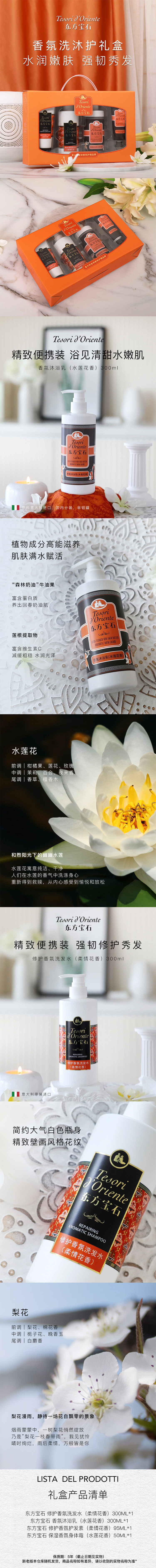 东方宝石 香氛洗护润套盒 【 香氛沐浴乳(水莲花香)300ml*1 + 修护香氛洗发水(柔情花香)300ml*1+修护香氛护发素(柔情花香)95ml*1 +保湿身体霜(水莲花香) 50ml*1】