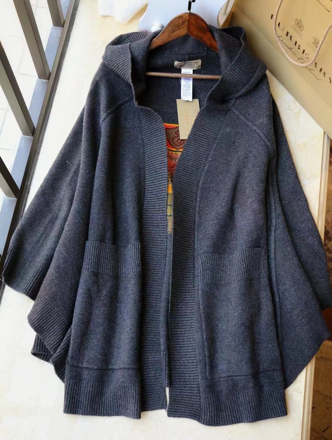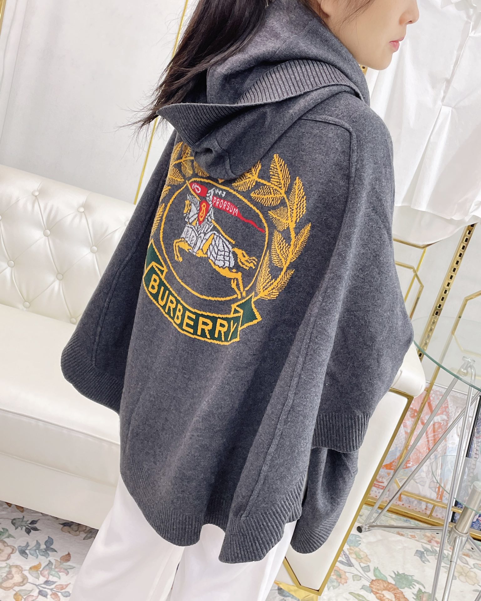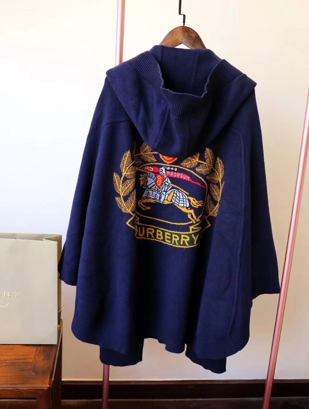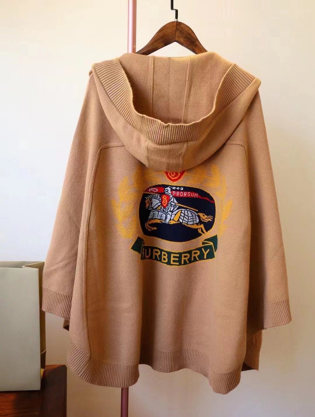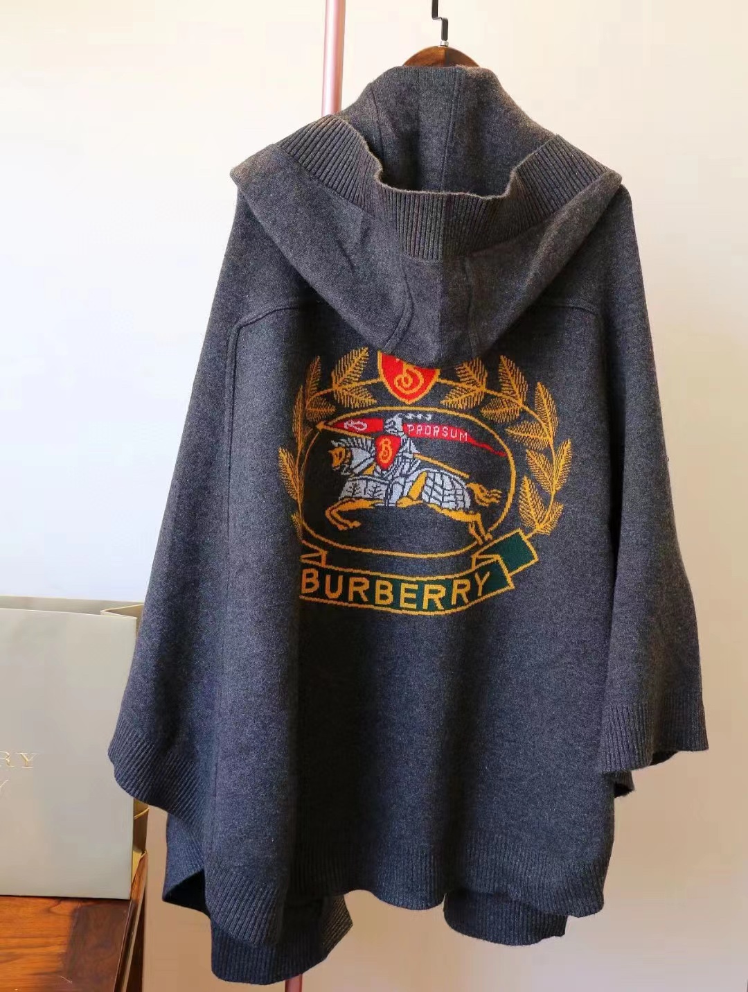 B家最新款连帽斗篷,战马嵌花款,市面最牛的货,净重1350克,将近2斤7两一条,真材实料的东西,专柜15500一条,这款既可以当连帽上衣又可以当斗篷,配上长筒靴超带范儿,舒适性与保暖性于一体,是适合寒冷时节穿着的绝佳单品。臻选最为柔软的羊毛羊绒精纺面料,匠心融入弹性纤维,86%羊毛,10%羊绒,2%弹性纤维,2%聚酰胺,搭配正面超大口袋,背部缀有“Burberry"字母徽标,这个标是提花织上去的,不是胶印上去的,也不是贴片,整条斗篷柔软细腻,一点不扎,正常身材都能穿,随便驾驭