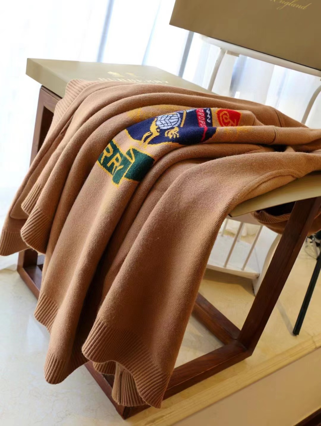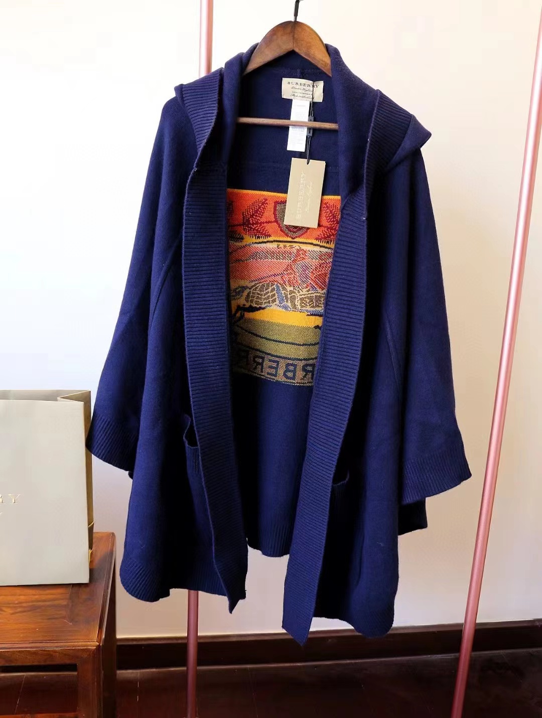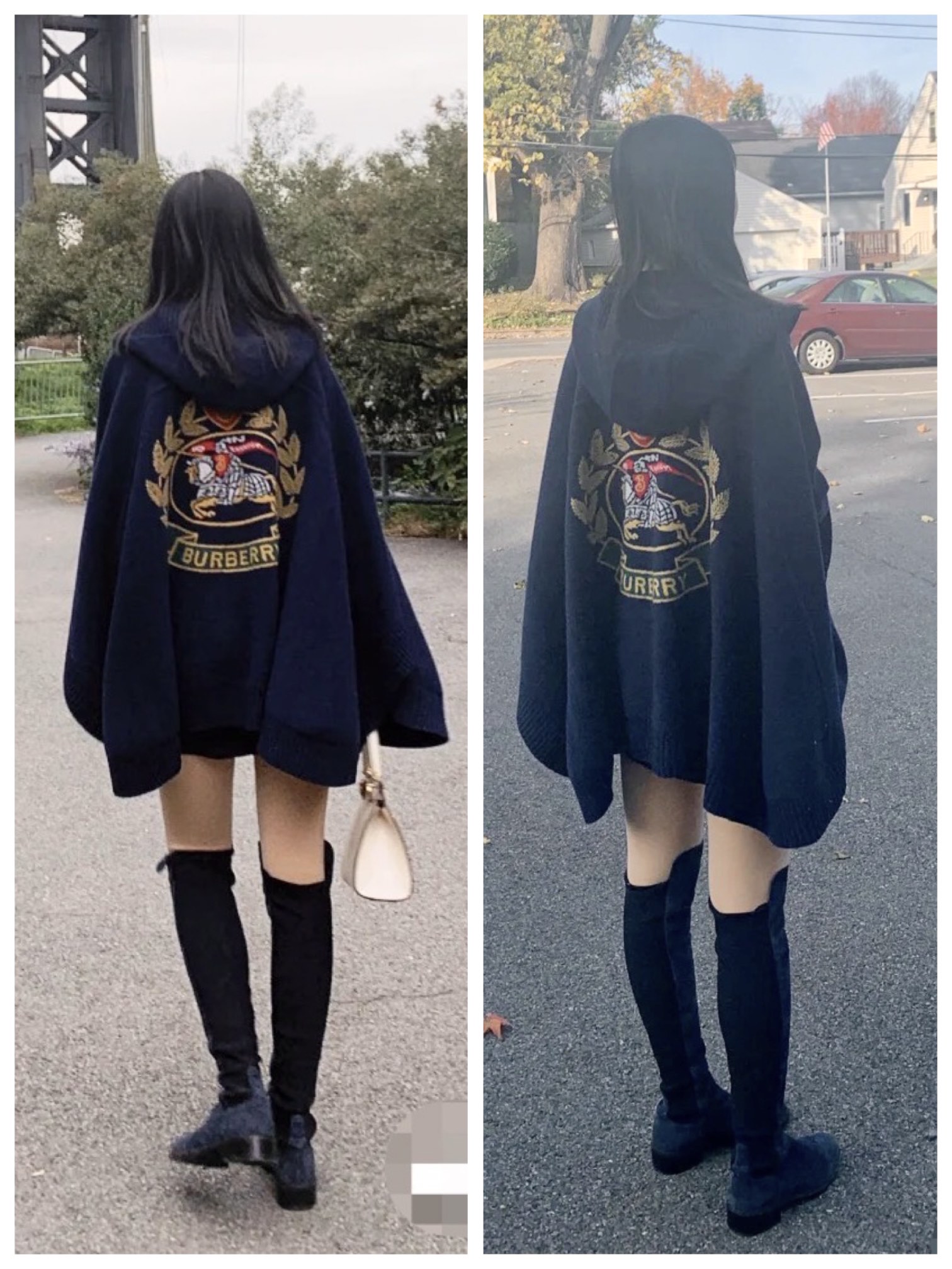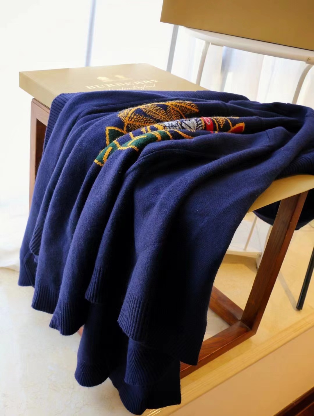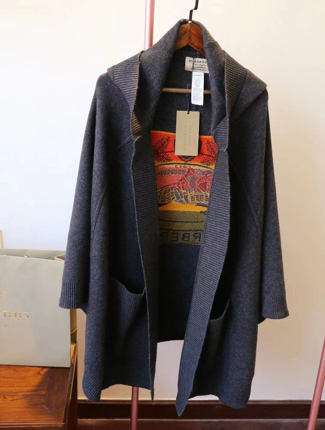 B家最新款连帽斗篷,战马嵌花款,市面最牛的货,净重1350克,将近2斤7两一条,真材实料的东西,专柜15500一条,这款既可以当连帽上衣又可以当斗篷,配上长筒靴超带范儿,舒适性与保暖性于一体,是适合寒冷时节穿着的绝佳单品。臻选最为柔软的羊毛羊绒精纺面料,匠心融入弹性纤维,86%羊毛,10%羊绒,2%弹性纤维,2%聚酰胺,搭配正面超大口袋,背部缀有“Burberry"字母徽标,这个标是提花织上去的,不是胶印上去的,也不是贴片,整条斗篷柔软细腻,一点不扎,正常身材都能穿,随便驾驭