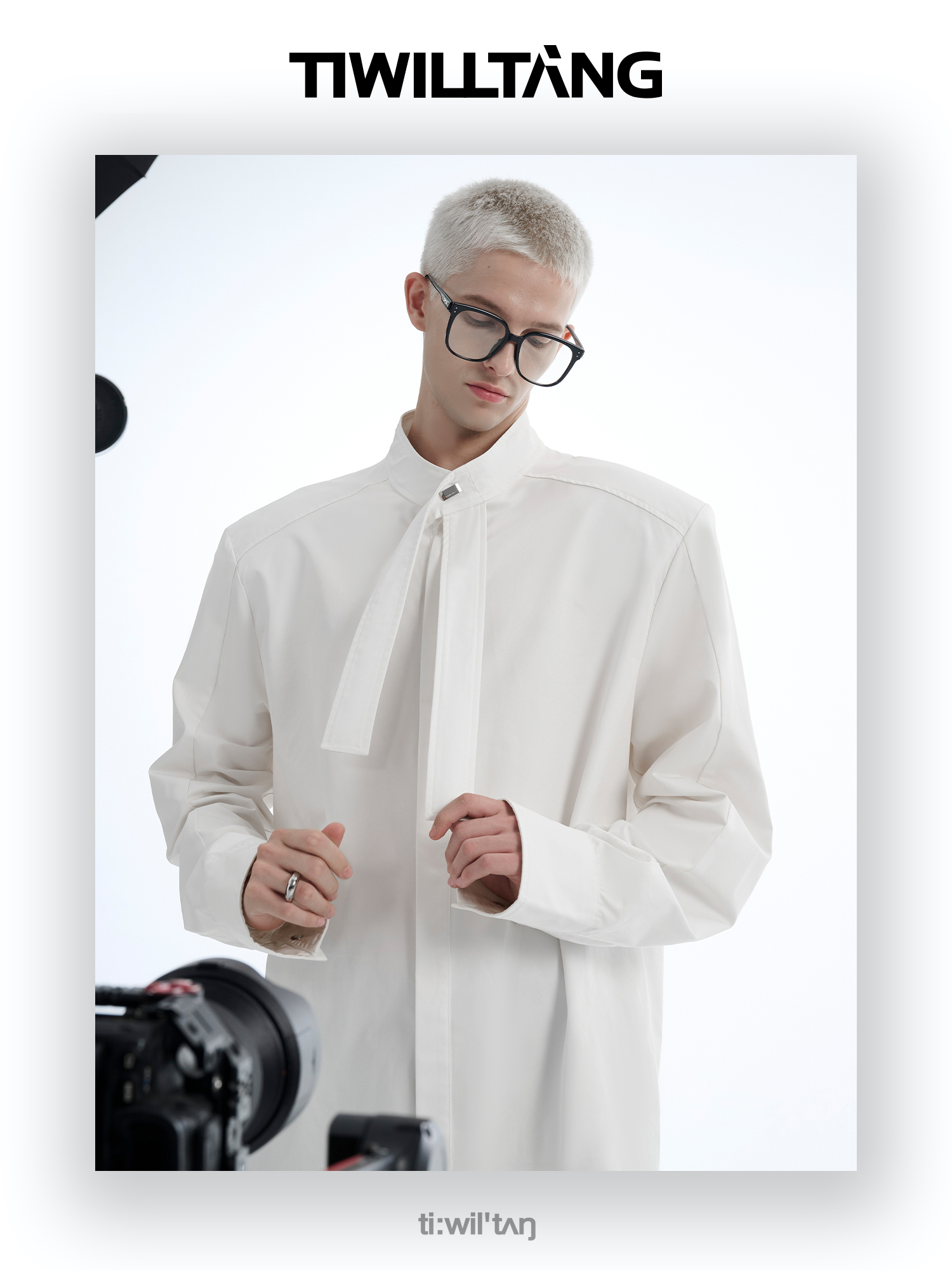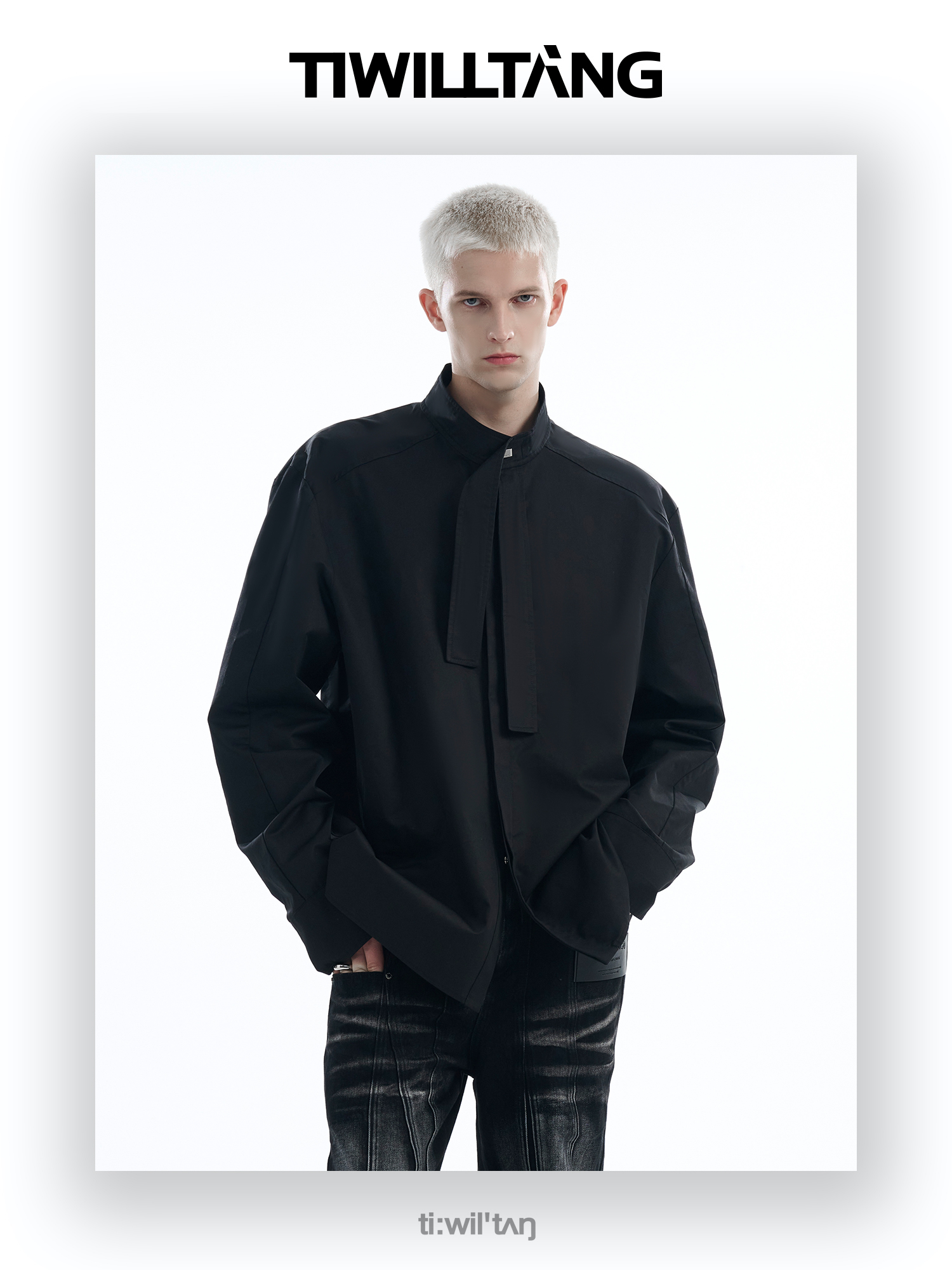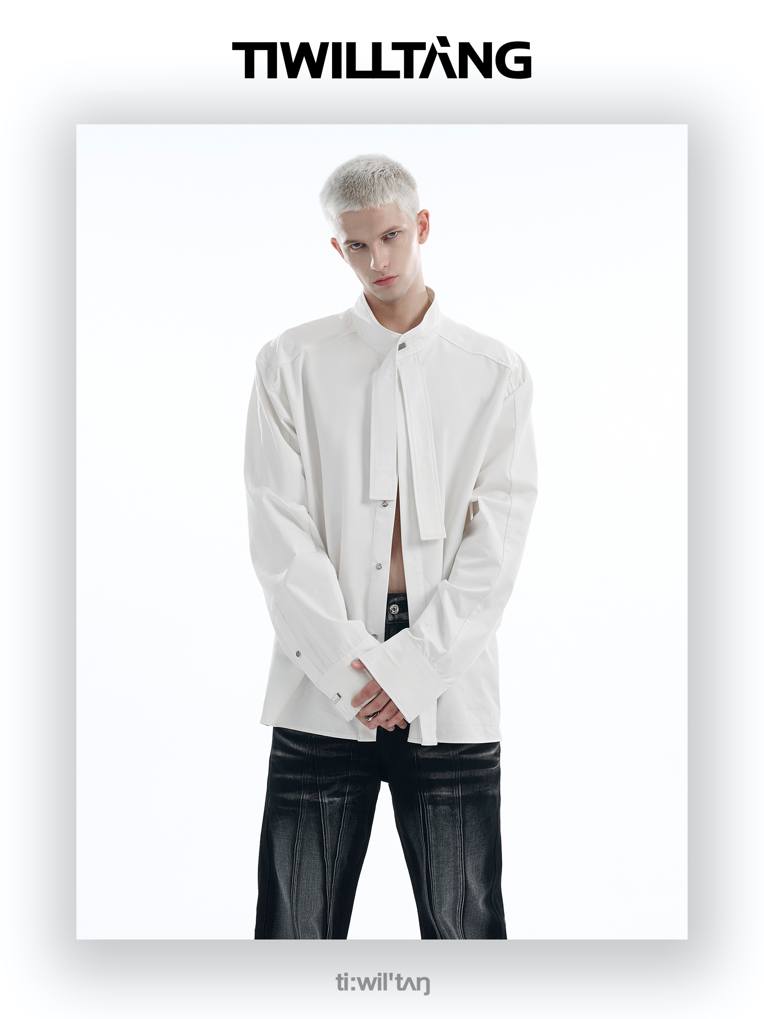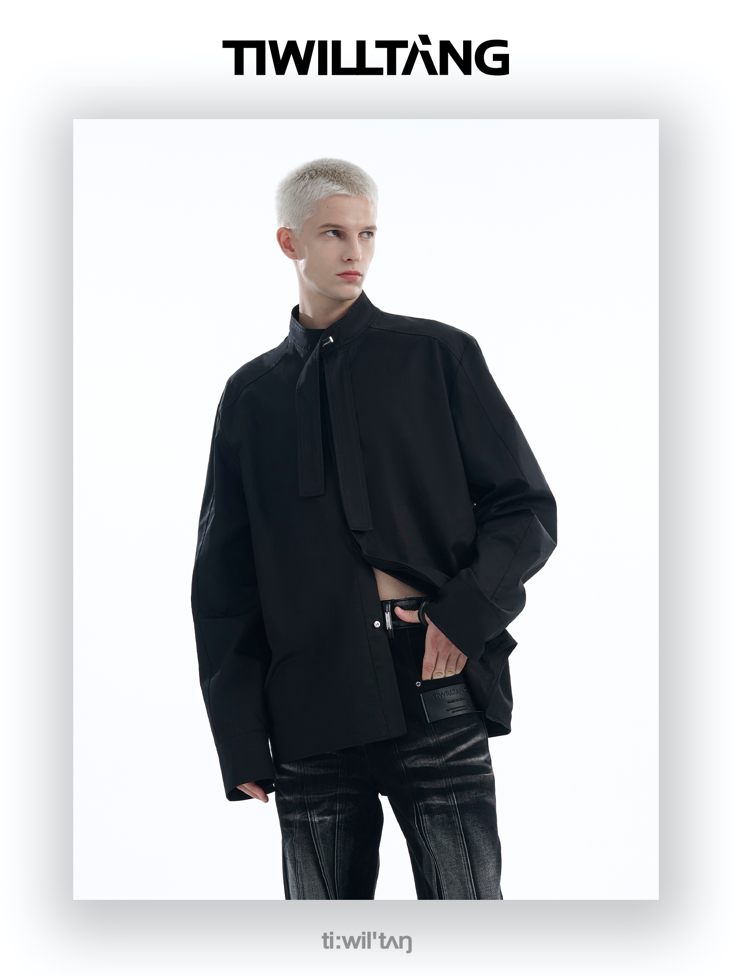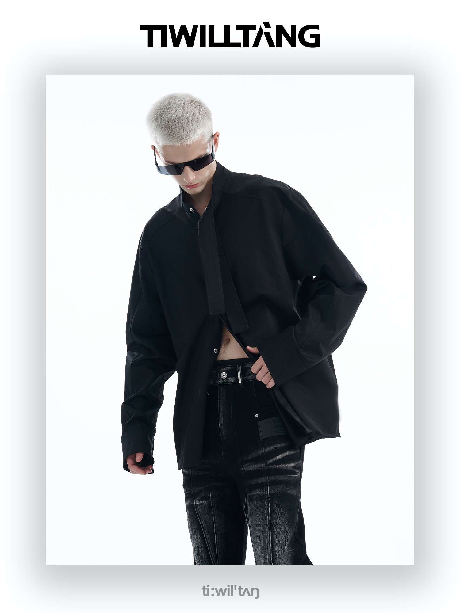 启世录TIWILLTANG“当代救赎”精奢设计感飘带领黑白休闲长袖衬衫