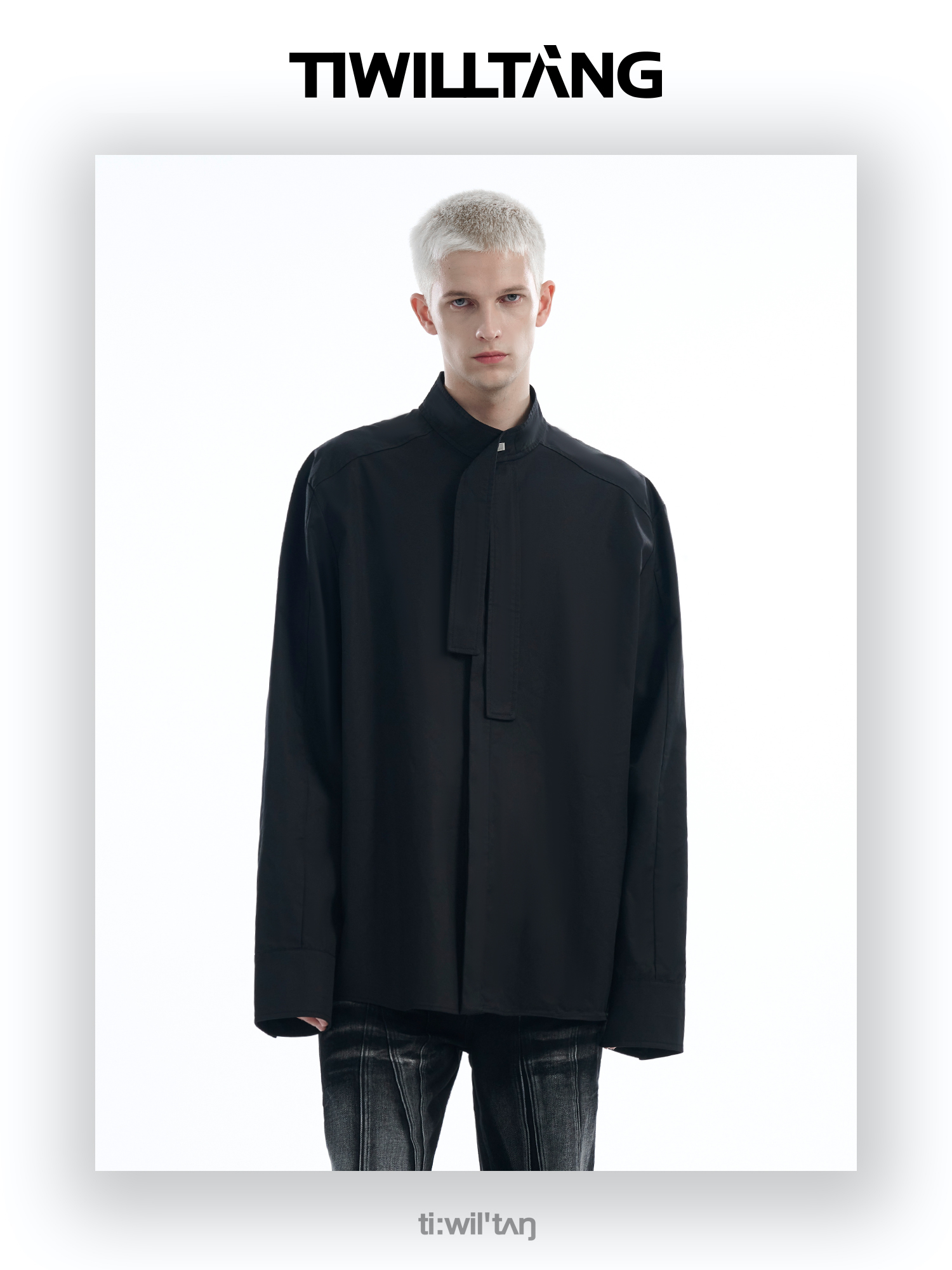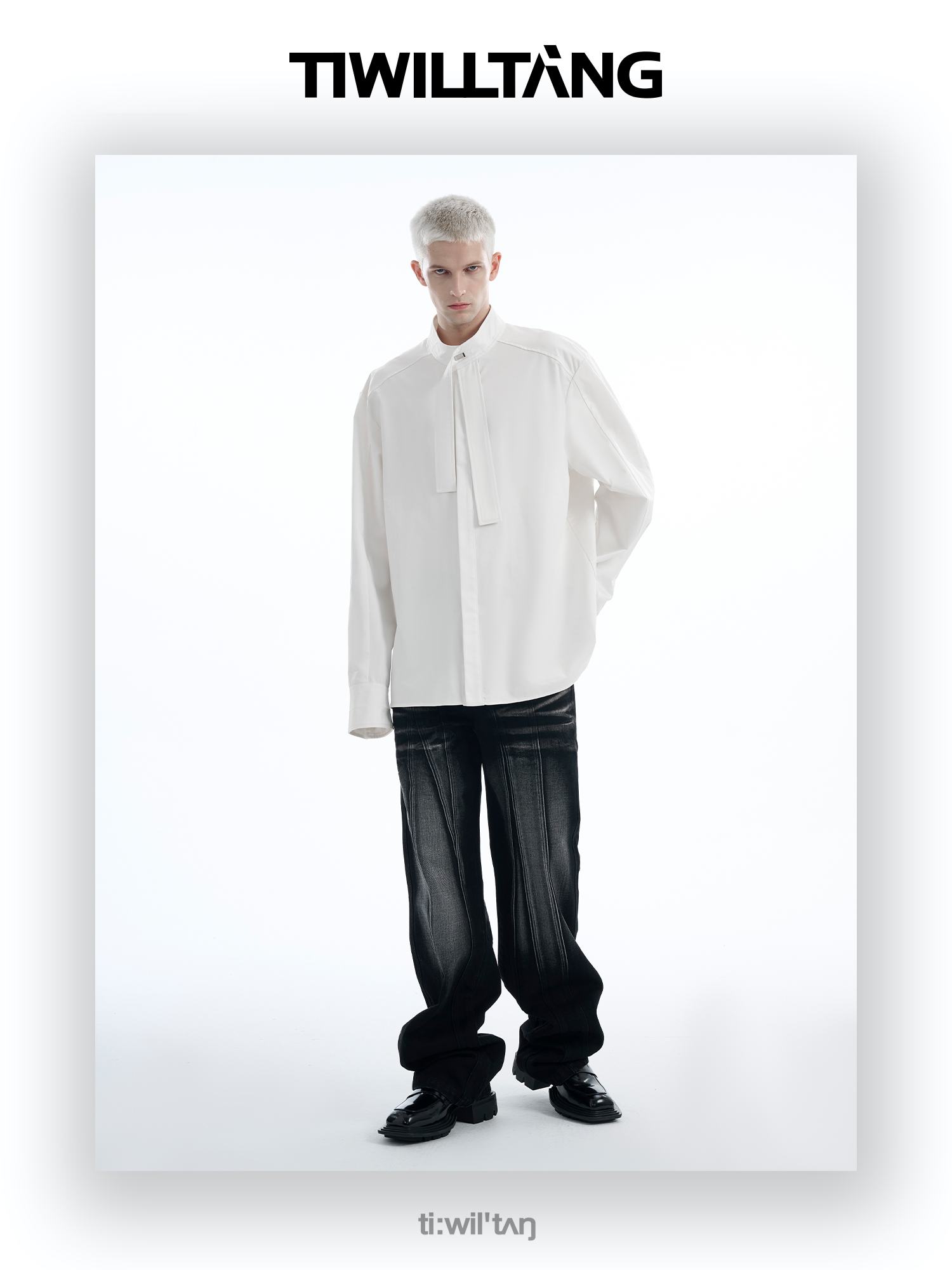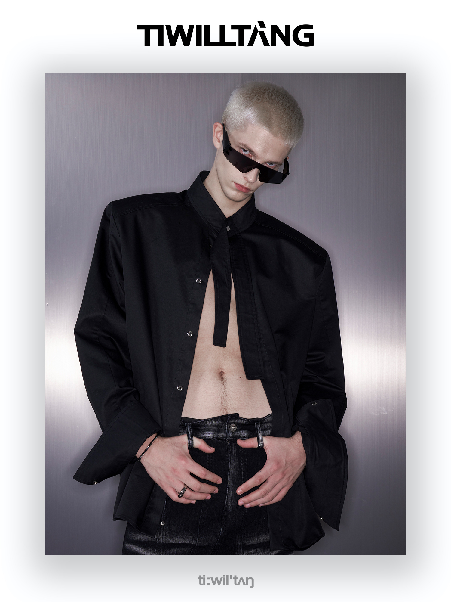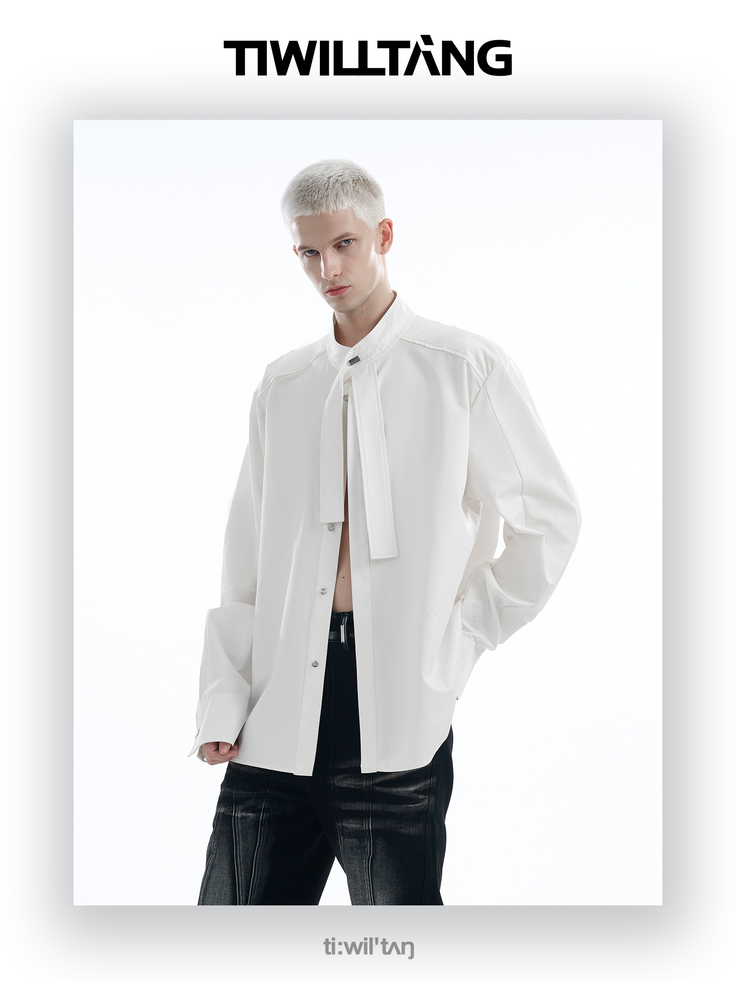 启世录TIWILLTANG“当代救赎”精奢设计感飘带领黑白休闲长袖衬衫