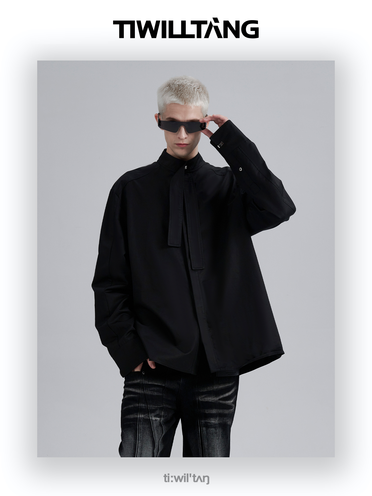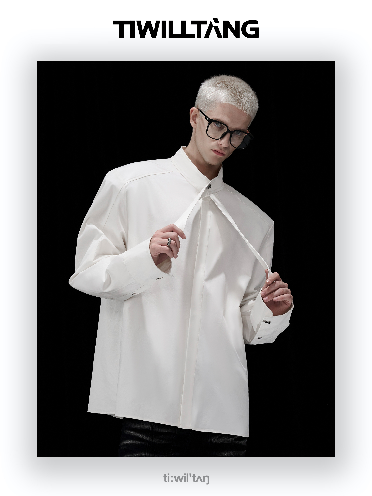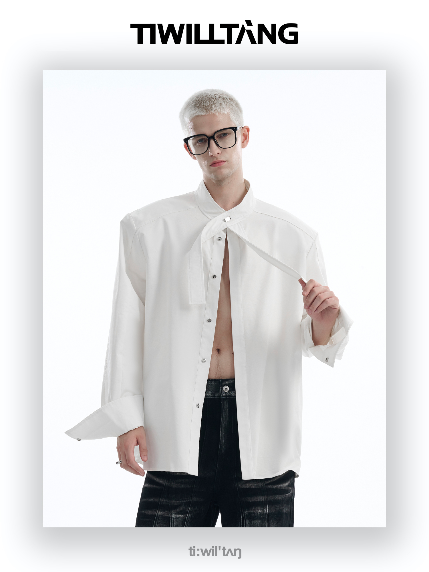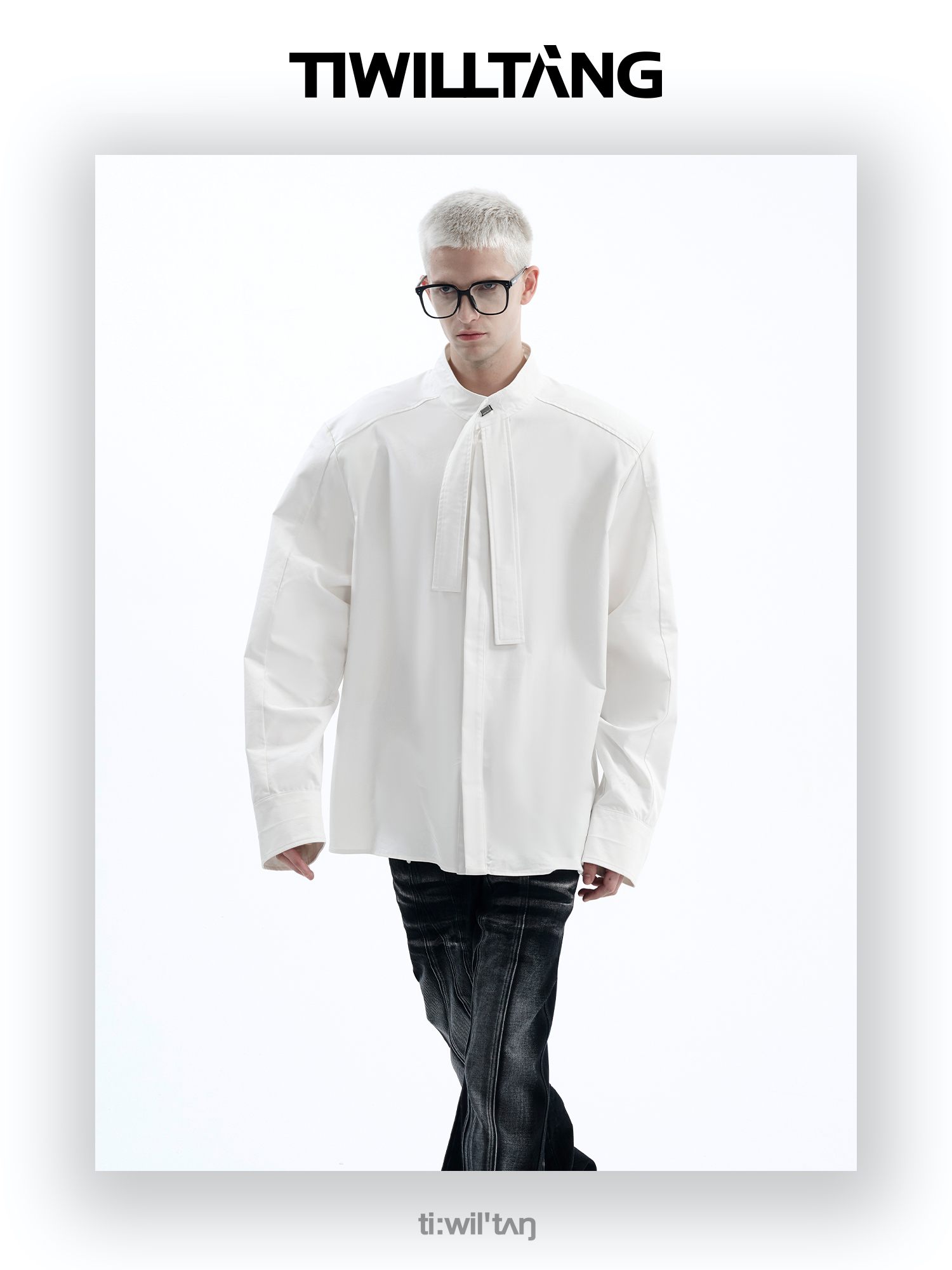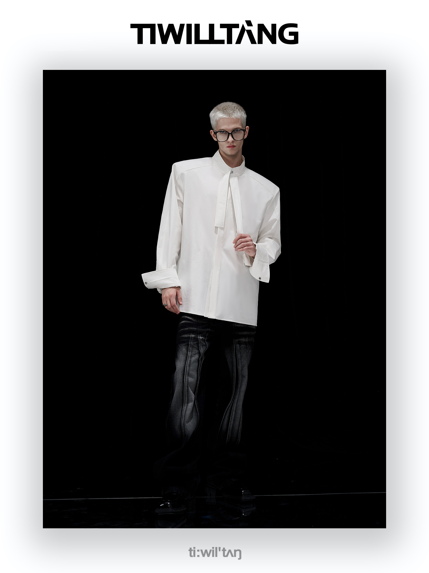 启世录TIWILLTANG“当代救赎”精奢设计感飘带领黑白休闲长袖衬衫
