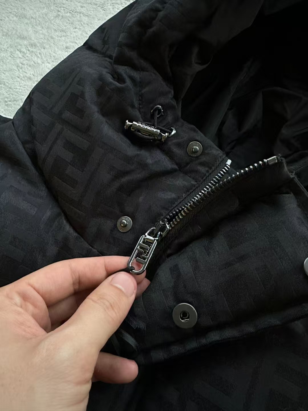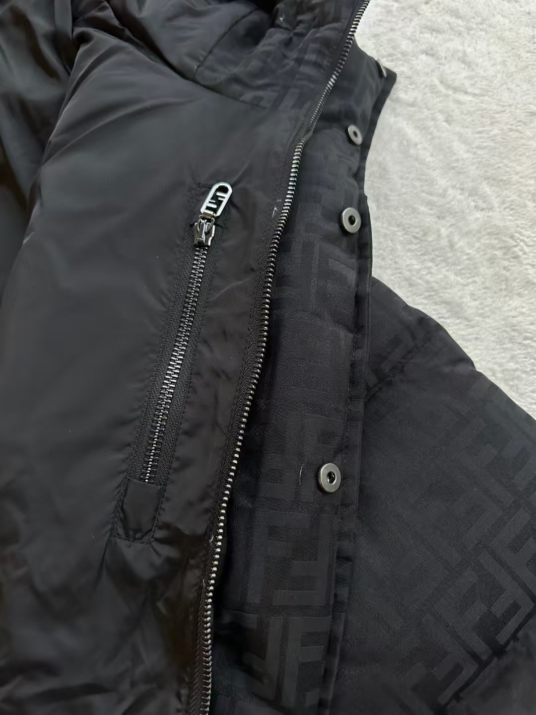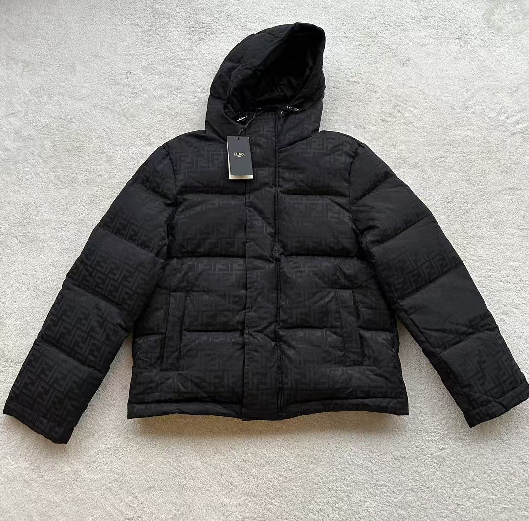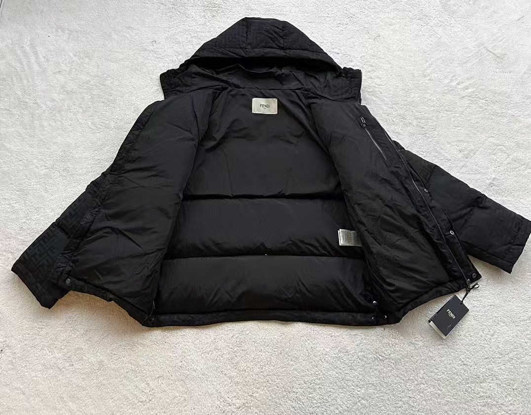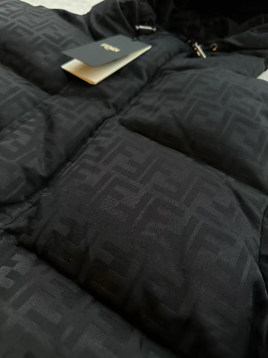 羽绒服表面饰有标志性的FF图案,这是品牌的经典元素,彰显了品牌的独特魅力和高端品质。