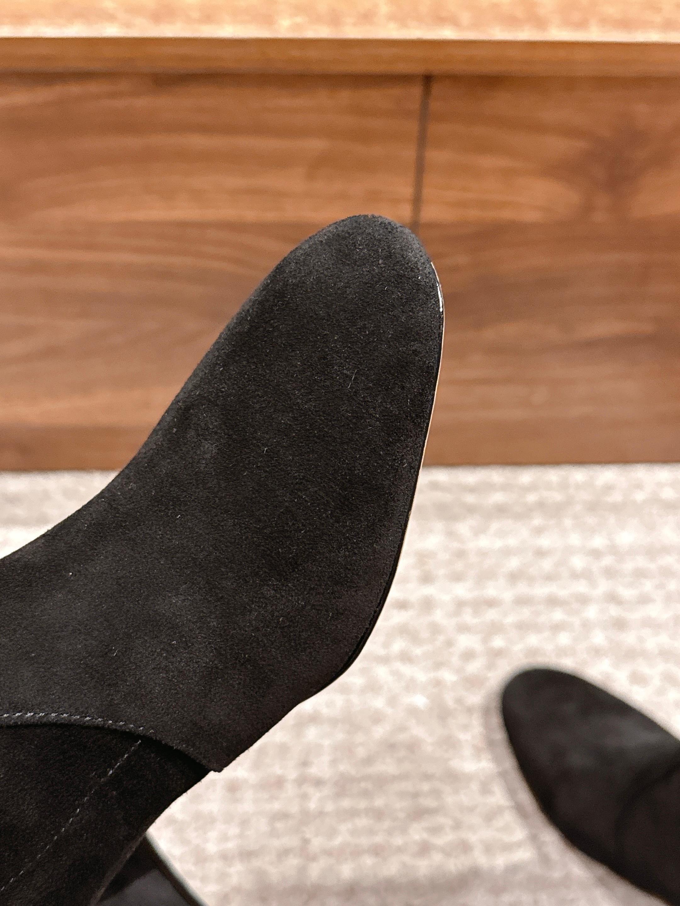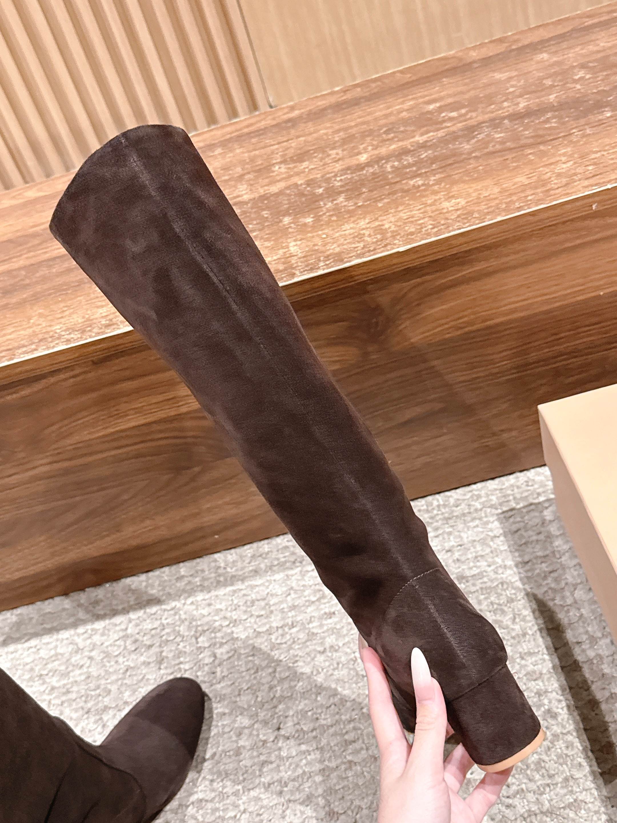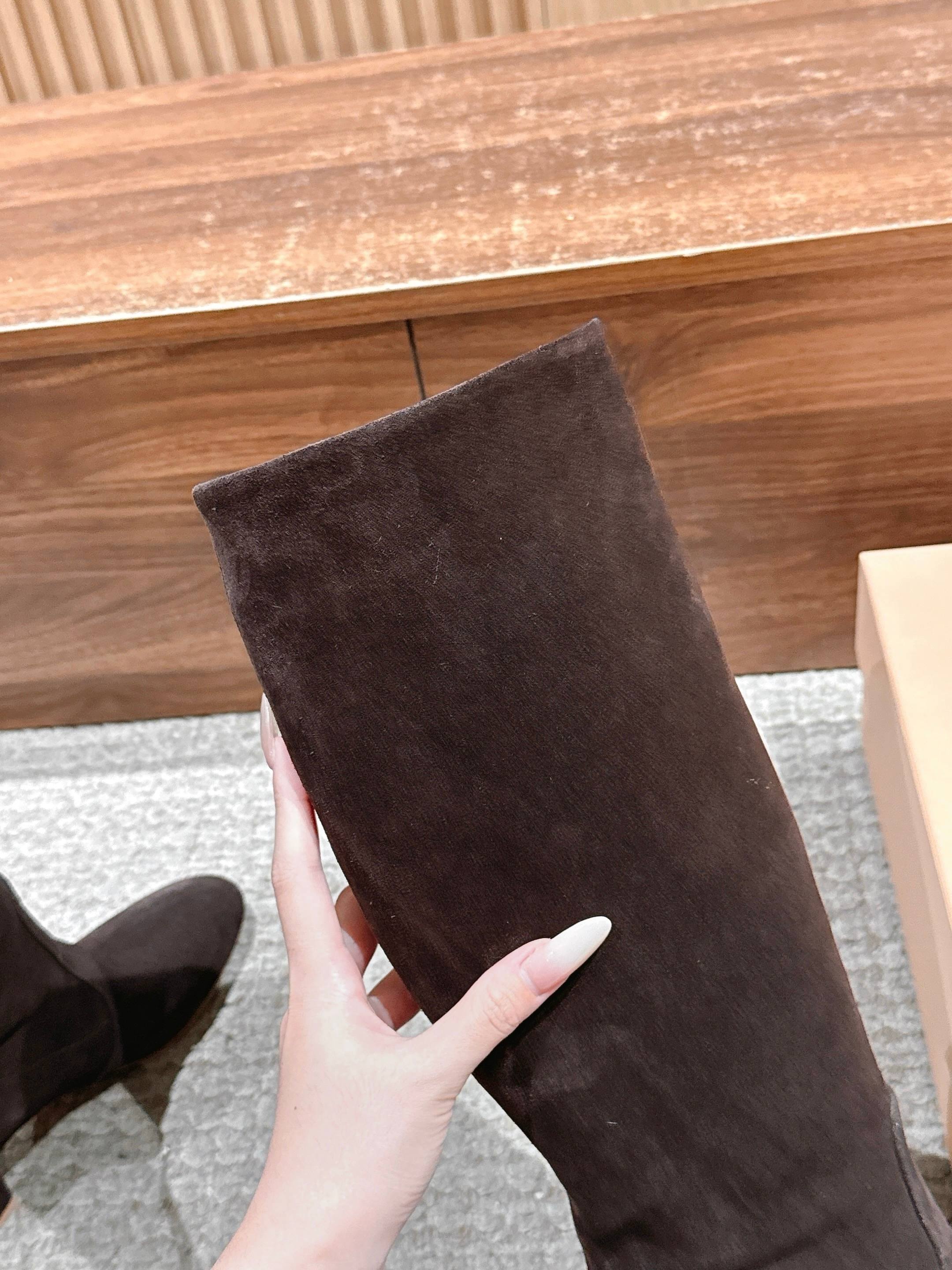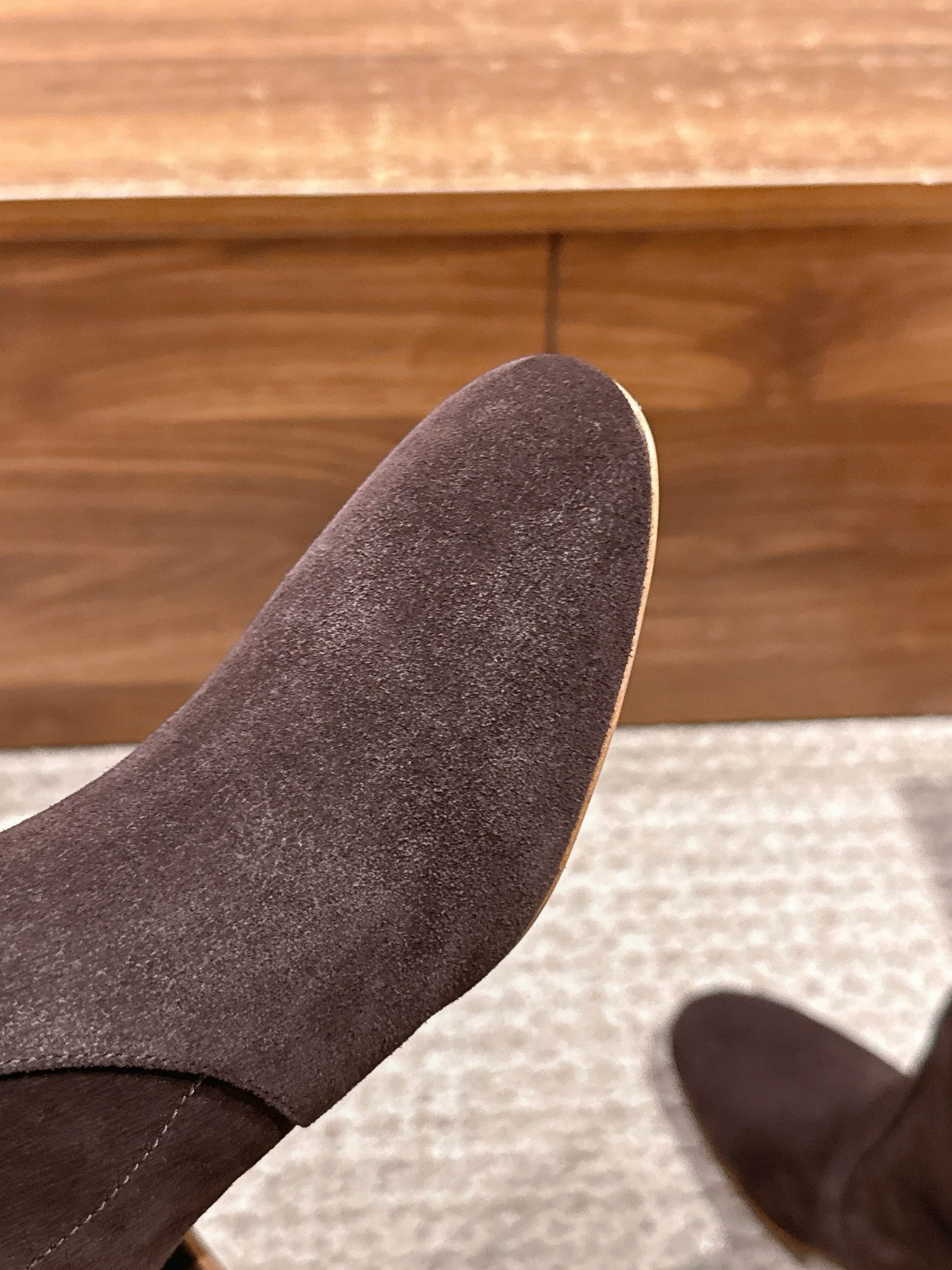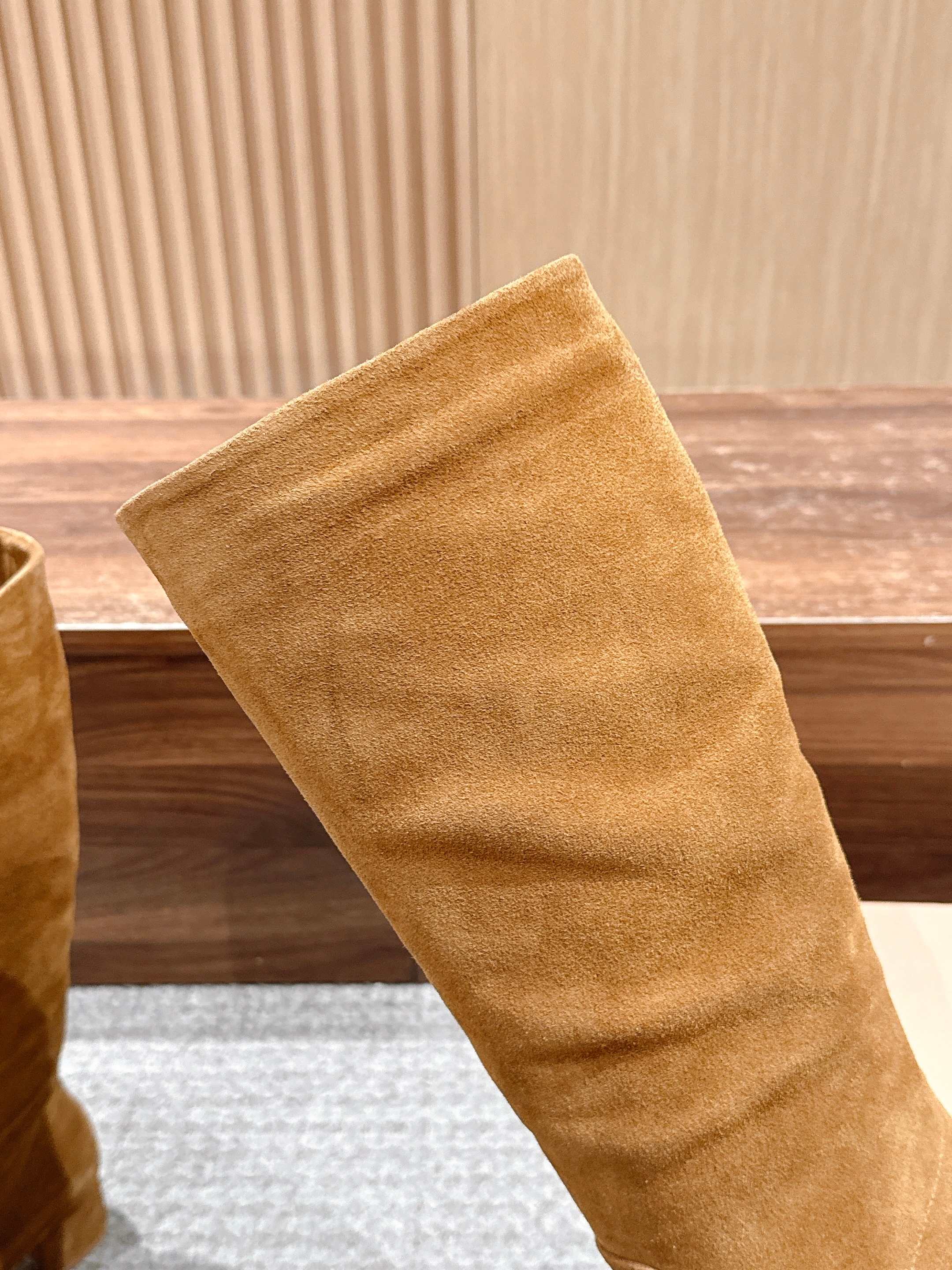 Gianvito Rossi 复古麂皮高跟堆堆靴 采用绒面革材质,质感细腻,呈现出高级的哑光效果,且不同颜色的绒面革在视觉和触觉上都极具质感。高跟长靴,靴筒较高,能够很好地修饰腿部线条;鞋跟为粗跟设计,兼具稳定性与时尚感,提升气场的同时也保证了行走的舒适度。 鞋头为方头设计,简约大气,符合当下的时尚潮流,同时也能容纳不同脚型;整体设计简约利落,没有过多繁杂的装饰,凸显出经典与优雅的风格,易于搭配各种服饰,无论是裙装还是裤装都能展现出不俗的时尚品味。 鞋面:胎牛反绒 内里:单里 大底:真皮大底注塑 增高:9cm Size:35-41码(40/41订做不退换)