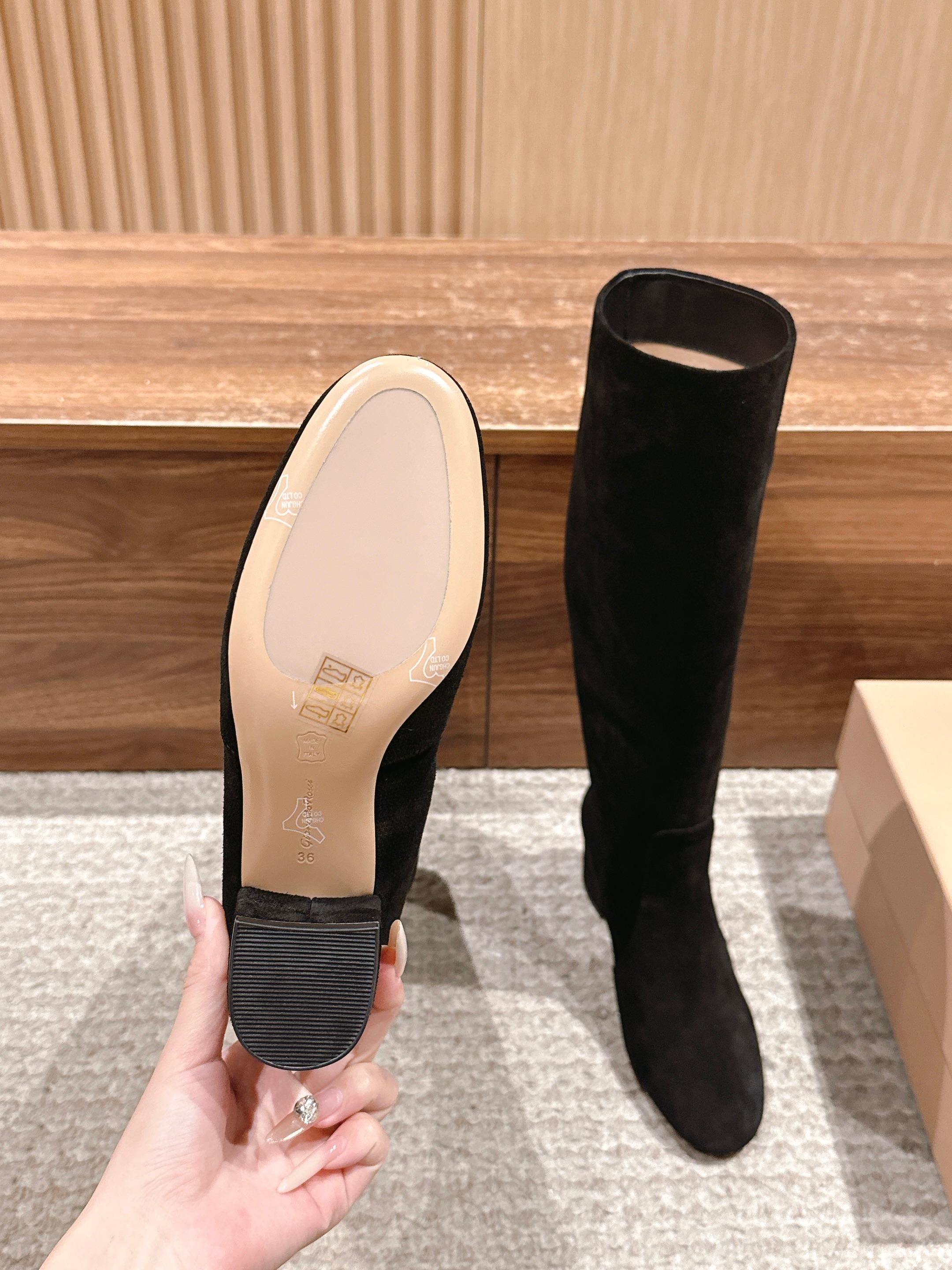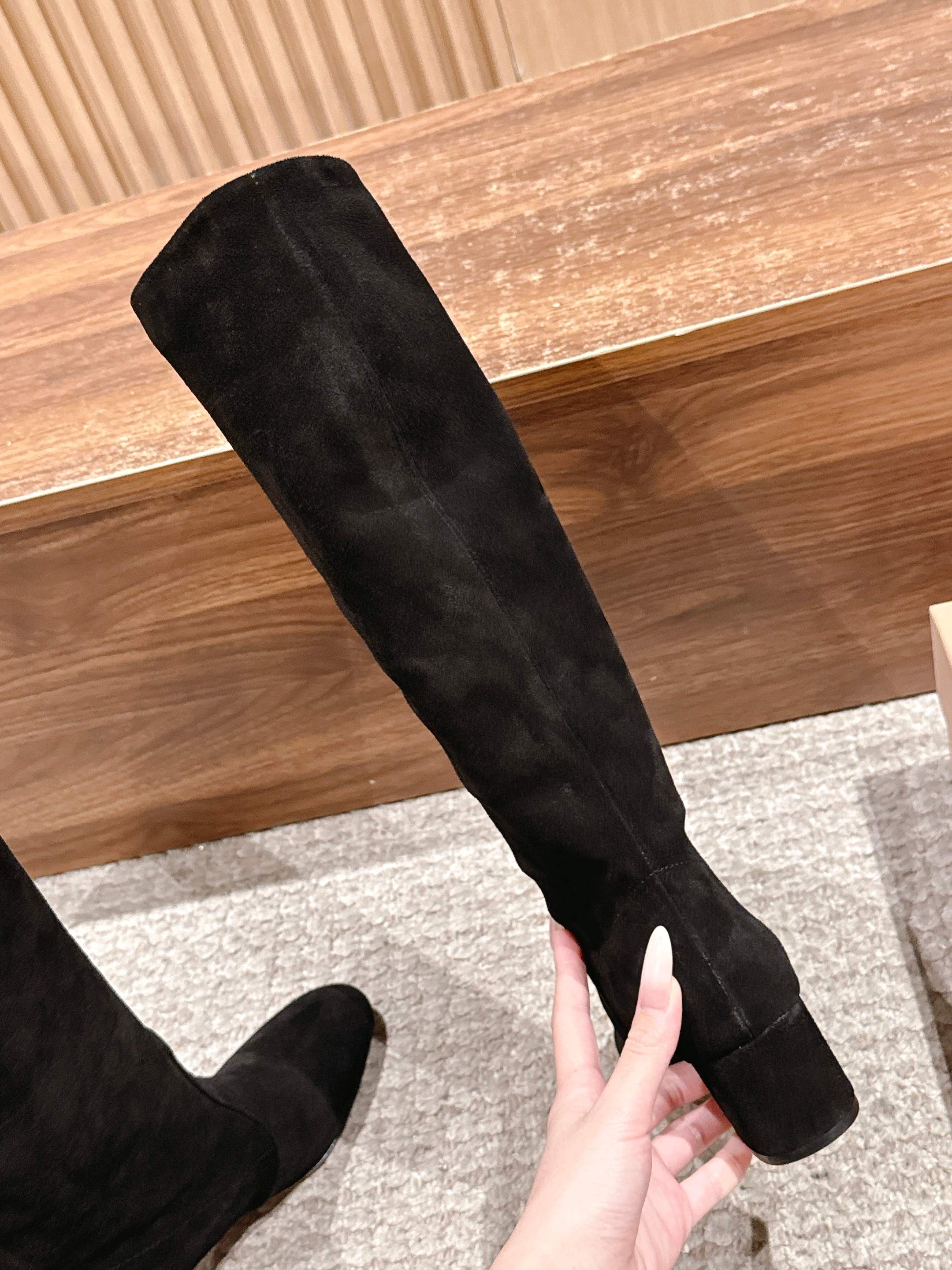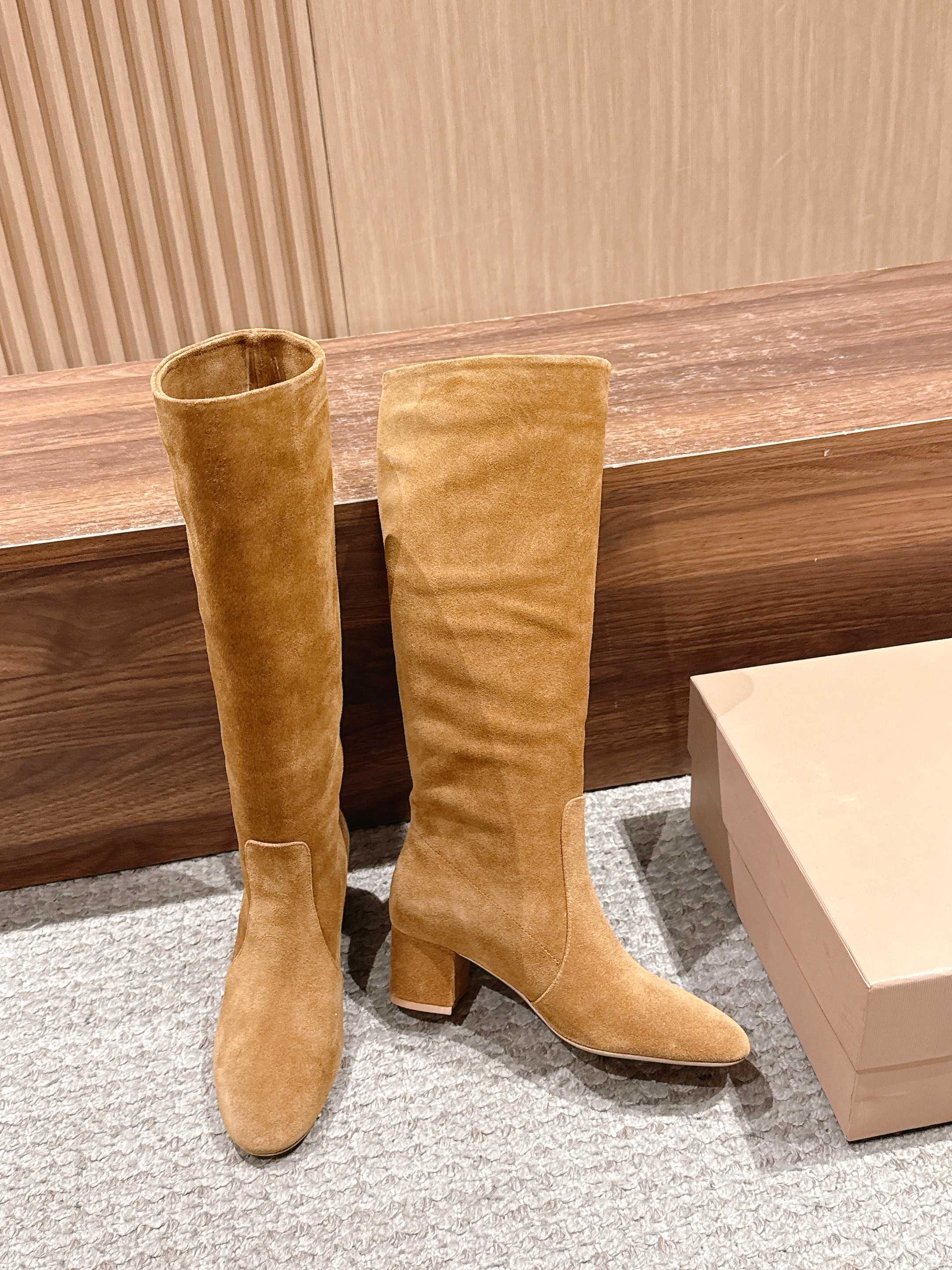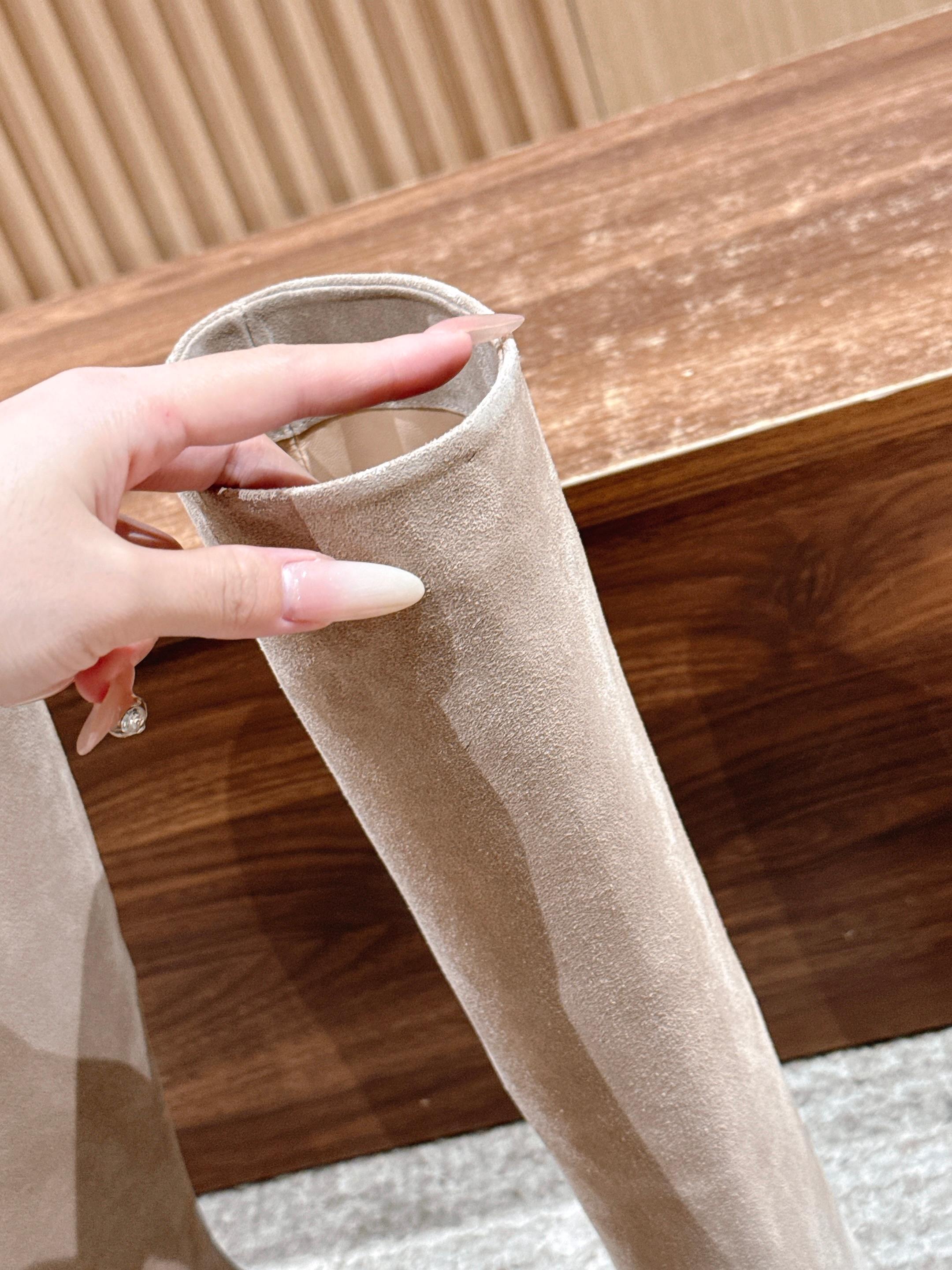 Gianvito Rossi 复古麂皮高跟堆堆靴 采用绒面革材质,质感细腻,呈现出高级的哑光效果,且不同颜色的绒面革在视觉和触觉上都极具质感。高跟长靴,靴筒较高,能够很好地修饰腿部线条;鞋跟为粗跟设计,兼具稳定性与时尚感,提升气场的同时也保证了行走的舒适度。 鞋头为方头设计,简约大气,符合当下的时尚潮流,同时也能容纳不同脚型;整体设计简约利落,没有过多繁杂的装饰,凸显出经典与优雅的风格,易于搭配各种服饰,无论是裙装还是裤装都能展现出不俗的时尚品味。 鞋面:胎牛反绒 内里:单里 大底:真皮大底注塑 增高:9cm Size:35-41码(40/41订做不退换)