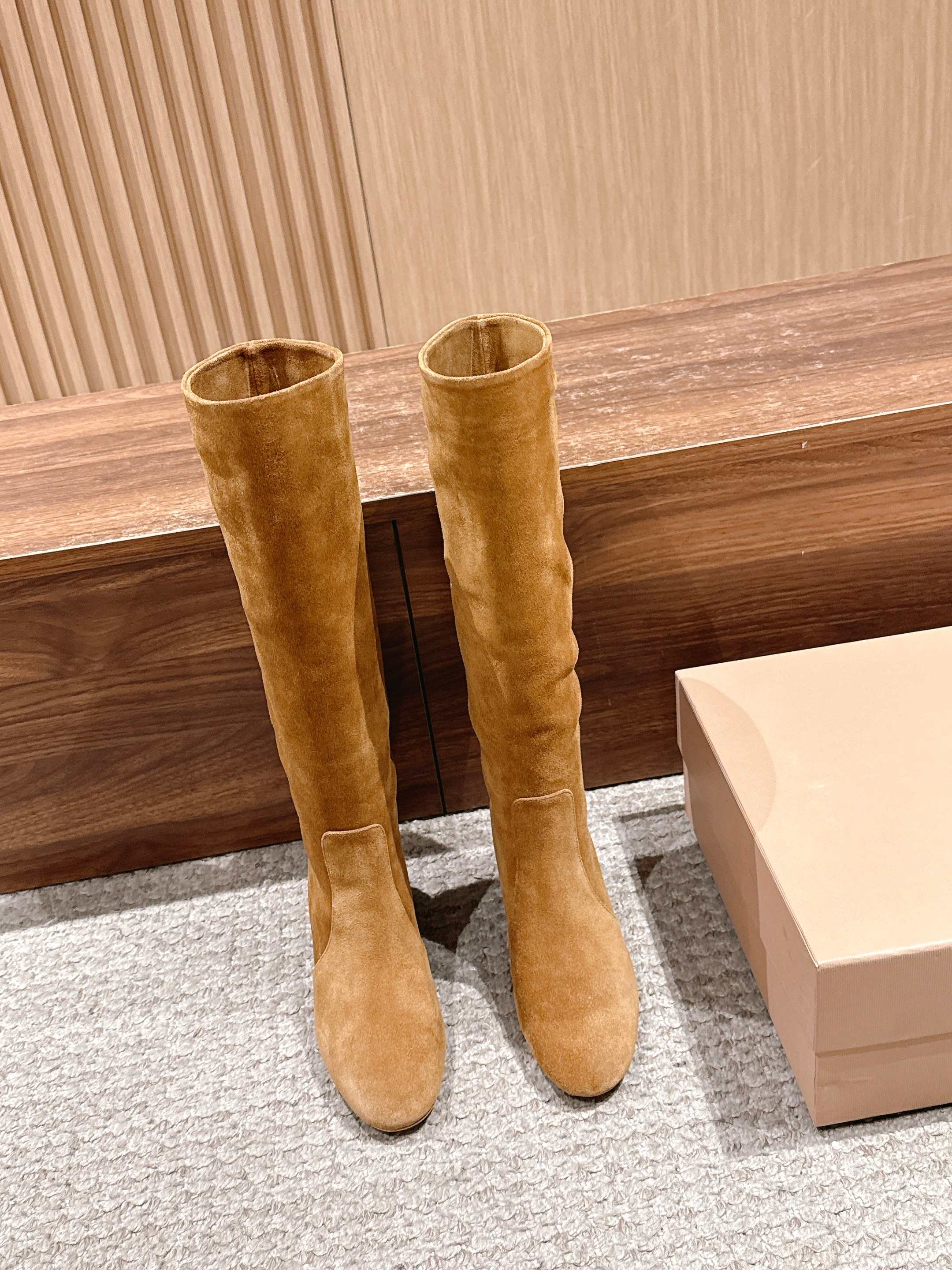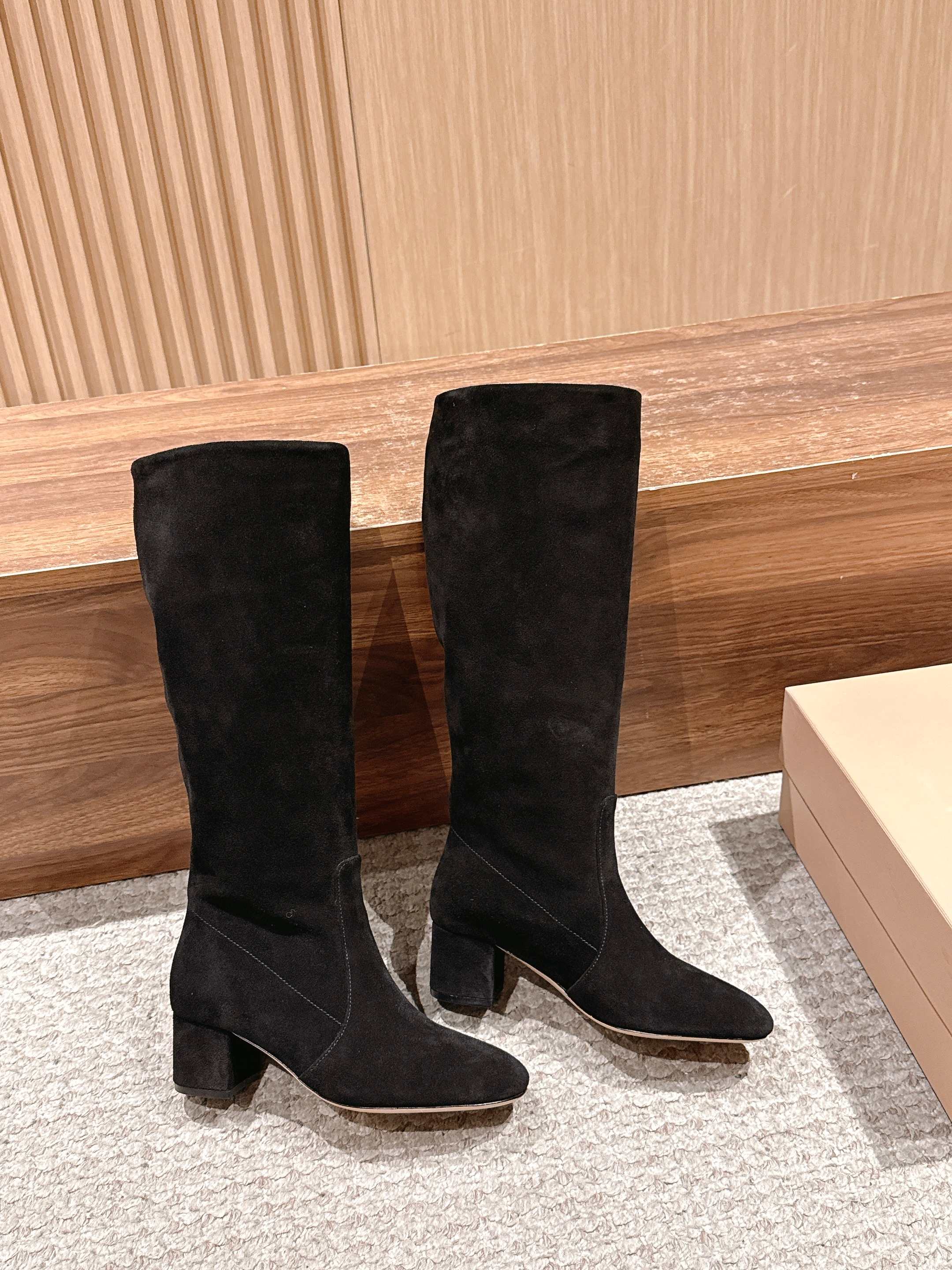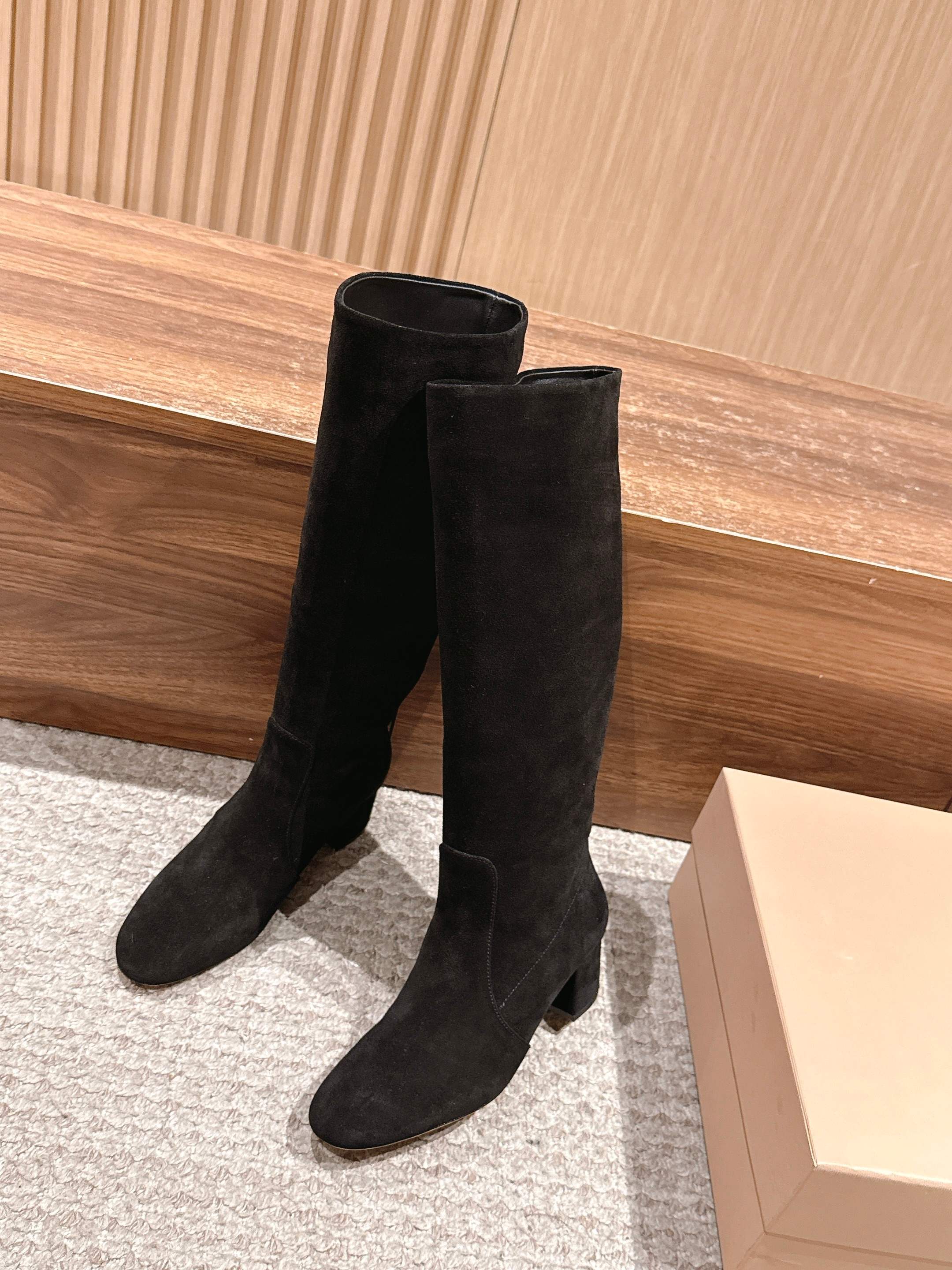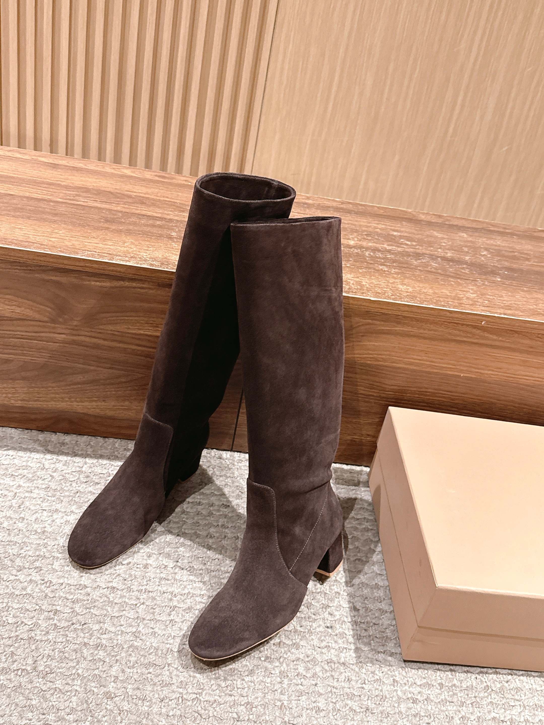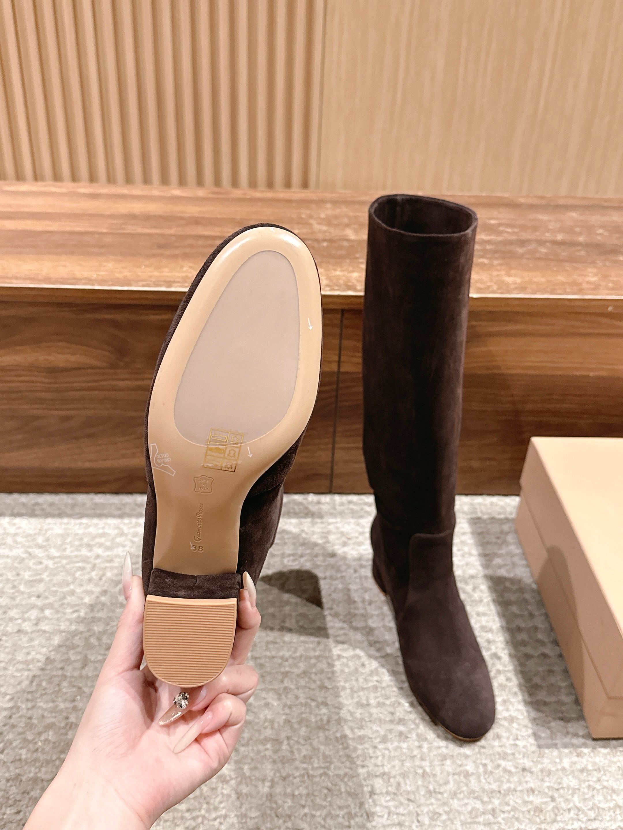 Gianvito Rossi 复古麂皮高跟堆堆靴 采用绒面革材质,质感细腻,呈现出高级的哑光效果,且不同颜色的绒面革在视觉和触觉上都极具质感。高跟长靴,靴筒较高,能够很好地修饰腿部线条;鞋跟为粗跟设计,兼具稳定性与时尚感,提升气场的同时也保证了行走的舒适度。 鞋头为方头设计,简约大气,符合当下的时尚潮流,同时也能容纳不同脚型;整体设计简约利落,没有过多繁杂的装饰,凸显出经典与优雅的风格,易于搭配各种服饰,无论是裙装还是裤装都能展现出不俗的时尚品味。 鞋面:胎牛反绒 内里:单里 大底:真皮大底注塑 增高:9cm Size:35-41码(40/41订做不退换)