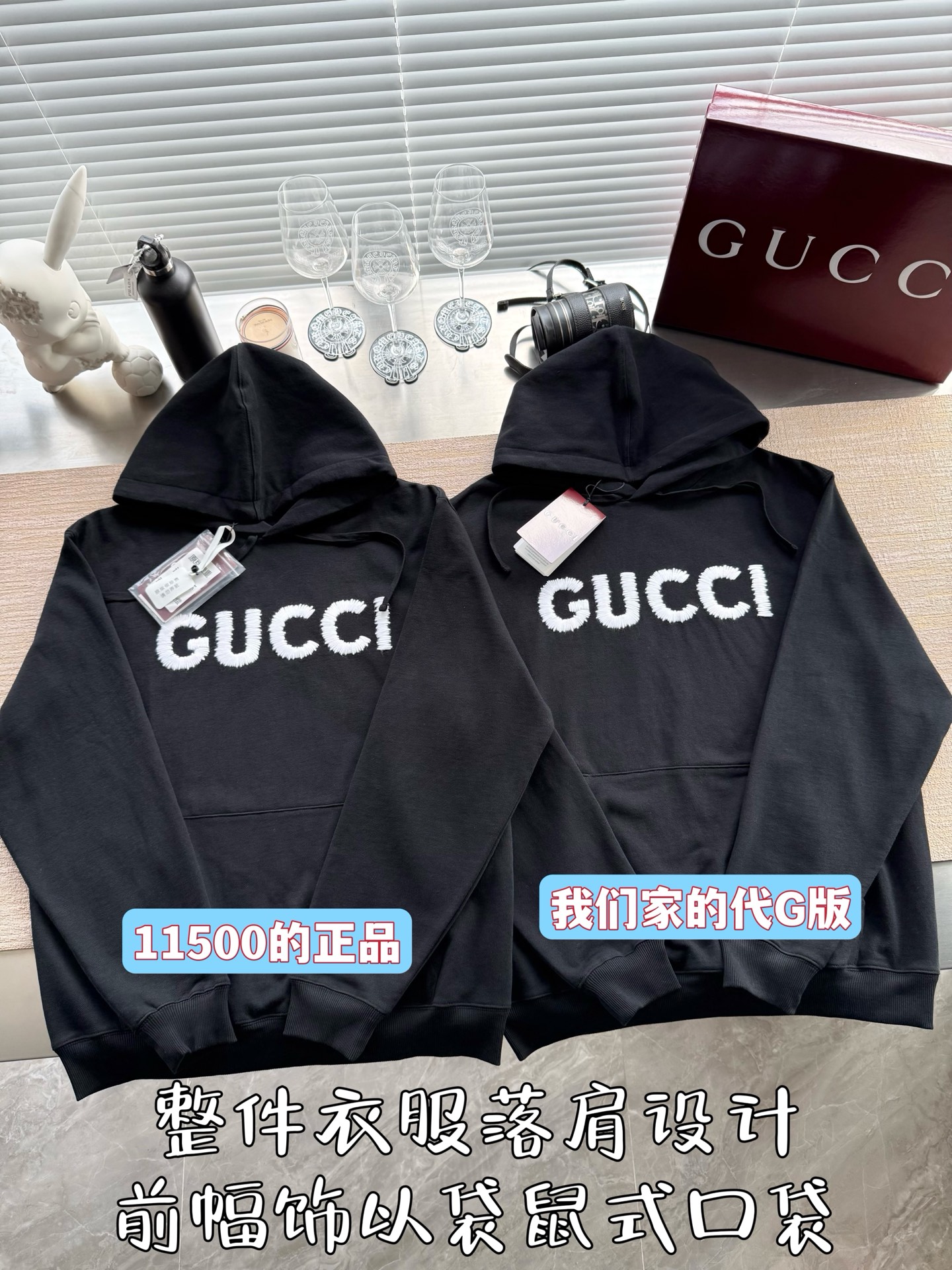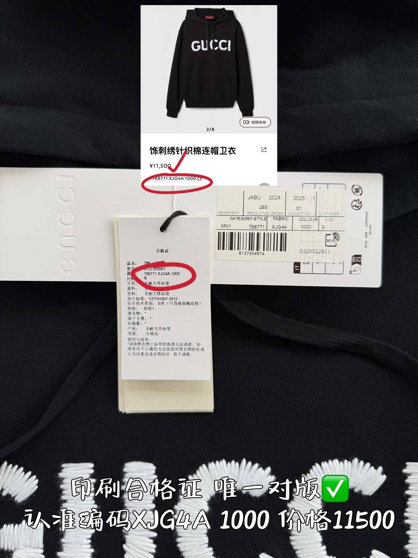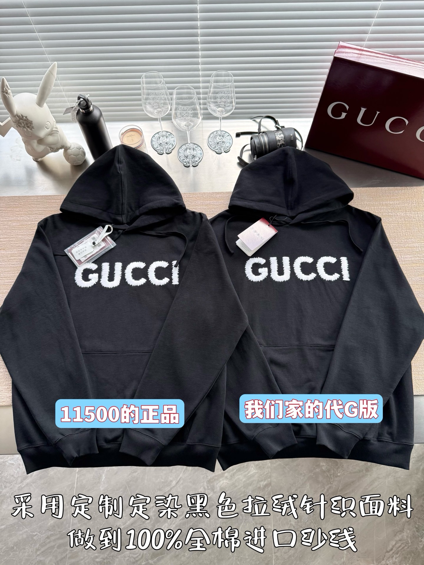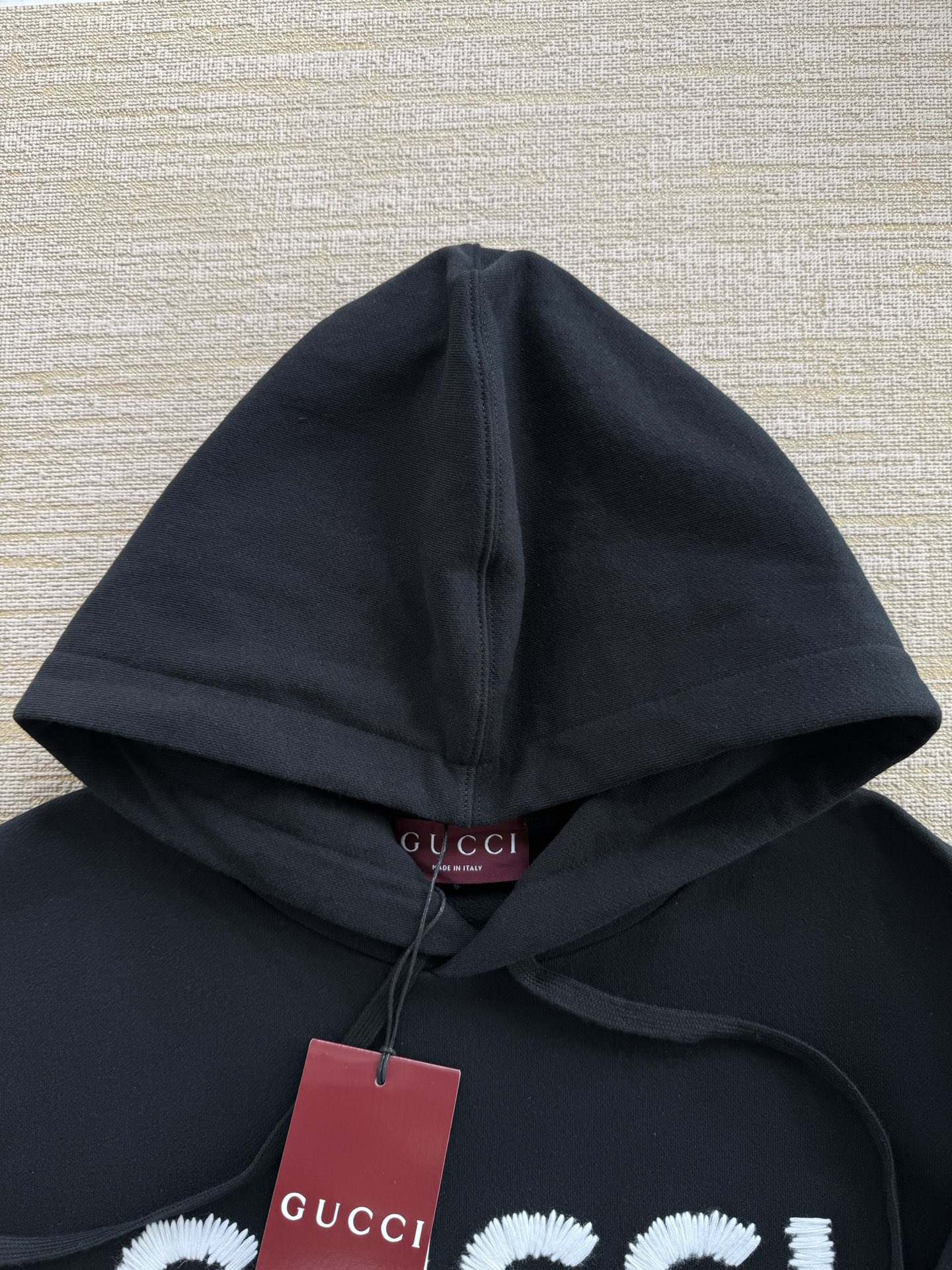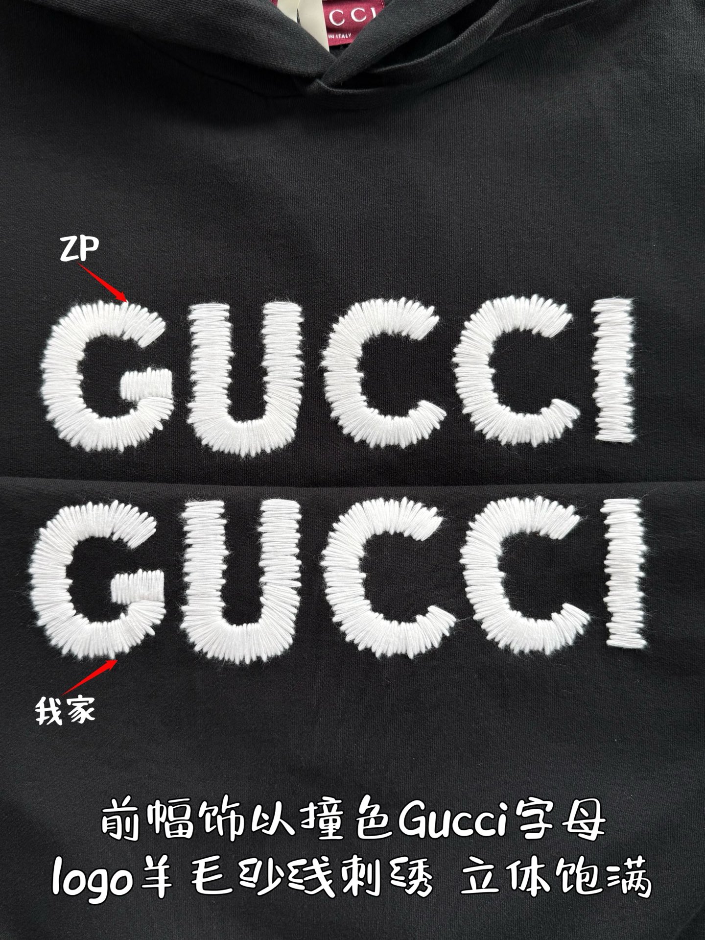 Gucci 2025 FW钩针刺绣logo连帽卫衣‼️整件衣服11500购买Zp拆解打造,定制黑色拉绒棉面料,做到100%全棉进口纱线,连帽抽绳设计,前幅饰以GUCCI羊毛纱线刺绣,定制标志性罗纹袖口 下摆,罗纹做到清晰立体,真正做到1:1copy 闭眼入