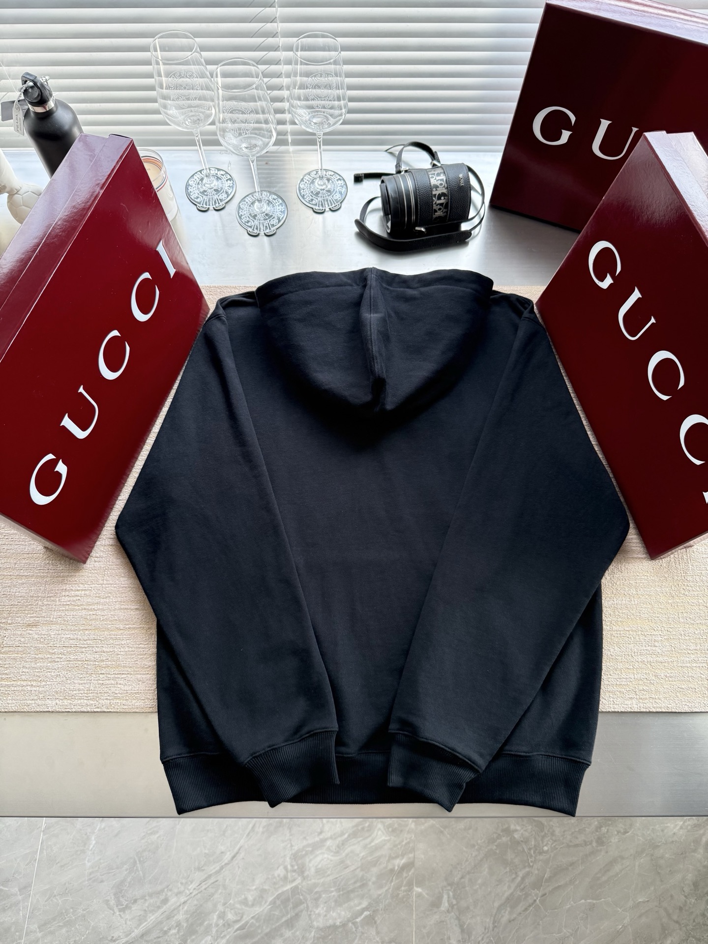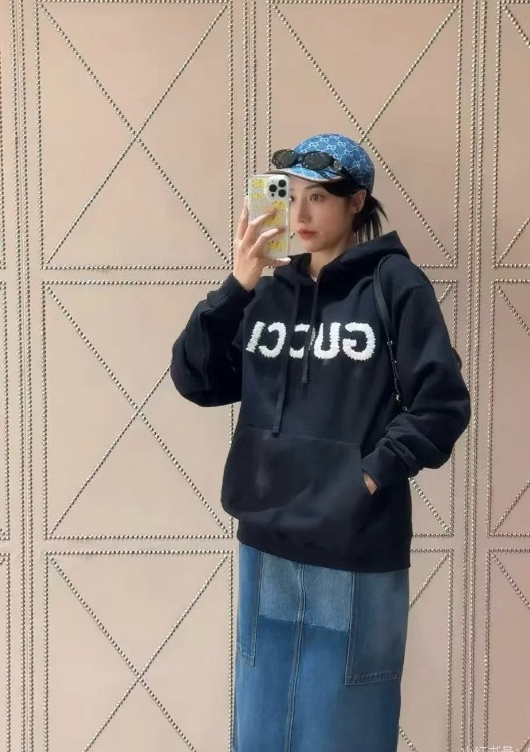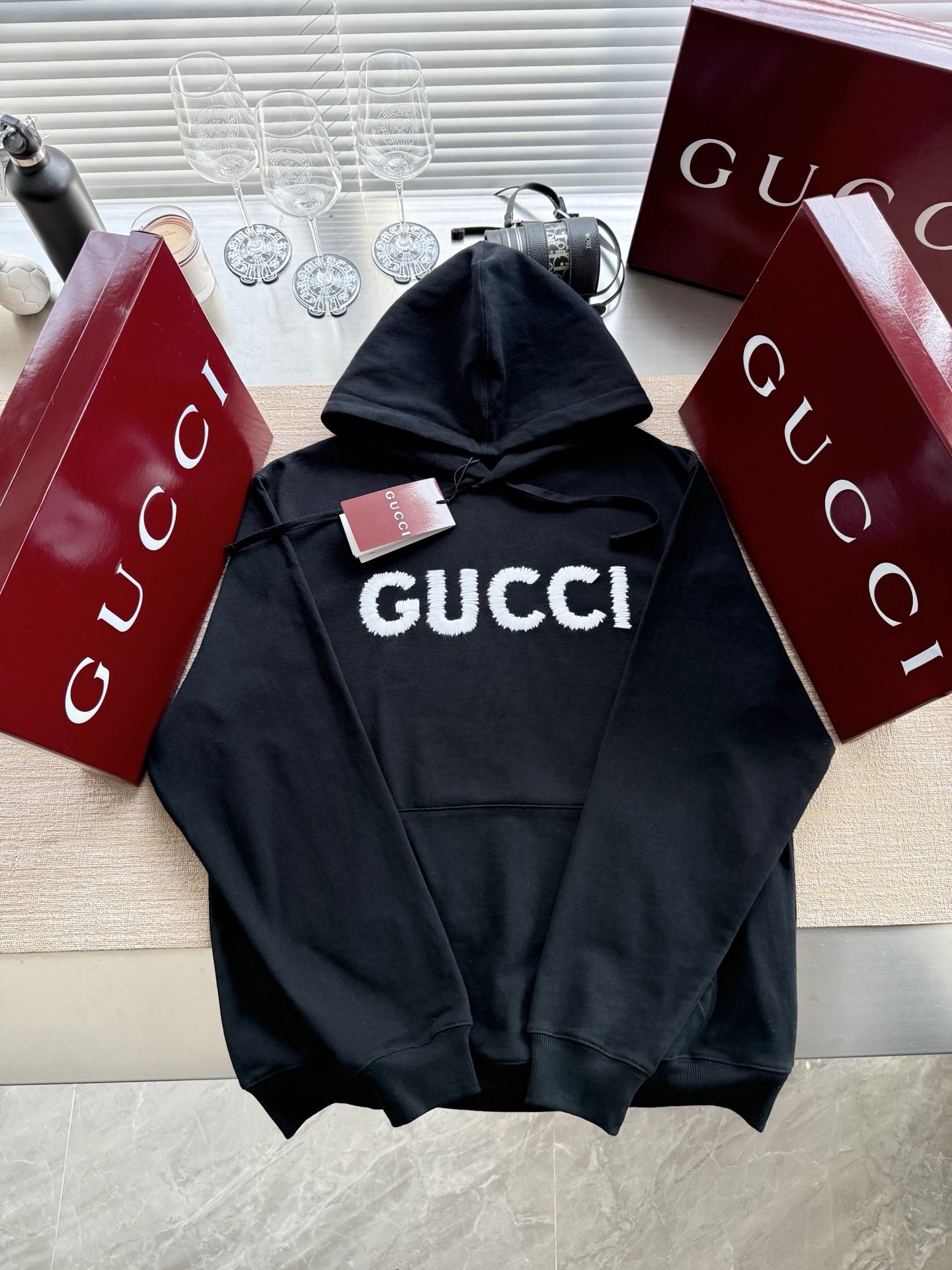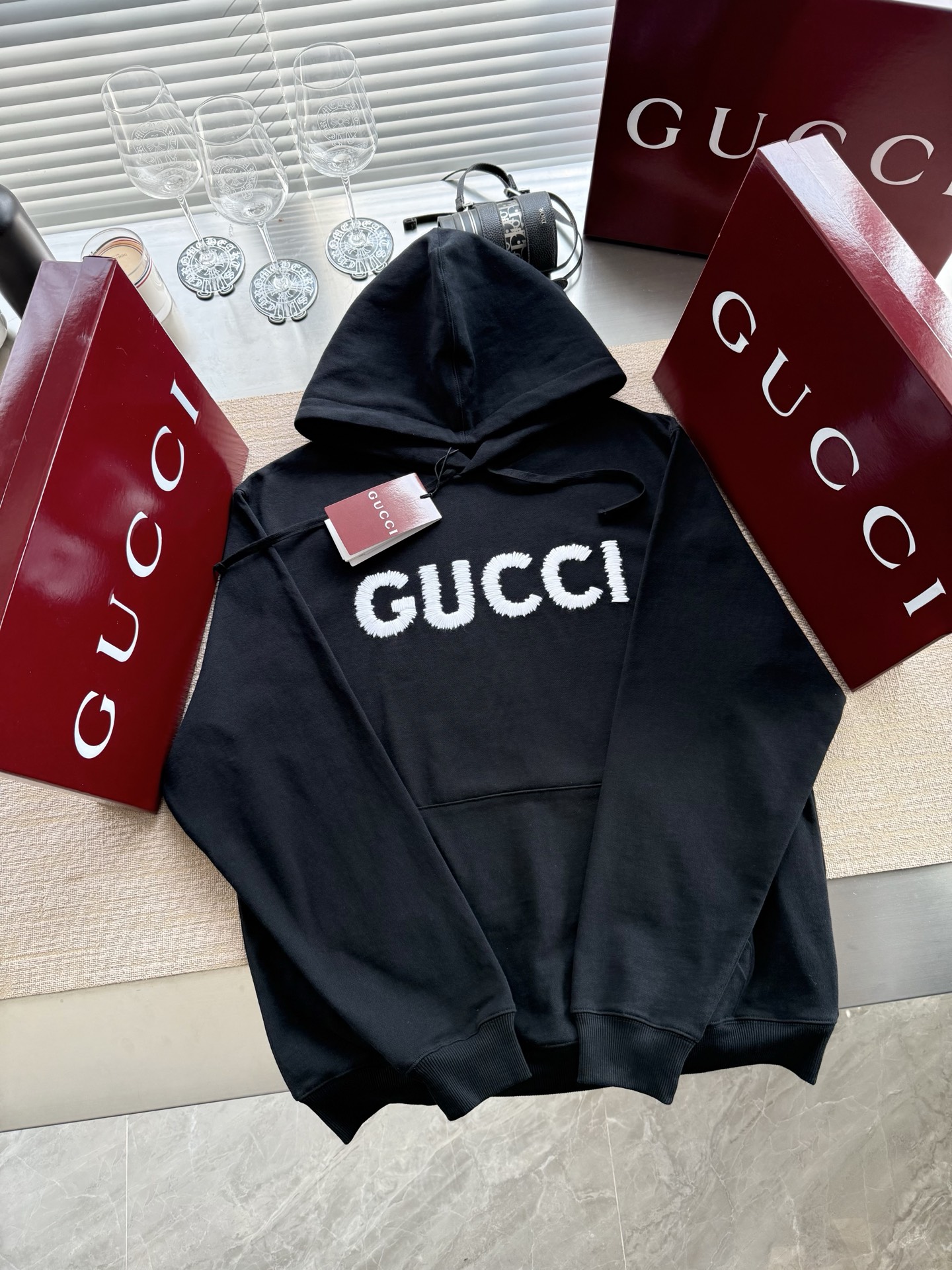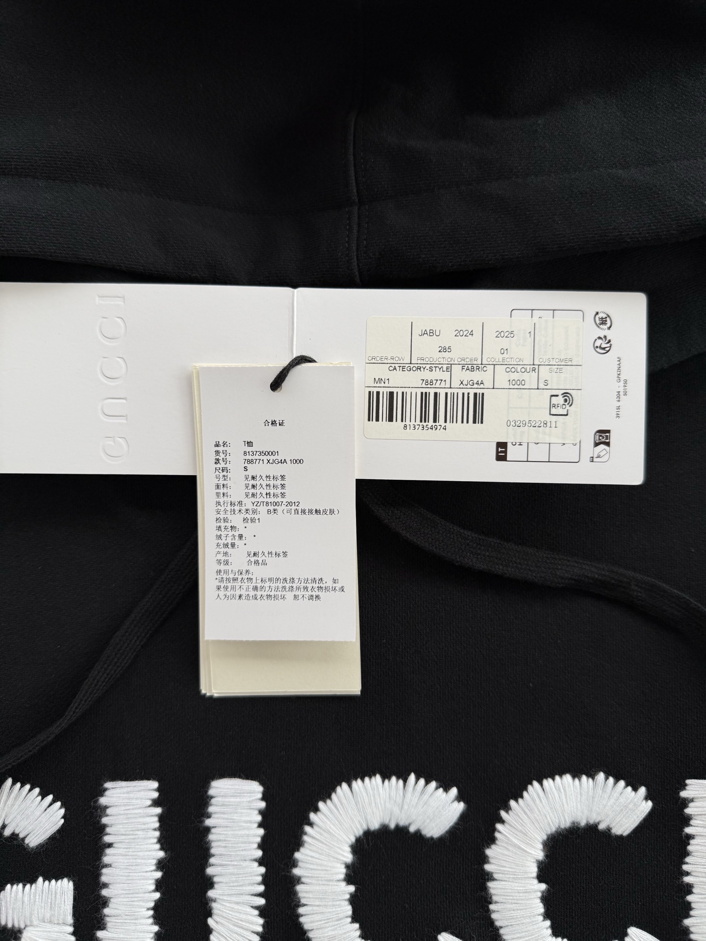 Gucci 2025 FW钩针刺绣logo连帽卫衣‼️整件衣服11500购买Zp拆解打造,定制黑色拉绒棉面料,做到100%全棉进口纱线,连帽抽绳设计,前幅饰以GUCCI羊毛纱线刺绣,定制标志性罗纹袖口 下摆,罗纹做到清晰立体,真正做到1:1copy 闭眼入