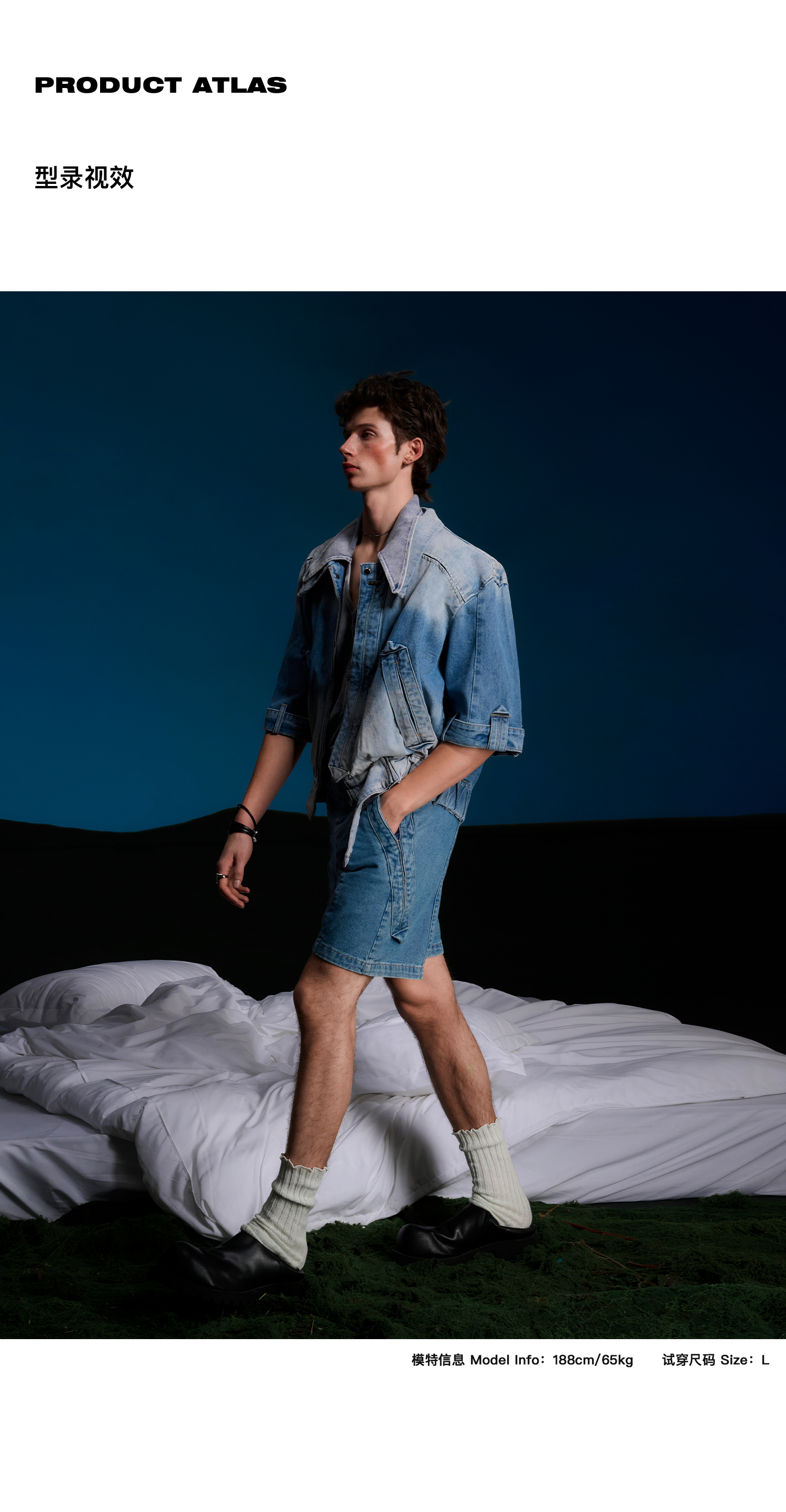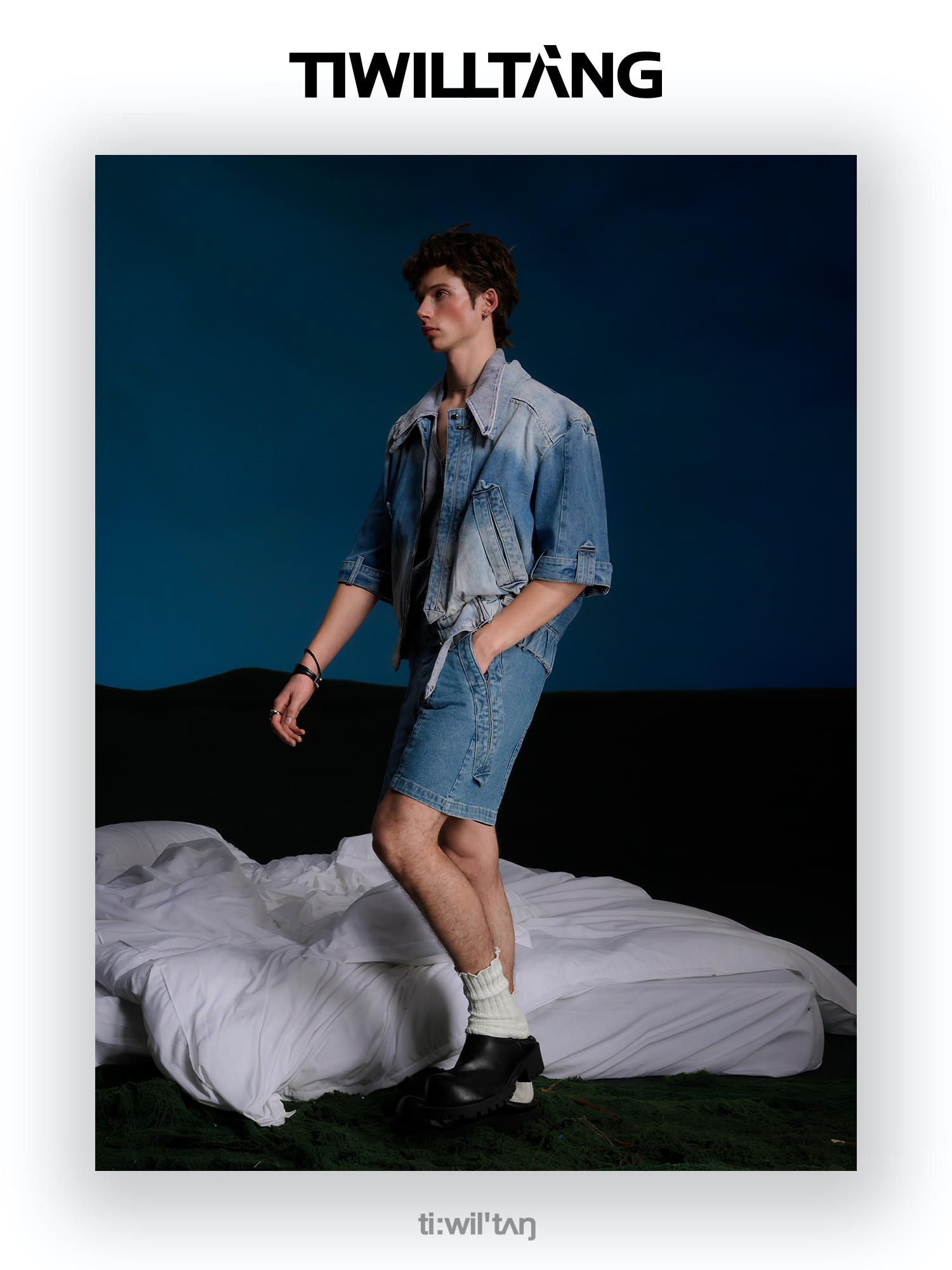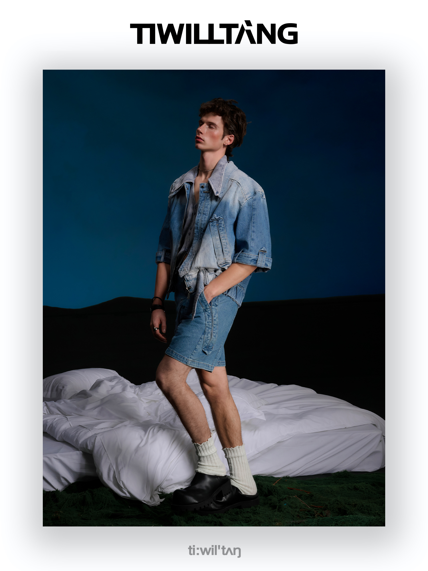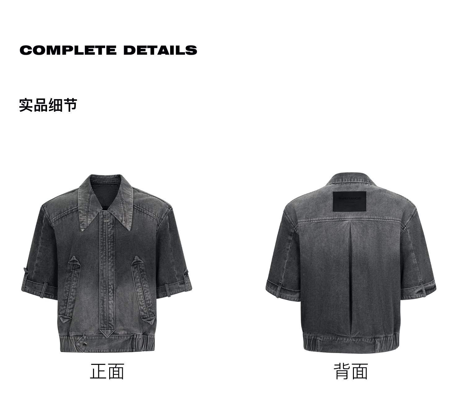 启世录TIWILLTANG“爵域迹铭”三角折边水洗做旧短袖牛仔夹克男
