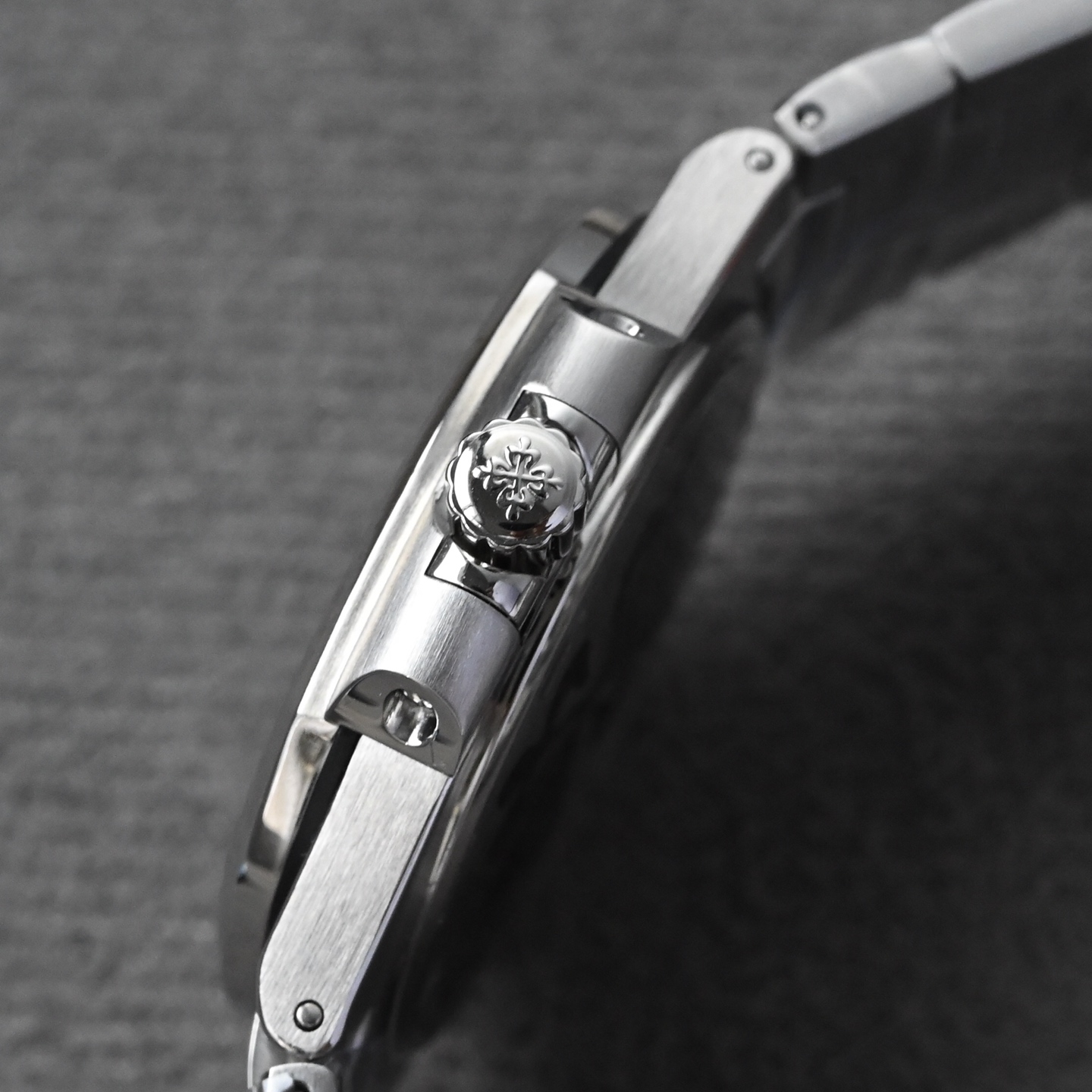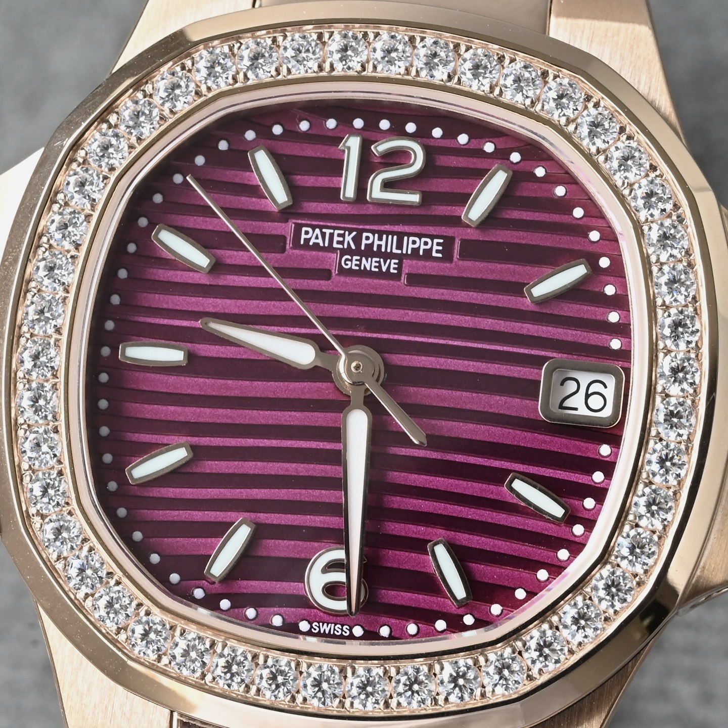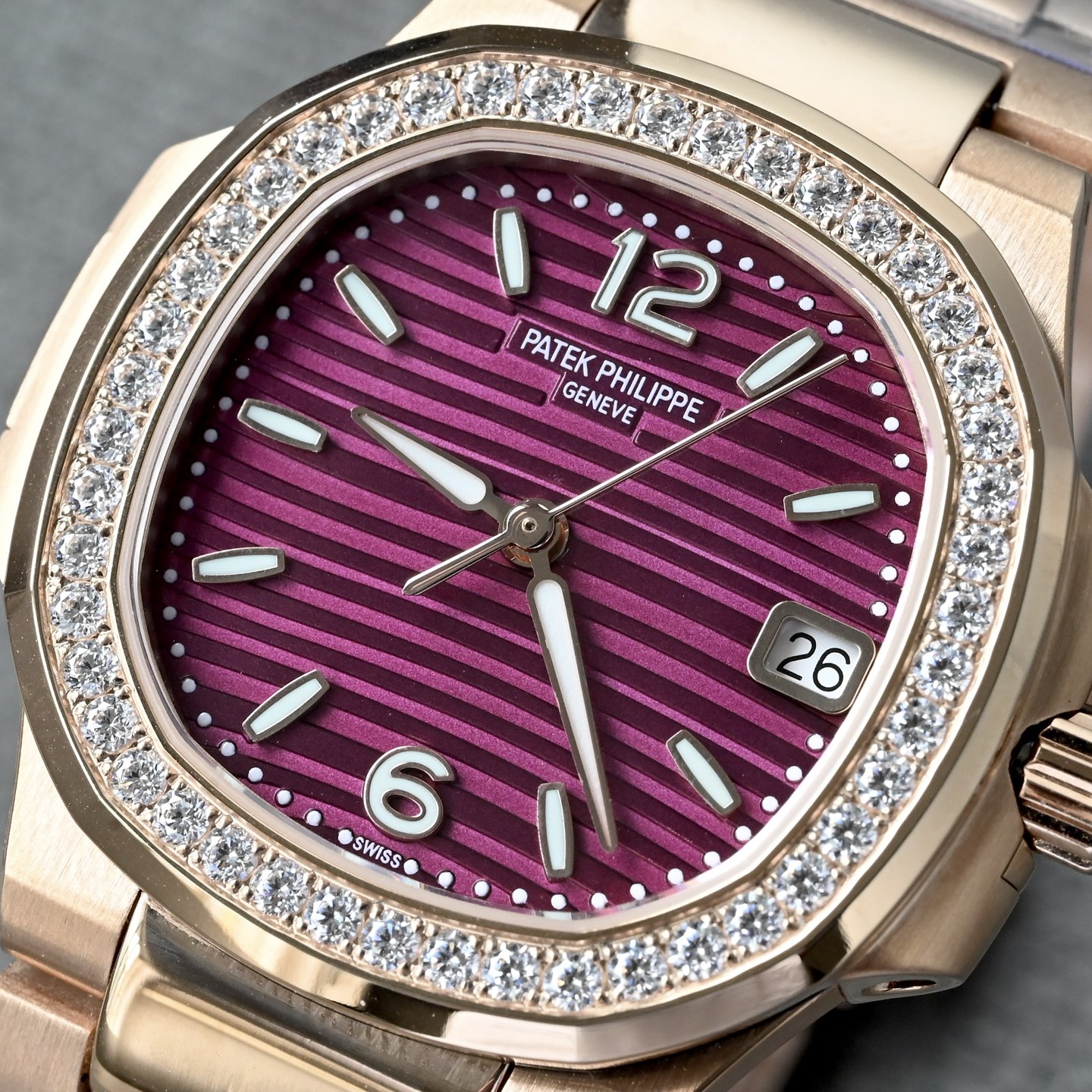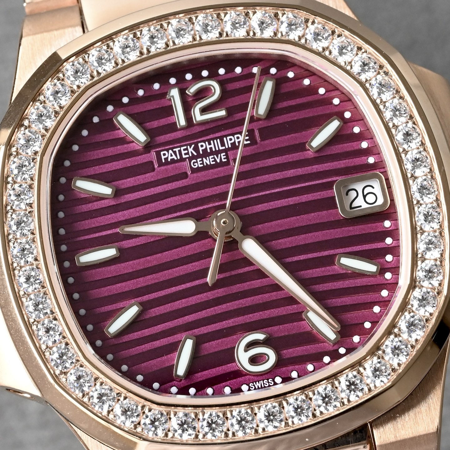 表盘工艺在色彩处理与装饰技术上的精湛水准。这款表盘采用独特的紫色调,结合百达翡丽标志性的横向浮雕纹路("晴空纹"或"海波纹"),在不同光线角度下呈现出渐变的光影效果。 表盘以黄铜为基板,经过精密冲压成型,确保表盘的整体结构稳定性和精准度,紫色调通过多层PVD(物理气相沉积)镀膜技术实现,确保颜色均匀。表盘上的标志性横向纹路由精密蚀刻或激光雕刻工艺制成,每条纹路的宽度、深度和间距均严格遵循原版标准。表盘颜色的特殊之处在于,其纹路在光线下会呈现微妙的色彩变化,不同的光线和角度会呈现不同的深浅颜色,增强视觉层次感。表盘上的品牌Logo、时标和"Swiss Made"字样均采用高精度移印工艺(法语"Décalque"),确保字体边缘锐利无毛边。时标和指针填充瑞士Super-LumiNova夜光材料,确保夜间读时清晰。紫色表盘的特殊调色需与夜光涂层协调,避免色彩冲突,确保整体美学一致性。