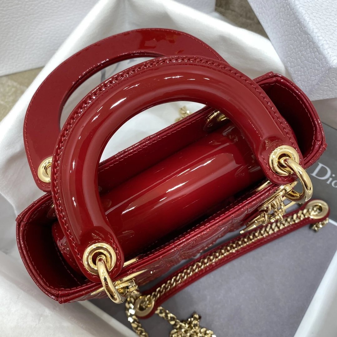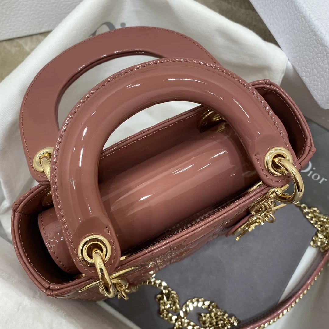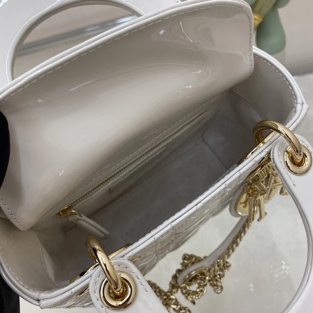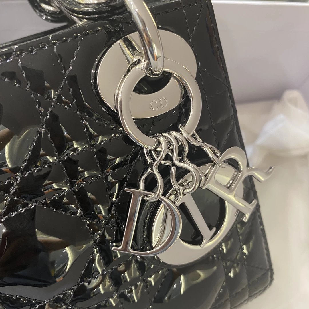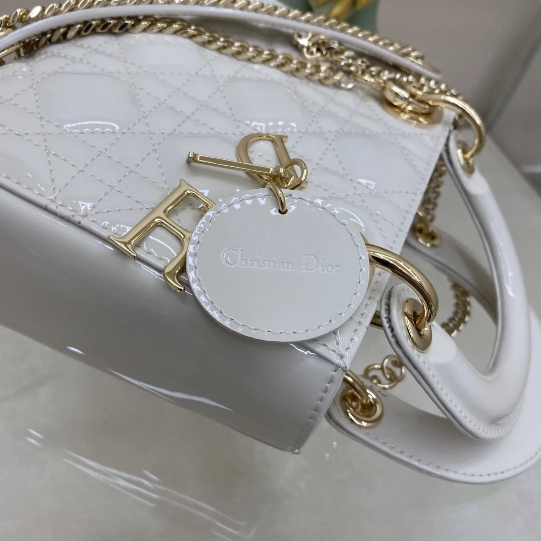这款 Lady Dior 手袋集中体现了 Dior 对典雅和美丽的深刻洞见。时髦且富有女性魅力,经久不衰却又现代时尚。这款手袋采用漆皮牛皮革精心制作,标志性的经典藤格纹针脚包覆,精良的缝制针法立即突显。标志性“D. I. O. R.”吊饰彰显其轮廓。这款迷你手袋采用可拆卸链条肩带