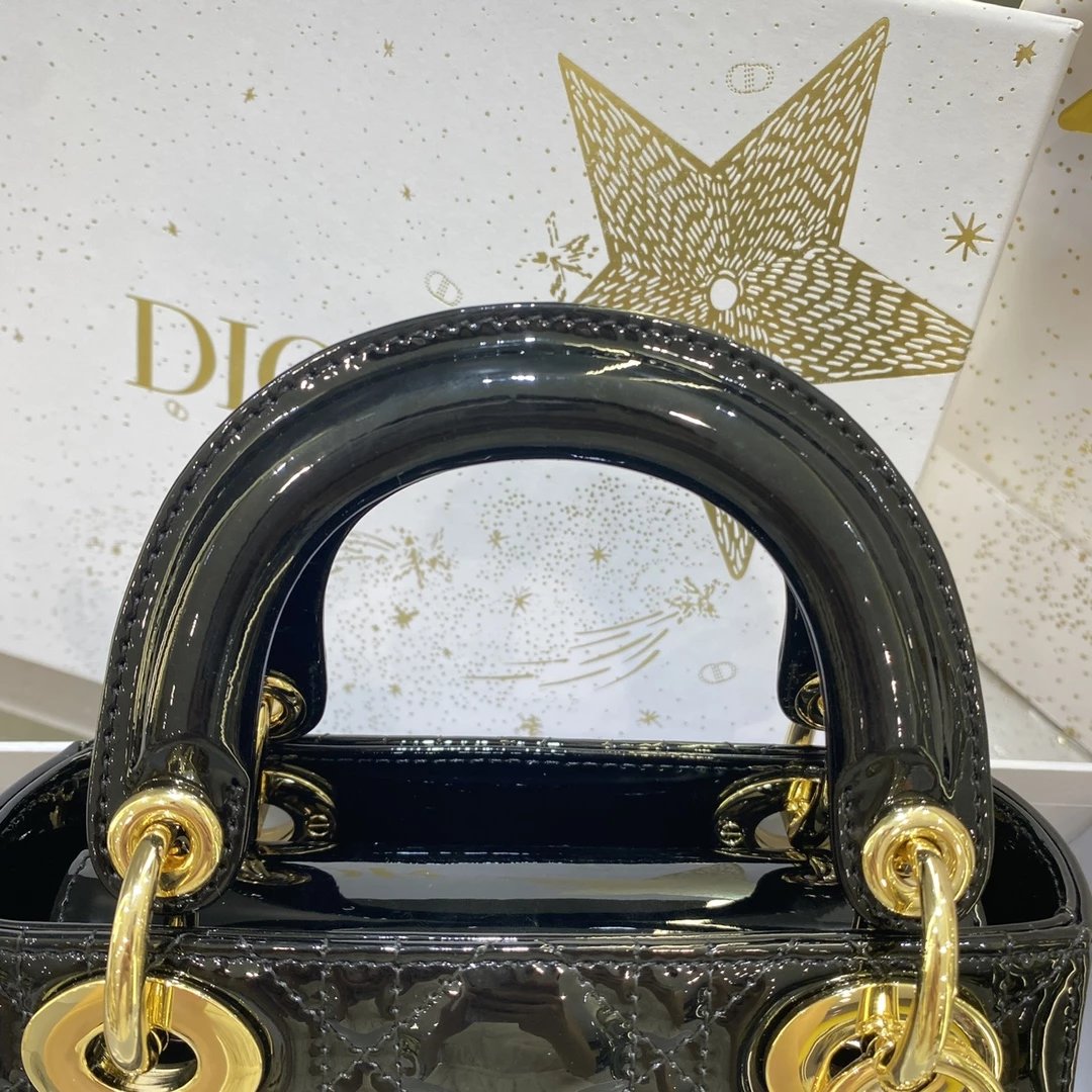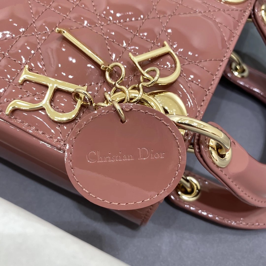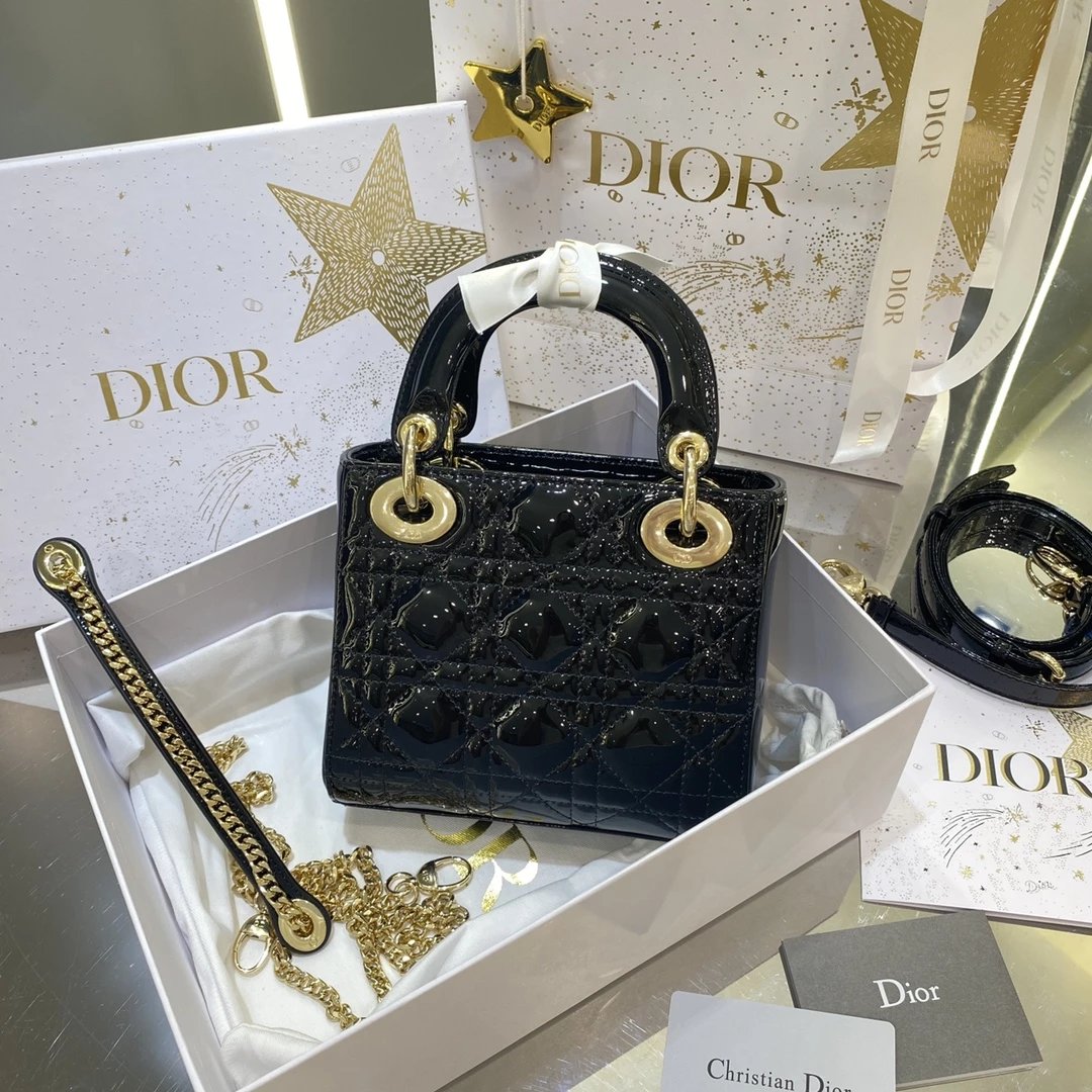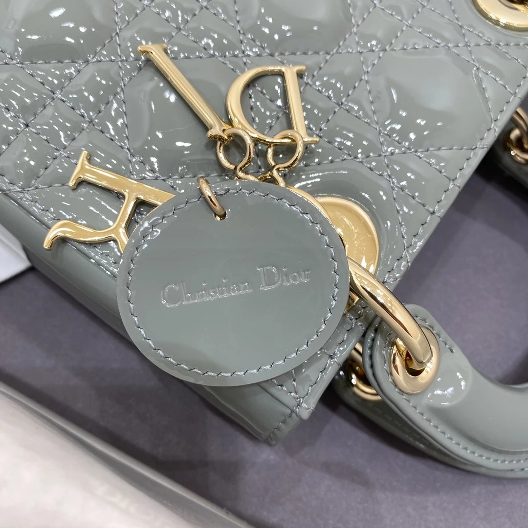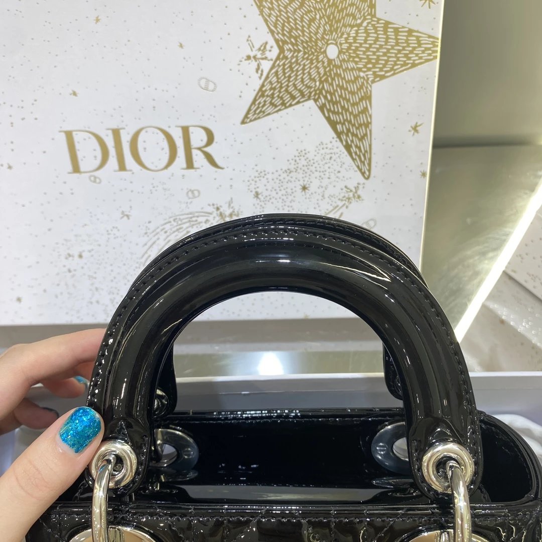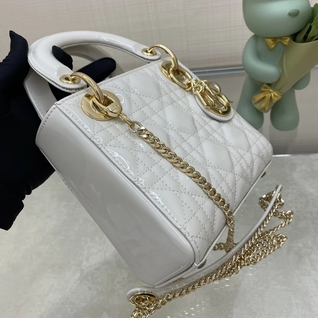 这款 Lady Dior 手袋集中体现了 Dior 对典雅和美丽的深刻洞见。时髦且富有女性魅力,经久不衰却又现代时尚。这款手袋采用漆皮牛皮革精心制作,标志性的经典藤格纹针脚包覆,精良的缝制针法立即突显。标志性“D. I. O. R.”吊饰彰显其轮廓。这款迷你手袋采用可拆卸链条肩带