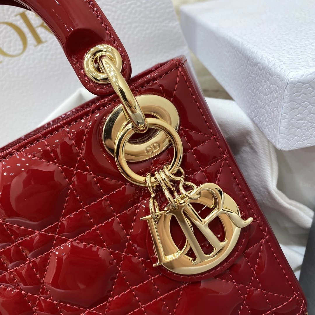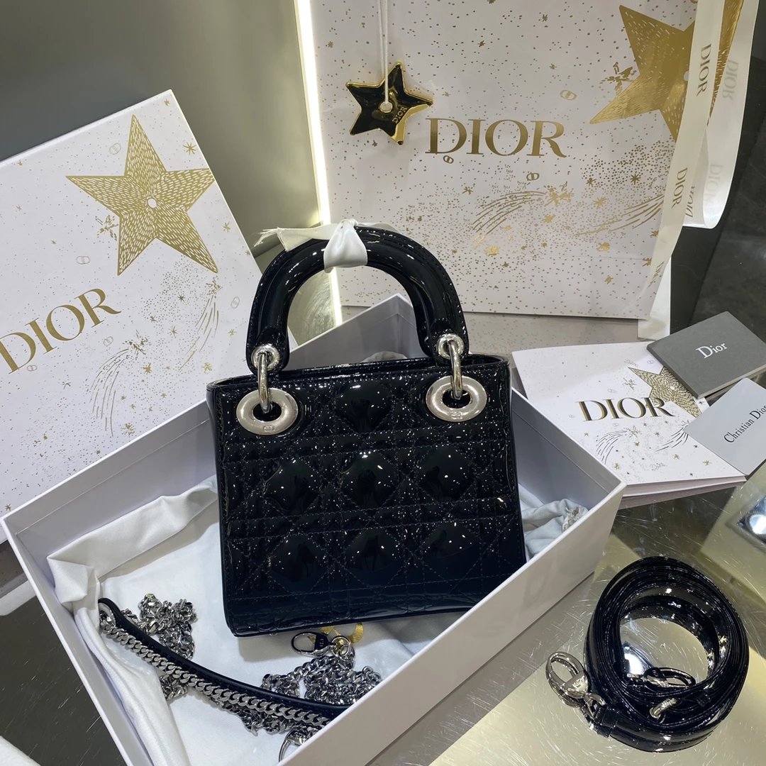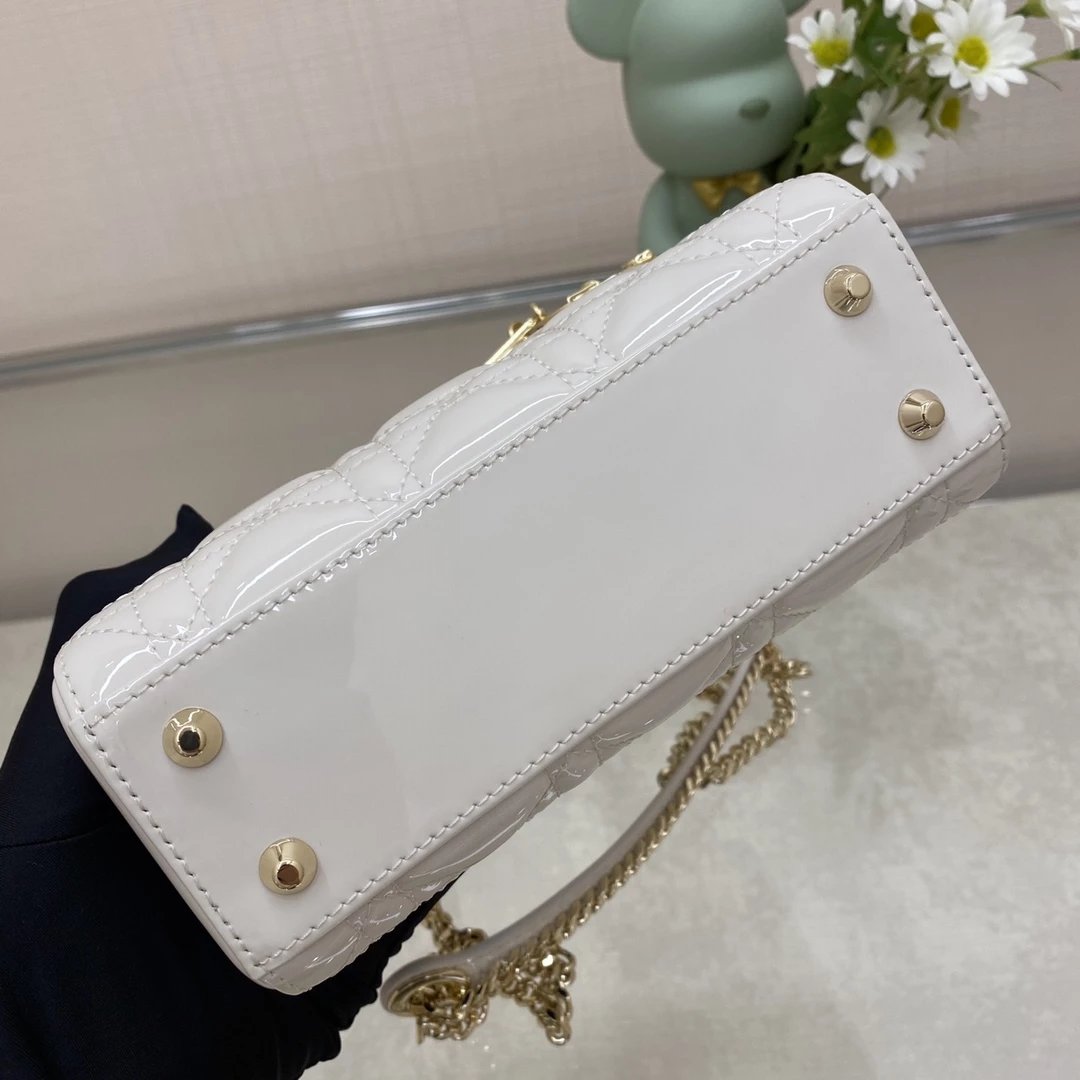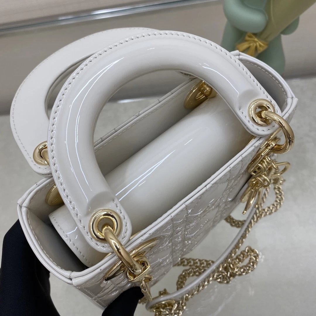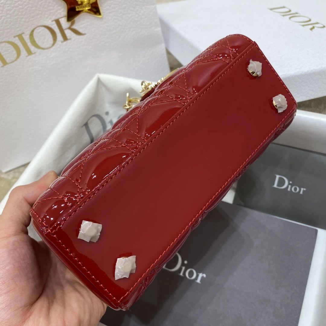 这款 Lady Dior 手袋集中体现了 Dior 对典雅和美丽的深刻洞见。时髦且富有女性魅力,经久不衰却又现代时尚。这款手袋采用漆皮牛皮革精心制作,标志性的经典藤格纹针脚包覆,精良的缝制针法立即突显。标志性“D. I. O. R.”吊饰彰显其轮廓。这款迷你手袋采用可拆卸链条肩带