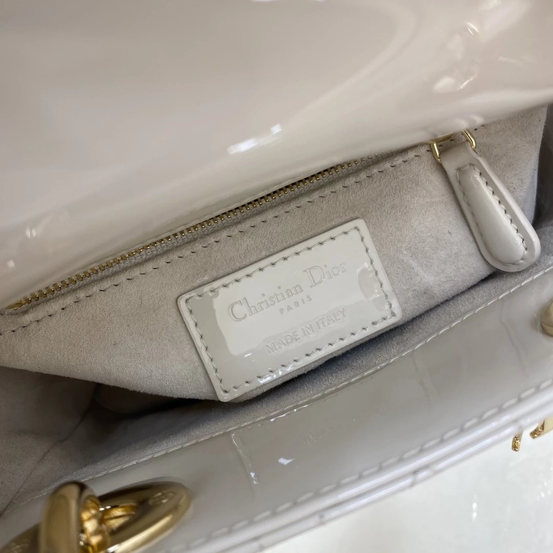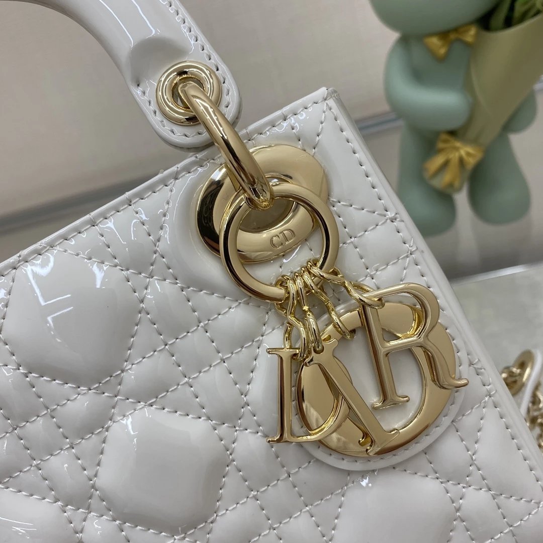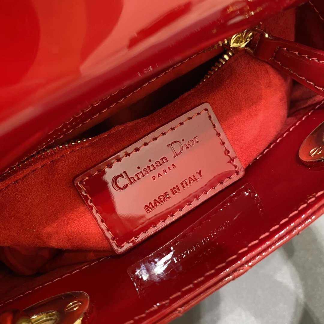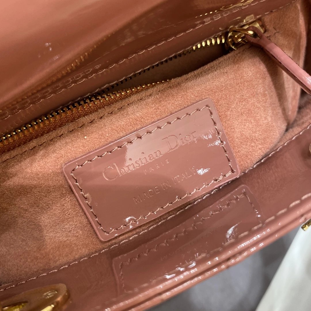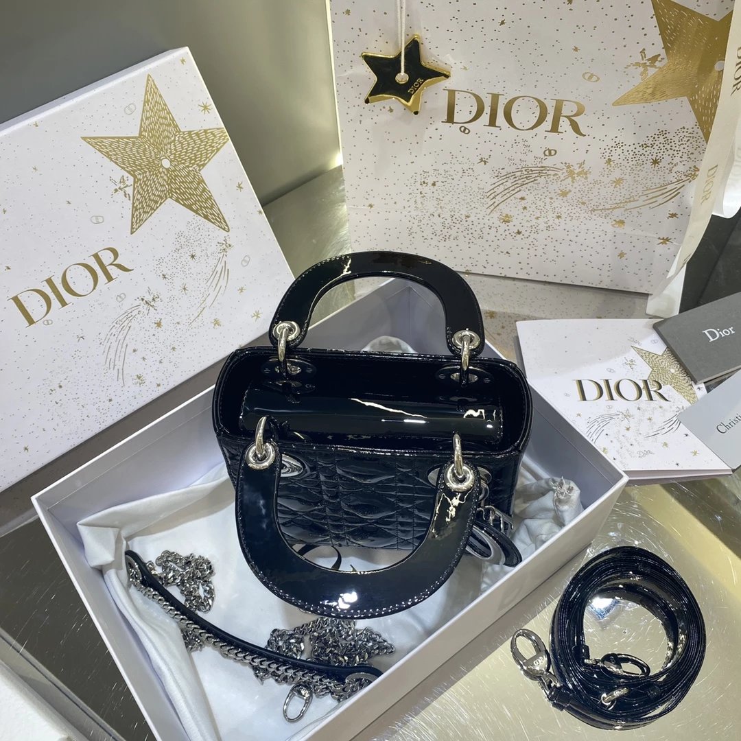 这款 Lady Dior 手袋集中体现了 Dior 对典雅和美丽的深刻洞见。时髦且富有女性魅力,经久不衰却又现代时尚。这款手袋采用漆皮牛皮革精心制作,标志性的经典藤格纹针脚包覆,精良的缝制针法立即突显。标志性“D. I. O. R.”吊饰彰显其轮廓。这款迷你手袋采用可拆卸链条肩带
