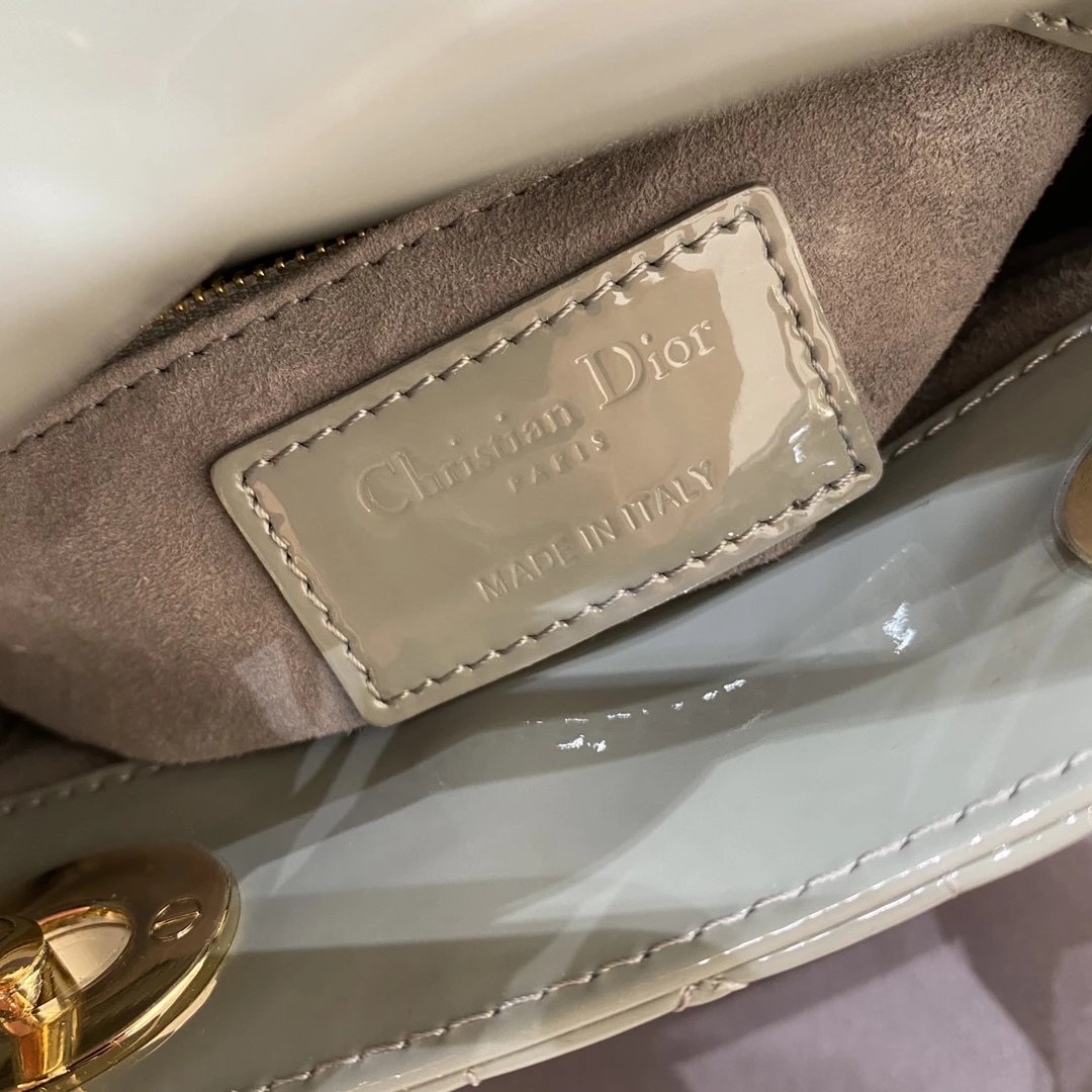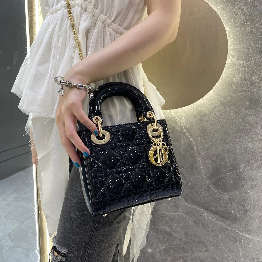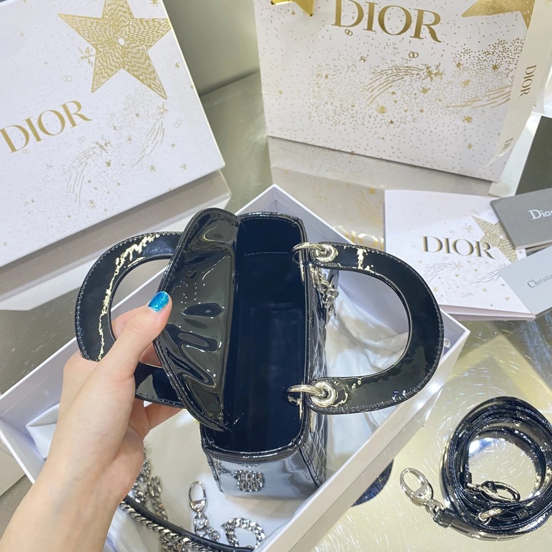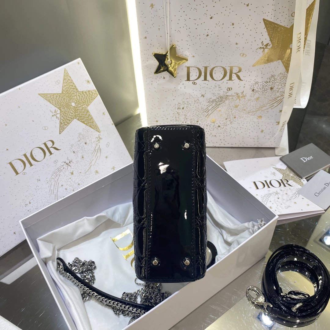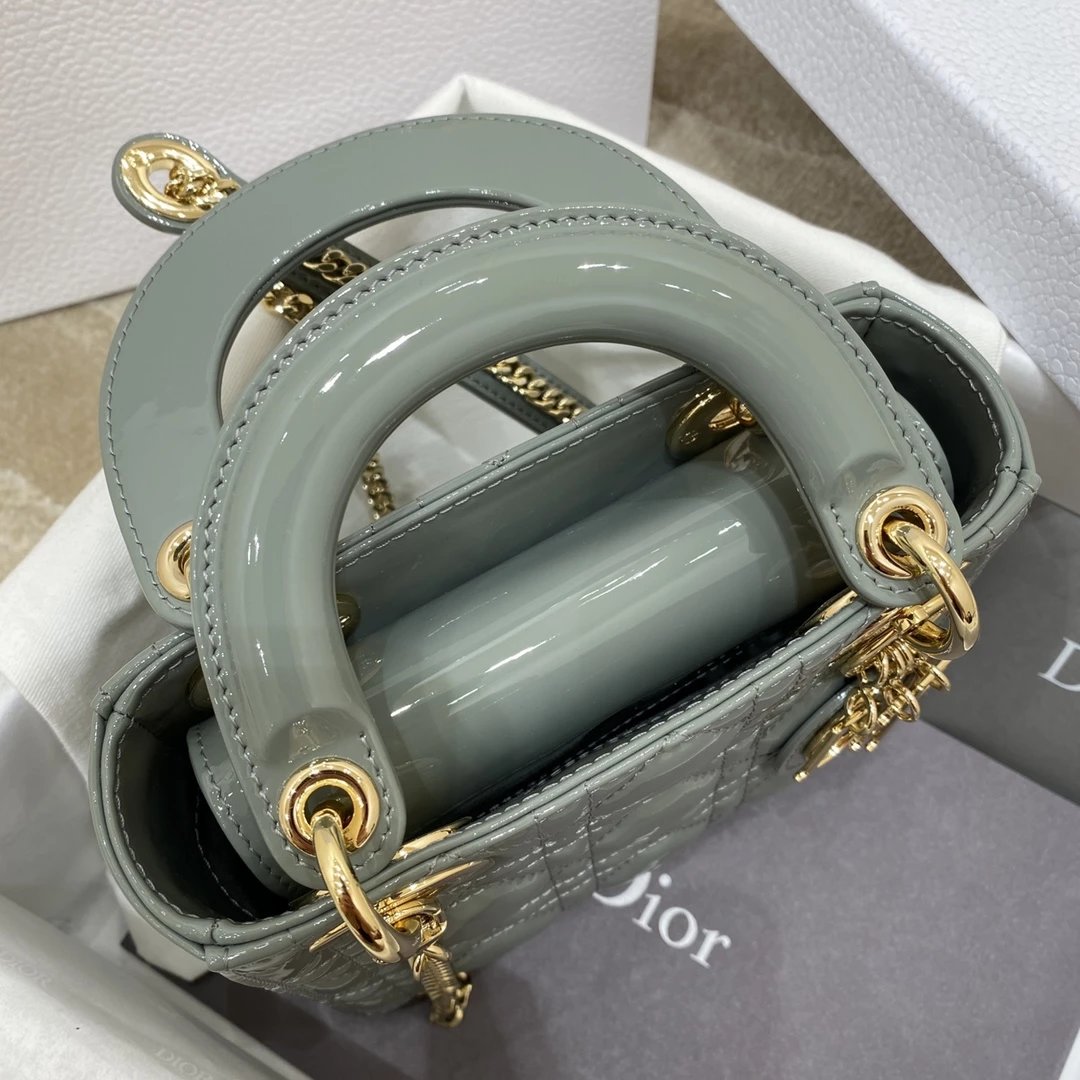 这款 Lady Dior 手袋集中体现了 Dior 对典雅和美丽的深刻洞见。时髦且富有女性魅力,经久不衰却又现代时尚。这款手袋采用漆皮牛皮革精心制作,标志性的经典藤格纹针脚包覆,精良的缝制针法立即突显。标志性“D. I. O. R.”吊饰彰显其轮廓。这款迷你手袋采用可拆卸链条肩带
