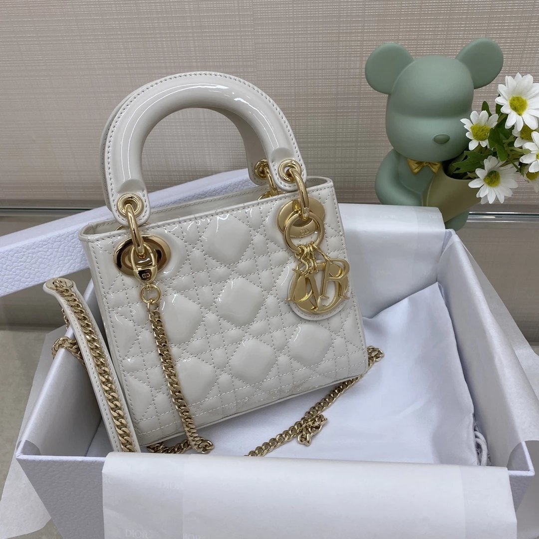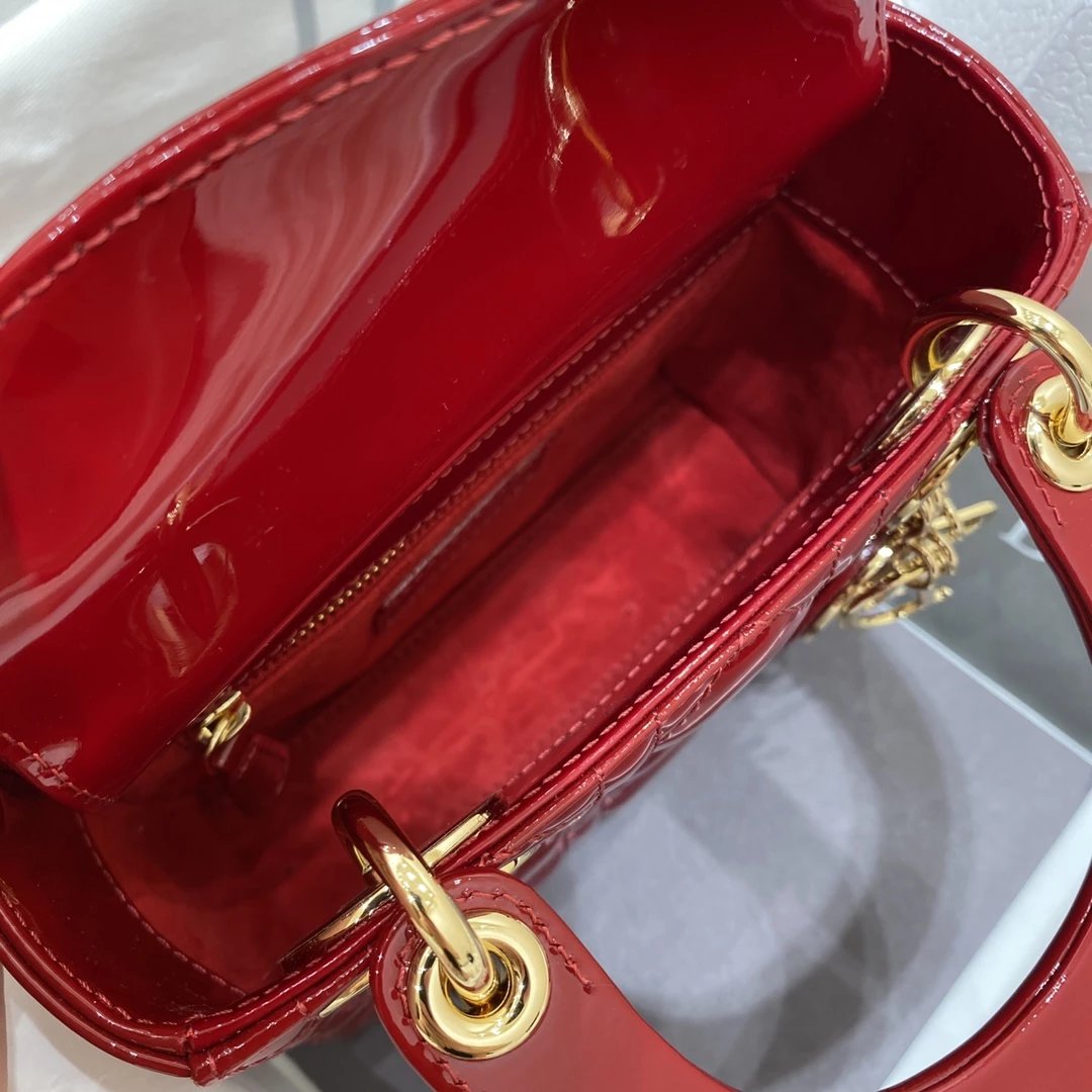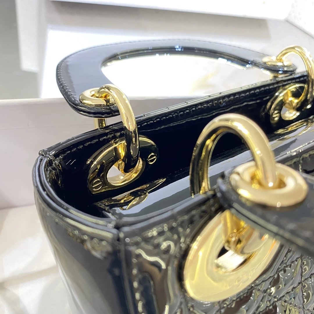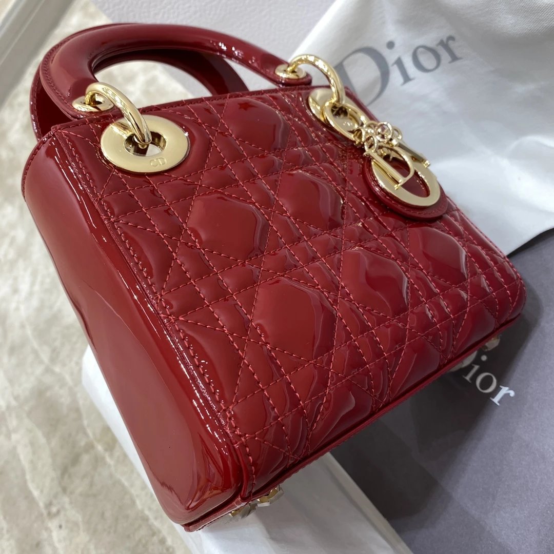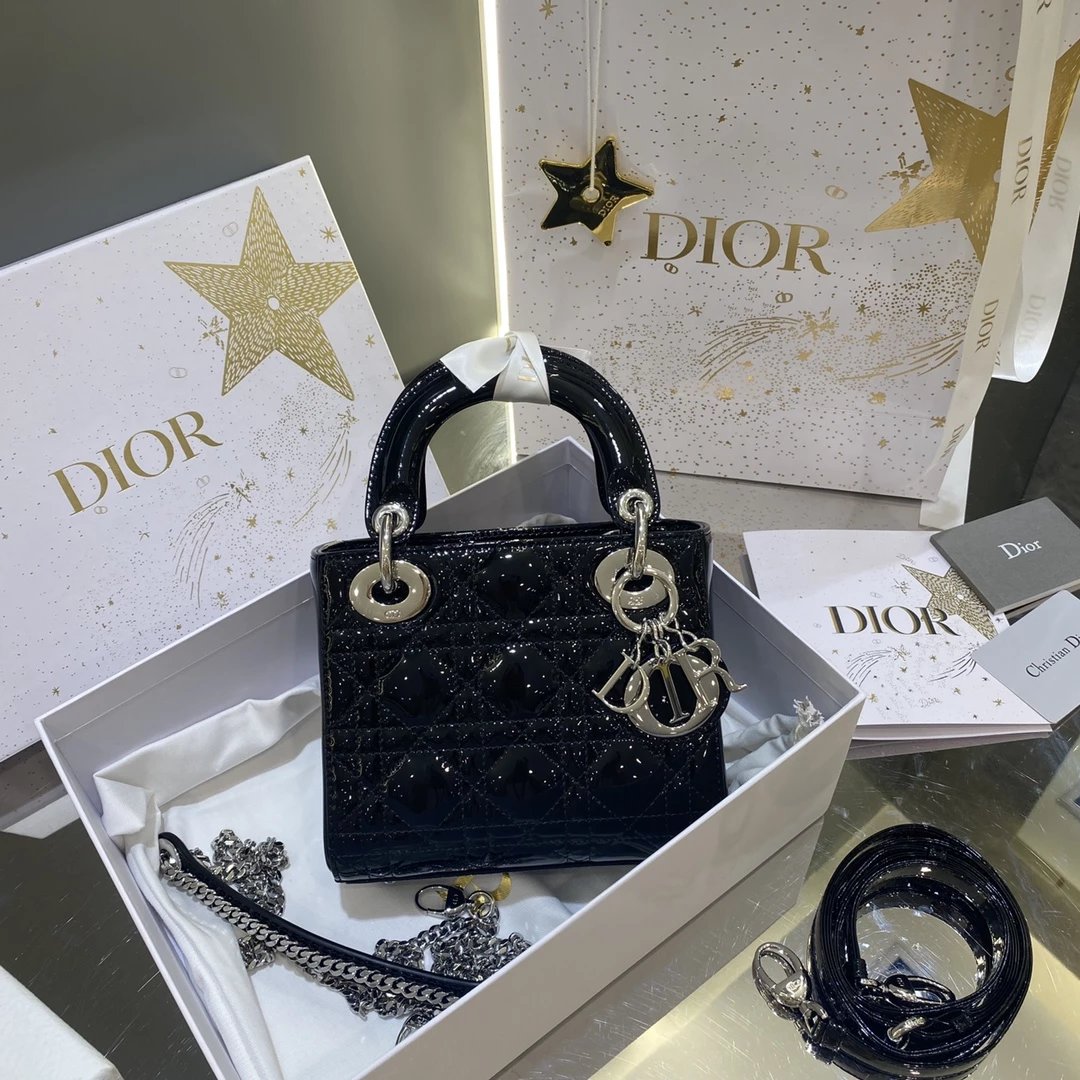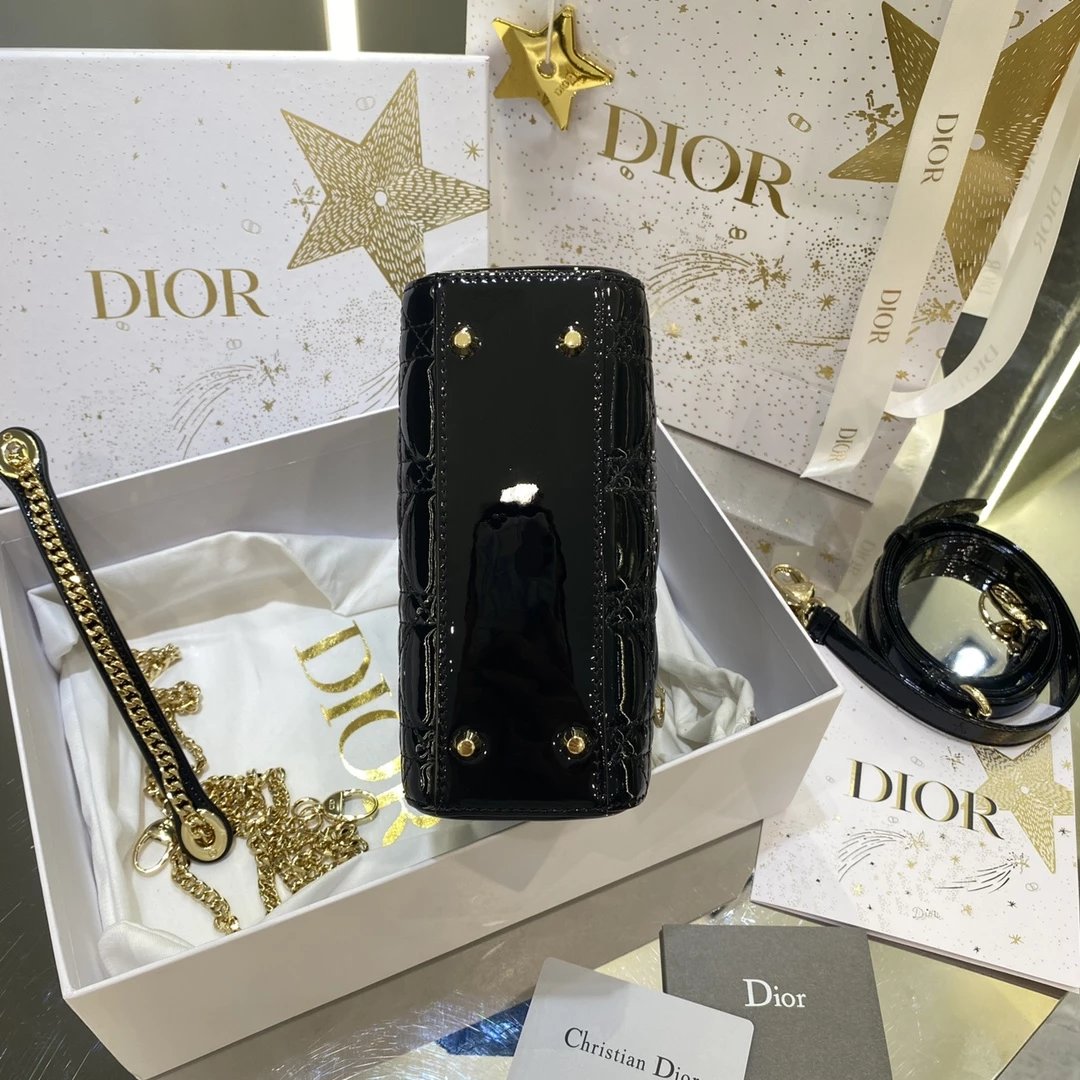 这款 Lady Dior 手袋集中体现了 Dior 对典雅和美丽的深刻洞见。时髦且富有女性魅力,经久不衰却又现代时尚。这款手袋采用漆皮牛皮革精心制作,标志性的经典藤格纹针脚包覆,精良的缝制针法立即突显。标志性“D. I. O. R.”吊饰彰显其轮廓。这款迷你手袋采用可拆卸链条肩带