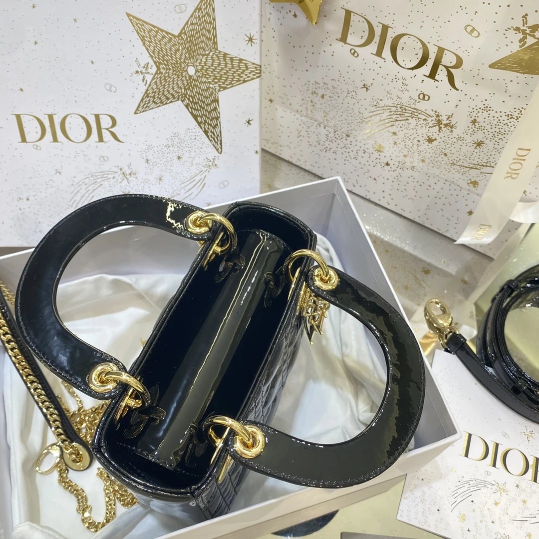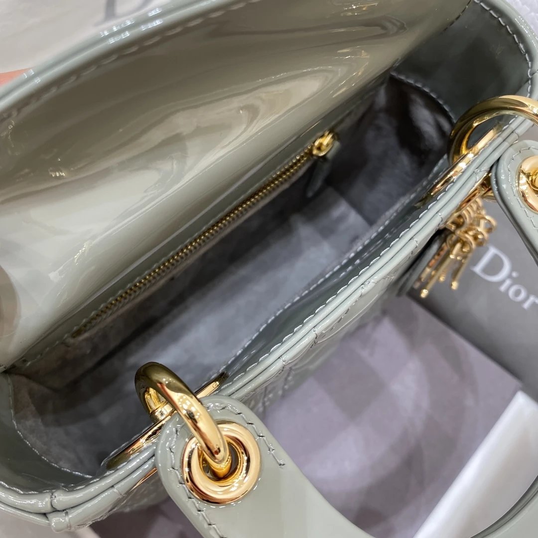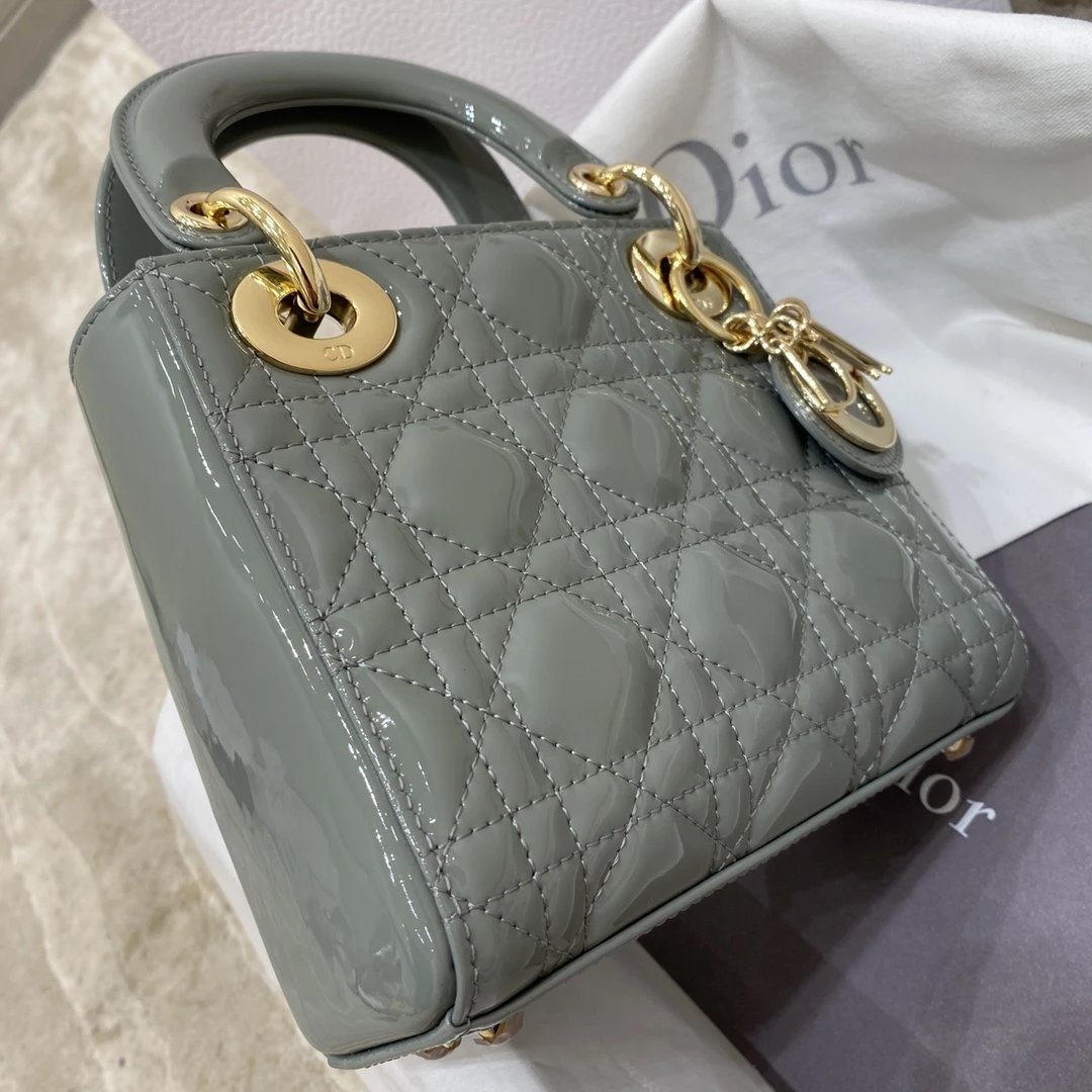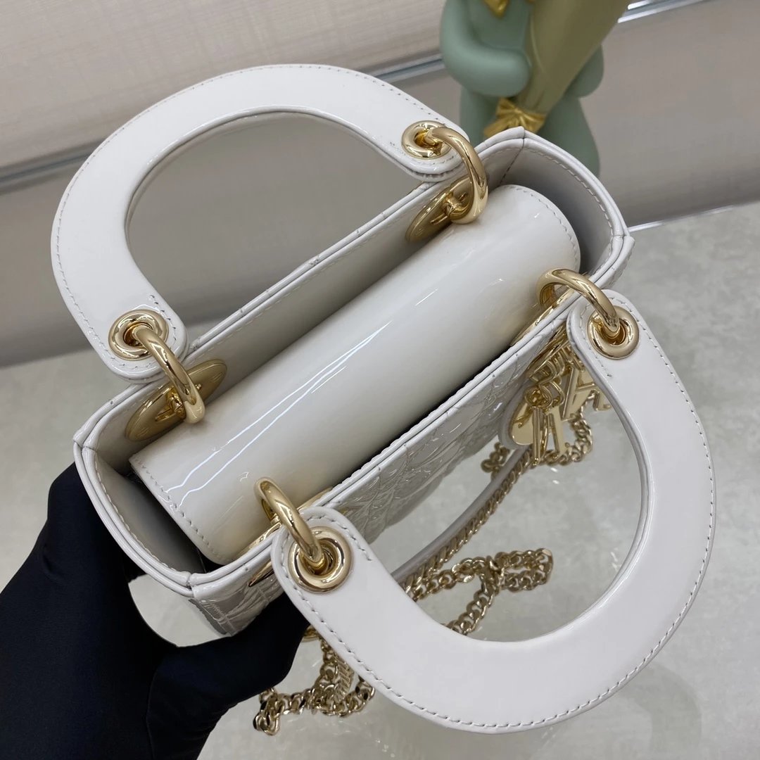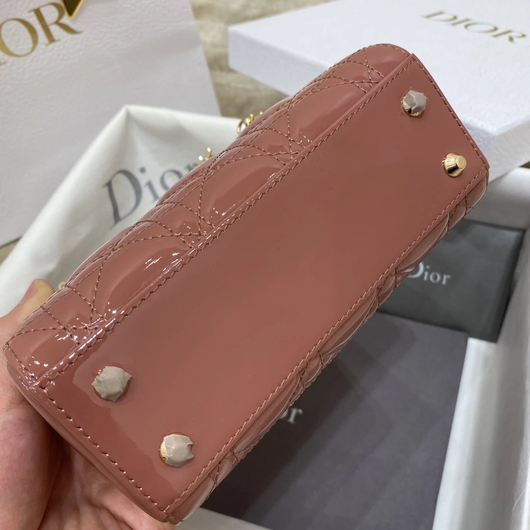 这款 Lady Dior 手袋集中体现了 Dior 对典雅和美丽的深刻洞见。时髦且富有女性魅力,经久不衰却又现代时尚。这款手袋采用漆皮牛皮革精心制作,标志性的经典藤格纹针脚包覆,精良的缝制针法立即突显。标志性“D. I. O. R.”吊饰彰显其轮廓。这款迷你手袋采用可拆卸链条肩带