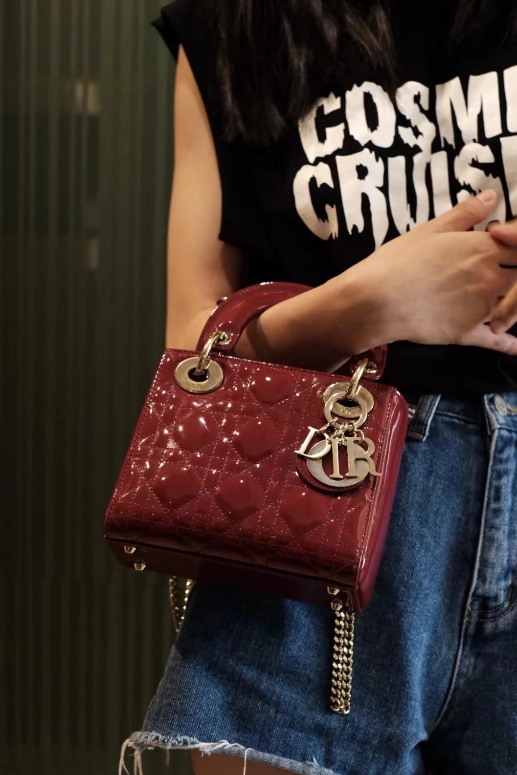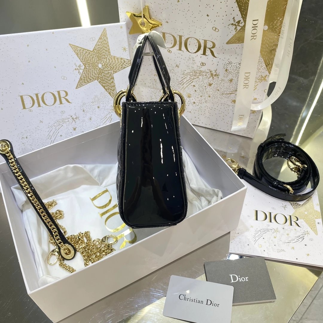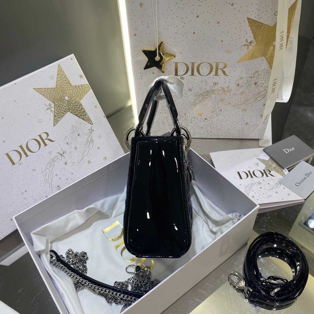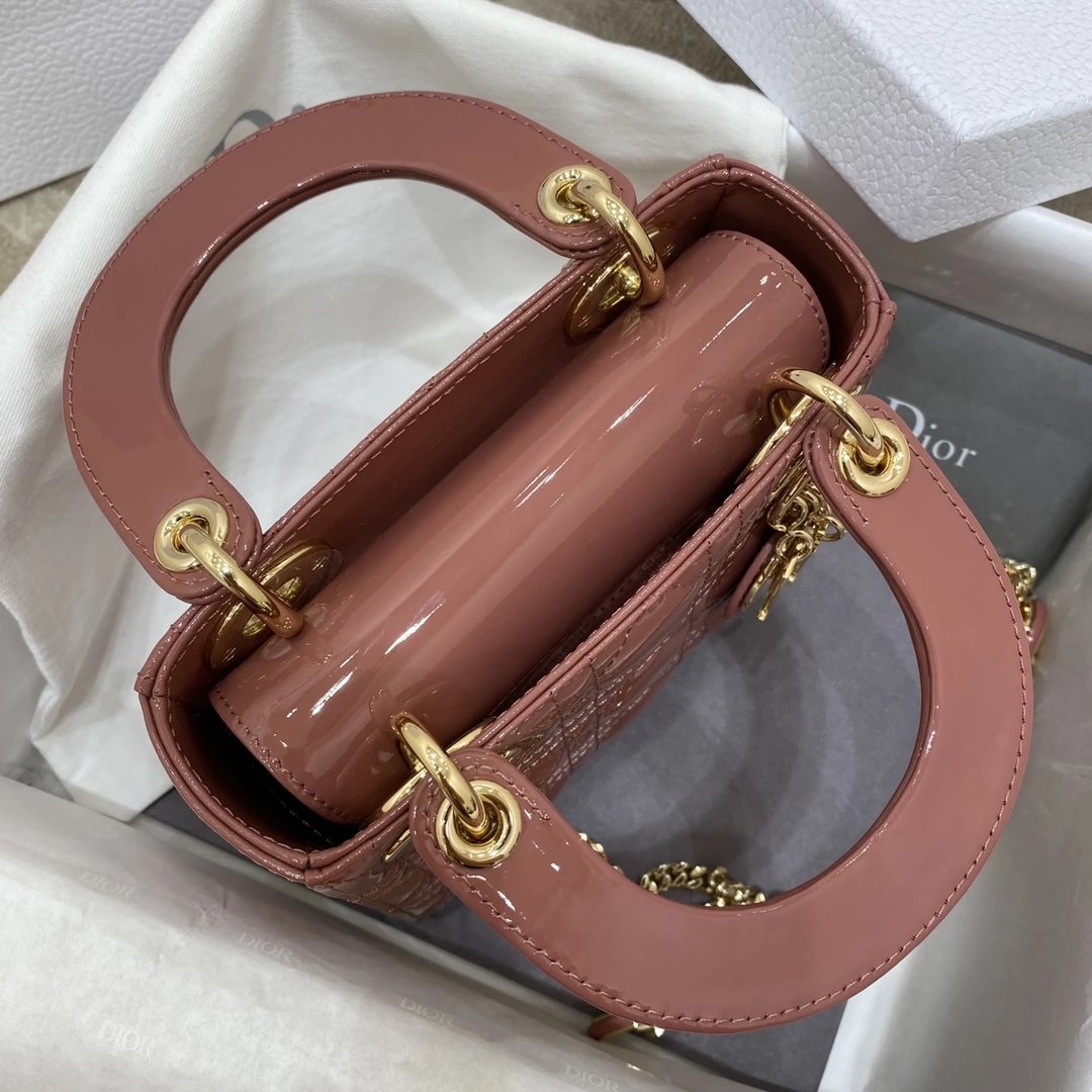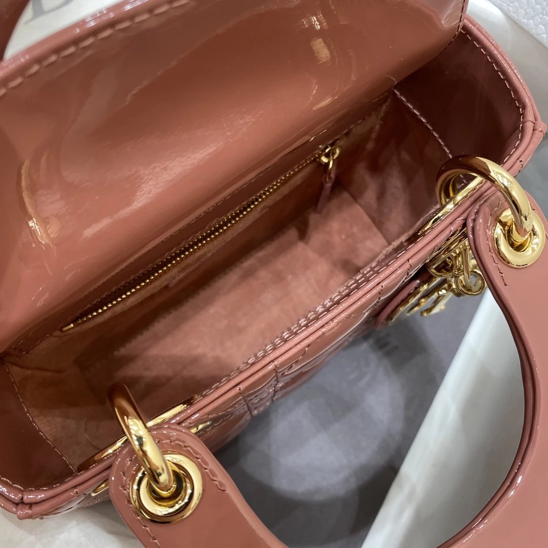 这款 Lady Dior 手袋集中体现了 Dior 对典雅和美丽的深刻洞见。时髦且富有女性魅力,经久不衰却又现代时尚。这款手袋采用漆皮牛皮革精心制作,标志性的经典藤格纹针脚包覆,精良的缝制针法立即突显。标志性“D. I. O. R.”吊饰彰显其轮廓。这款迷你手袋采用可拆卸链条肩带