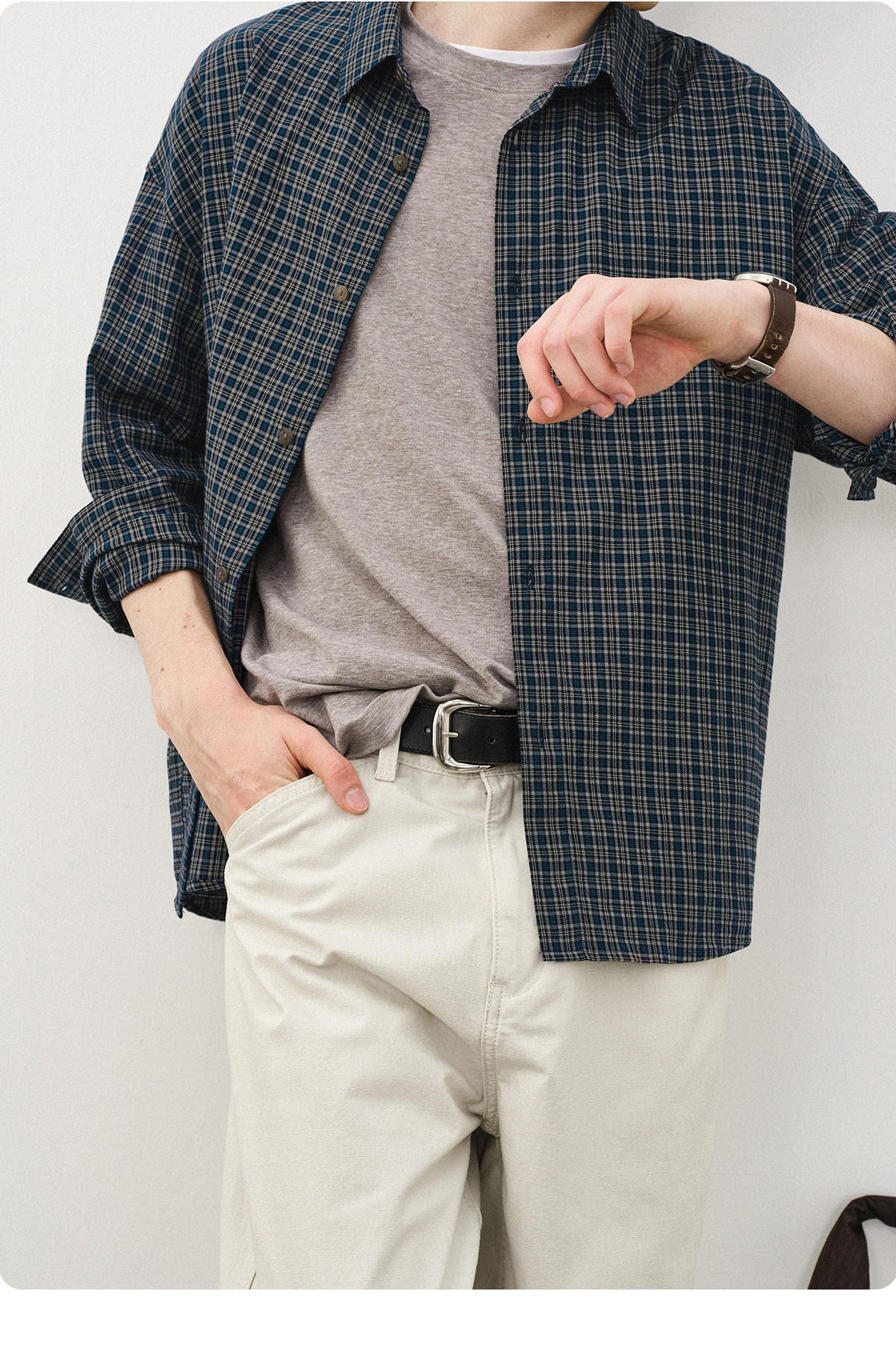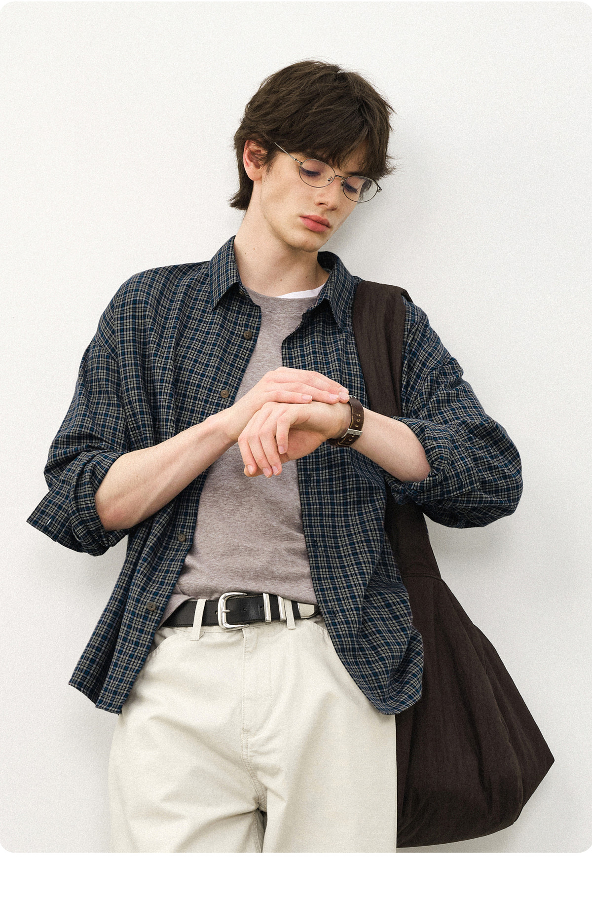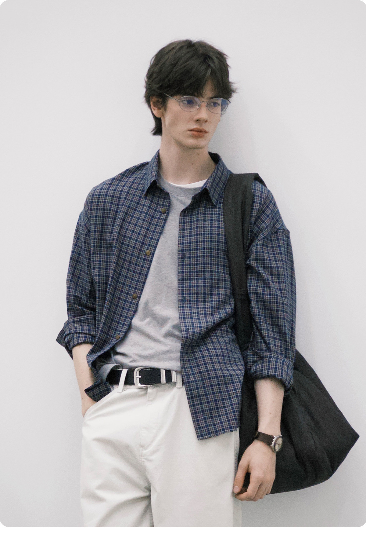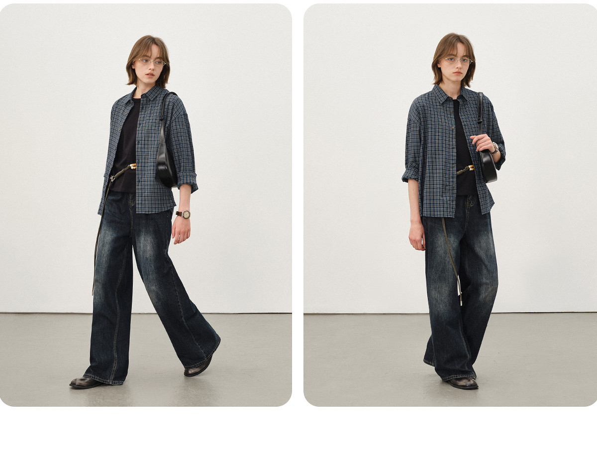 714street美式复古纯棉情侣长袖2025秋季新款miu系蓝色格子衬衫男