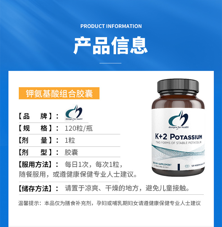 【效期至27年8月】氨基酸降压胶囊 Designs for health K+2 Potassium 120粒/瓶
