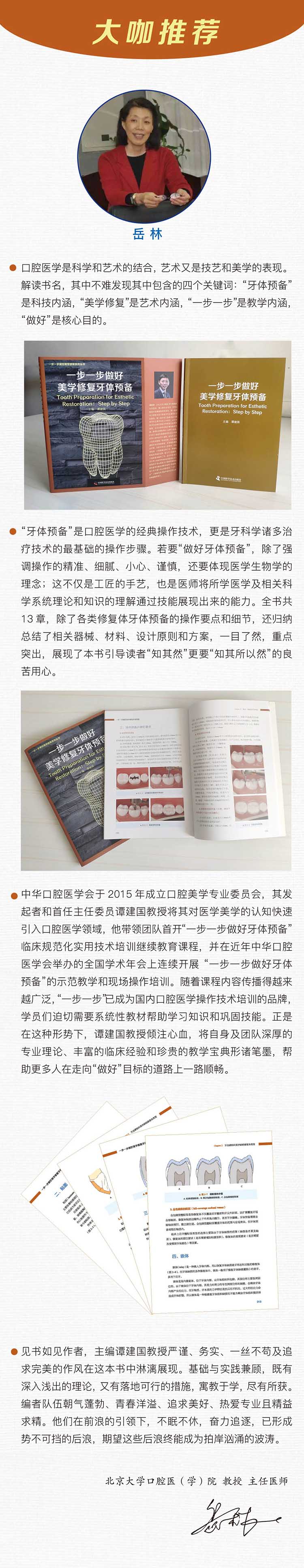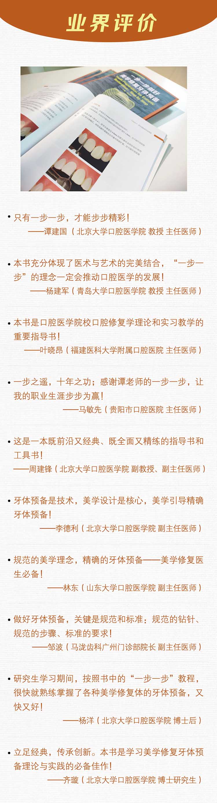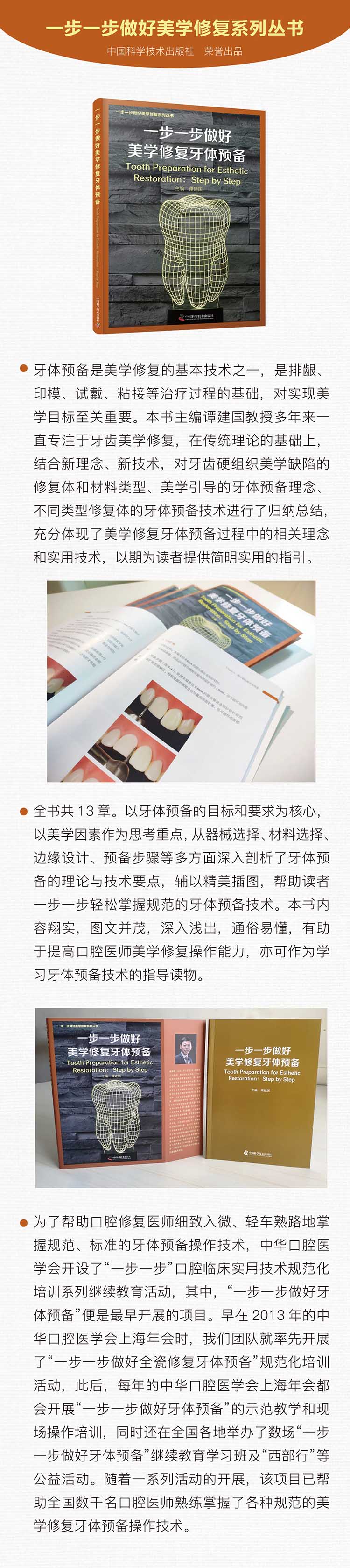 Chapter 1 牙齿硬组织美学缺陷 一、口腔美学缺陷 二、牙齿硬组织美学缺陷 Chapter 2 牙齿硬组织美学缺陷修复体类型 一、全瓷冠 二、贴面 三、 贴面 四、嵌体 五、桩核冠 Chapter 3 牙体预备目的和要求 Chapter 4 美学引导的牙体预备 一、基于美学设计的牙体预备 二、精确牙体预备的实施策略 Chapter 5 牙体预备器械 一、高速手机 二、牙体预备钻针 三、牙体预备辅助器械 Chapter 6 美学修复全瓷材料选择 一、全瓷材料的分类 二、全瓷材料主要性能指标 三、全瓷材料临床适应证 Chapter 7 美学修复体边缘设计 一、修复体边缘的意义 目 录二、龈边缘的设计 三、 面边缘的设计 四、轴面边缘的设计 Chapter 8 前牙全瓷冠牙体预备 一、牙体预备钻针 二、牙体预备量 三、牙体预备步骤和要求 Chapter 9 前牙瓷贴面牙体预备 一、牙体预备钻针 二、牙体预备量 三、牙体预备步骤和要求 Chapter 10 后牙全瓷冠牙体预备 一、牙体预备钻针 二、牙体预备量 三、牙体预备步骤和要求 Chapter 11 嵌体/高嵌体牙体预备 一、牙体预备钻针 二、牙体预备量 三、牙体预备步骤和要求 Chapter 12 后牙 贴面牙体预备 一、牙体预备钻针 二、牙体预备量 三、牙体预备步骤和要求 Chapter 13 前牙纤维桩修复 一、根管预备钻针 二、牙体预备量 三、前牙纤维桩修复步骤和要求 参考文献