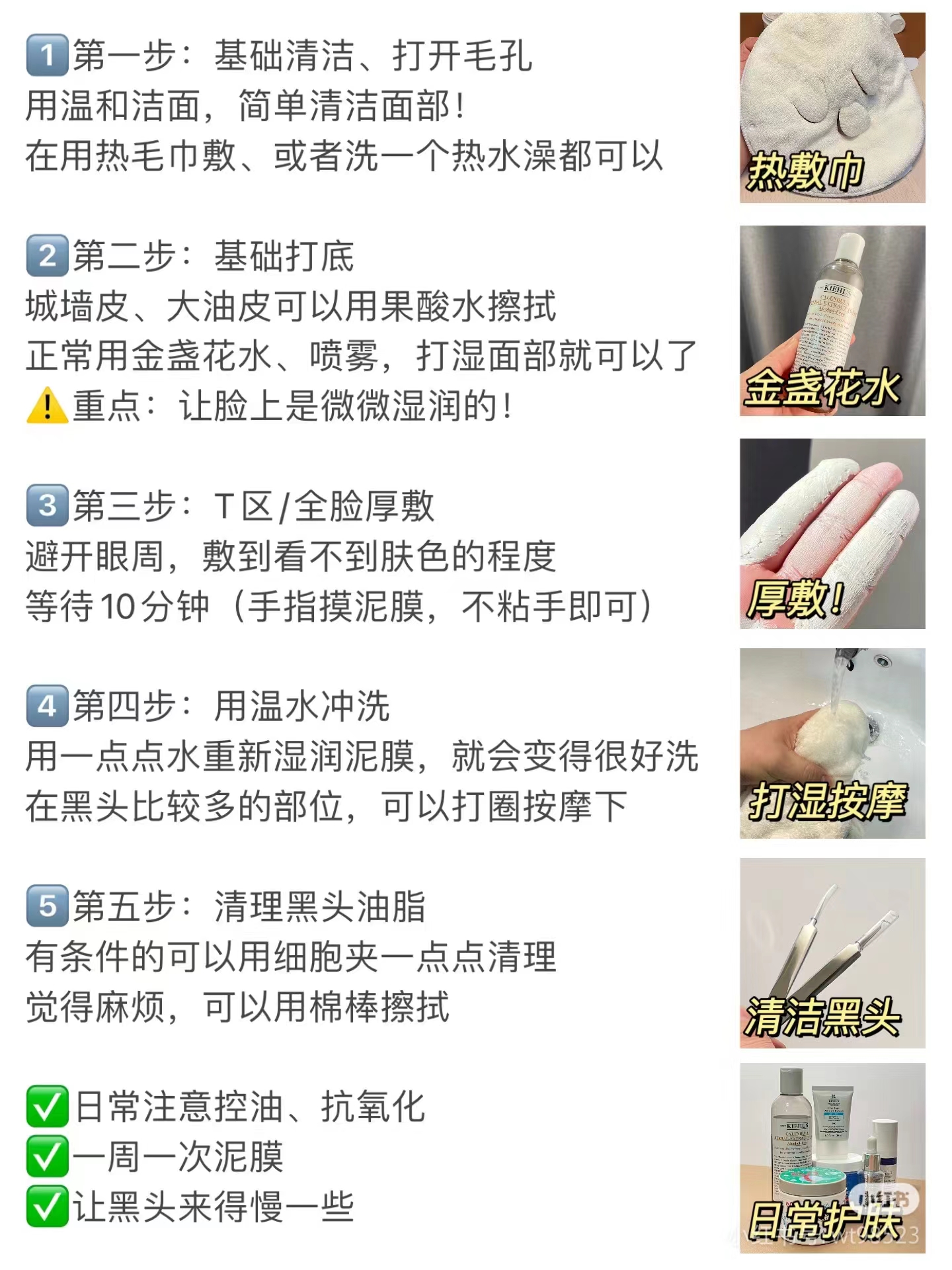 用温水洁面后,喷玫瑰水,(如果有热敷毛巾敷脸2分钟打开毛孔更加)然后再用白泥清洁面膜敷5-8分钟。