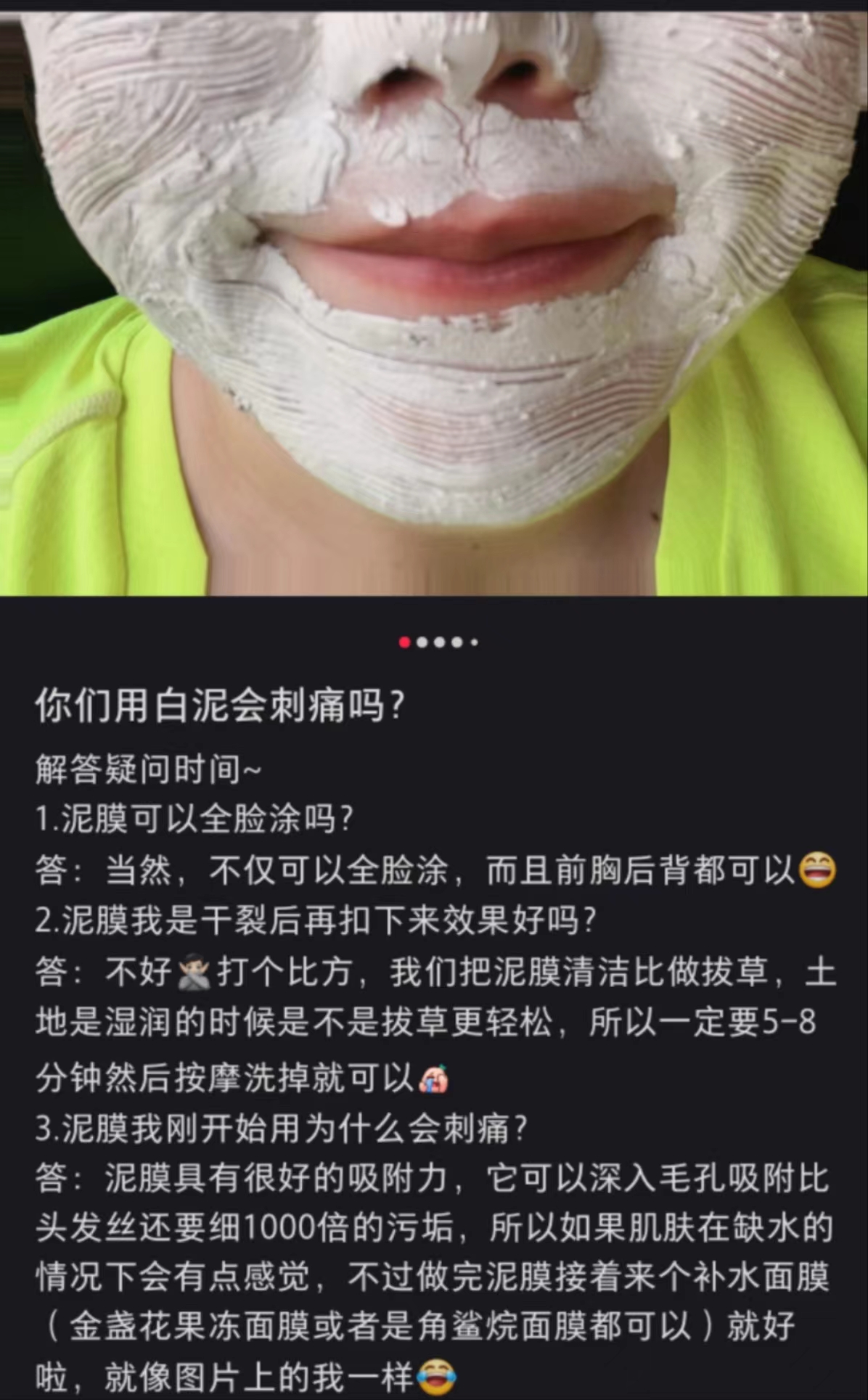 皮肤处于缺水状态用泥膜会有些刺刺感觉~因为白泥在吸拾毛孔里的残留污垢。干皮在敷泥膜前一定热敷3-5分钟,打底保湿水再敷泥膜做到补水下清洁脸部。油皮就简单,温水洗脸,保湿水打底即可敷泥膜。