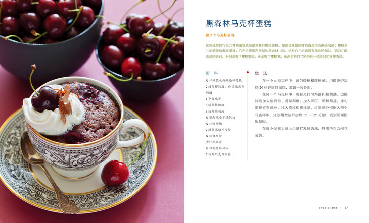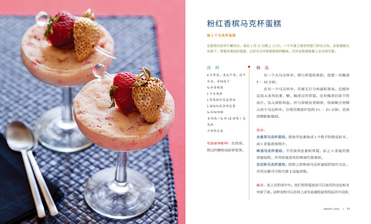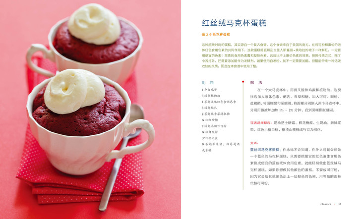 从最基本的酪乳蛋糕,到高大上的巧克力焦糖盐之花蛋糕,这里应有尽有。让孩子们尝尝烤棉花糖巧克力蛋糕和汽水冰淇淋蛋糕的美味吧,在他们上床睡觉后,再试试“成年人的专享”一章中的食谱,那些蛋糕中特别添加了美酒佳酿。对于那些有特殊饮食需求的蛋糕爱好者,书中也有专门的食谱。书中还提供了一些其他的甜点食谱,比如马克杯布丁、马克杯派和马克杯塔,在你想换个口味的时候不妨试试。