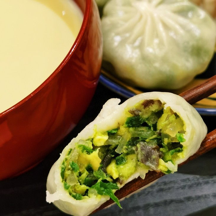 翡翠素包的吃法很简单哦!不用解冻,水开后蒸8-10分钟即可,不能蒸太久,不然包子皮就没那么筋道了,内馅的蔬菜可能也会老。刚蒸好的翡翠素包,边沿齐整,晶莹剔透,内馅的翠绿,真的就像翡翠一般。一口咬下去,满满的鲜味,这种鲜跟肉是完全不同的,是自然的清鲜。韭菜香味很浓郁,香菇嫩滑可口,木耳和萝卜脆爽,鸡蛋柔嫩,红薯粉Q弹,皮薄馅足,简直人间美味!谁说素包子就不如肉包子了呢!