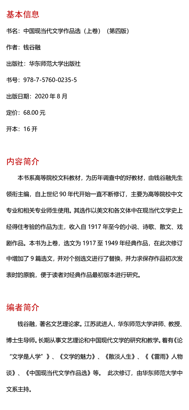 中国现当代文学作品选 上下卷 第四版 钱谷融主编 高校中文专业教材 研习中国现当代文学史配套图书 正版 华东师范大学出版社