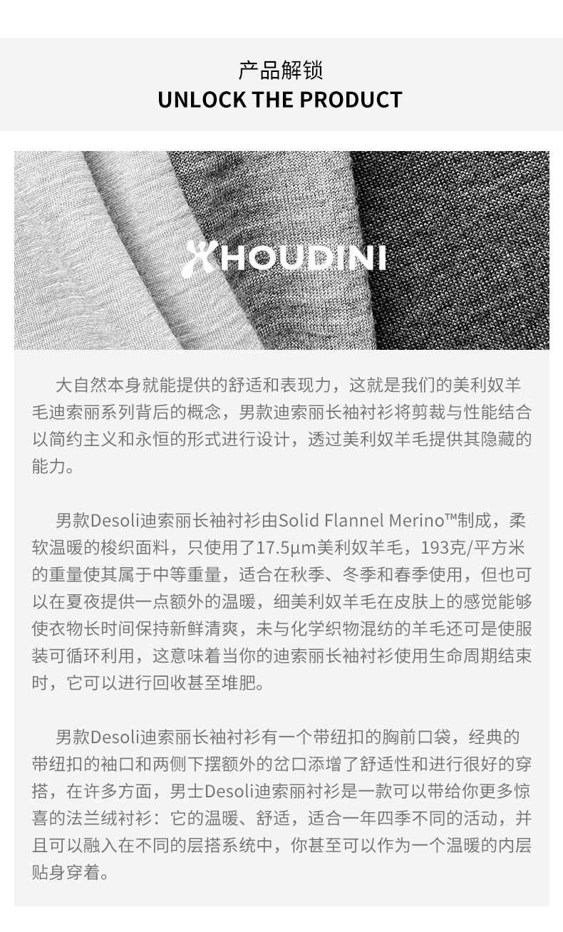 HOUDINI胡丁尼 Desoli Shirtdi 迪索丽 男款美利奴羊毛长袖衬衫820009