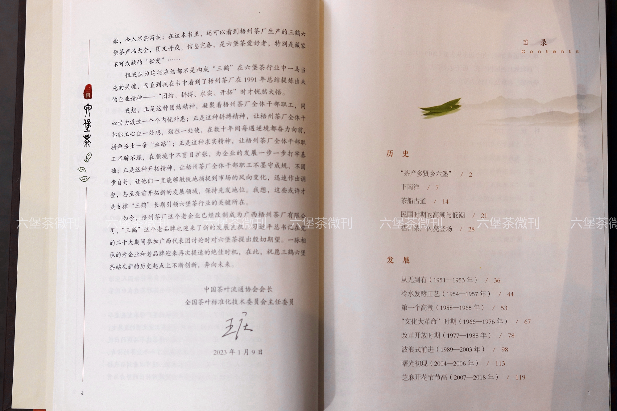 在这本书里,还可以看到梧州茶厂传承发展至今七十年所走过的道路,看到六堡茶工业文明的发展史;在这本书里,还可以看到三鹤六堡茶这个品牌的出现与成长——一个美丽的误会成就了一个业界的传奇,读来令人莞尔一笑;在这本书里,还可以看到历代梧州茶厂干部职工为梧州茶产业发展所付出的努力与贡献,令人不禁肃然;在这本书里,还可以看到梧州茶厂生产的三鹤六堡茶产品大全,图文并茂,信息完备,是六堡茶爱好者,特别是藏家不可或的缺的”秘籍”…….
